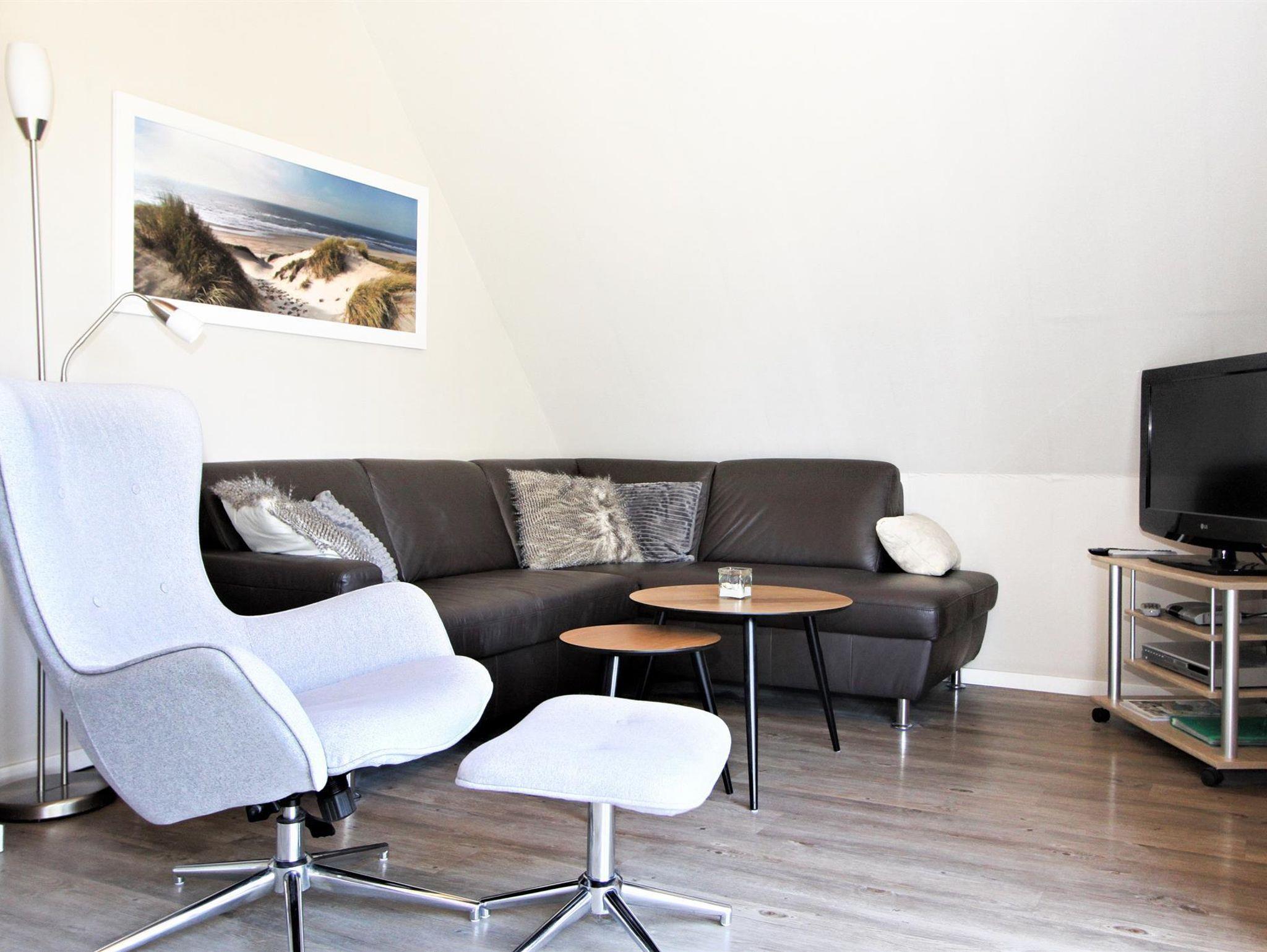 Die 60 qm große und im Jahr 2021 komplett renovierte Wohnung sân bietet Platz für 4 Personen. In der im Obergeschoss des Hauses Flut liegenden geschmackvoll eingerichteten Wohnung erwarten Sie ein Wohnzimmer mit Essplatz, Garnitur, Liegesessel, SAT Flachbildschirm, DVD-Player, Hifi Anlage und eine separate Küche mit Geschirrspülmaschine, etc.