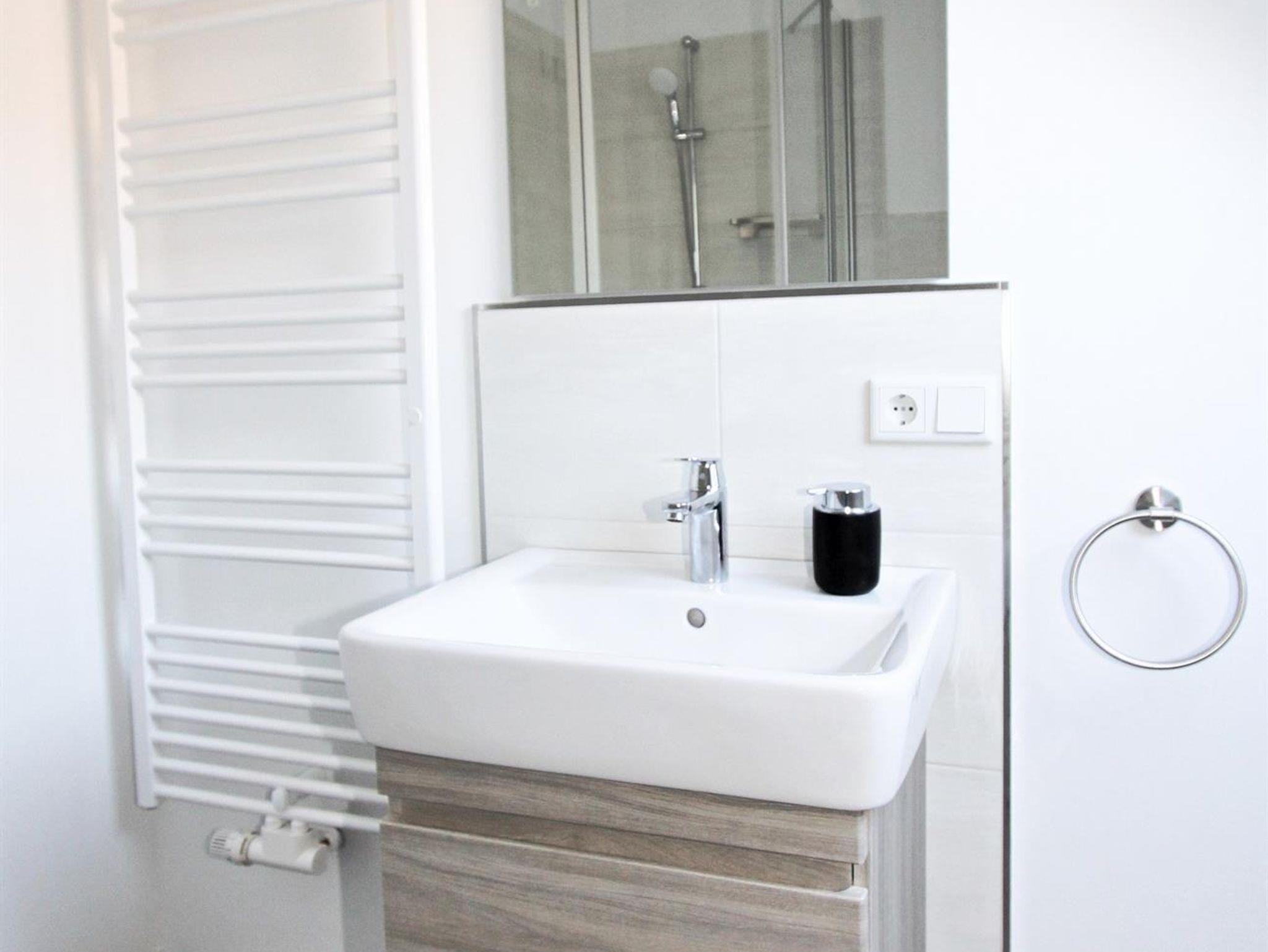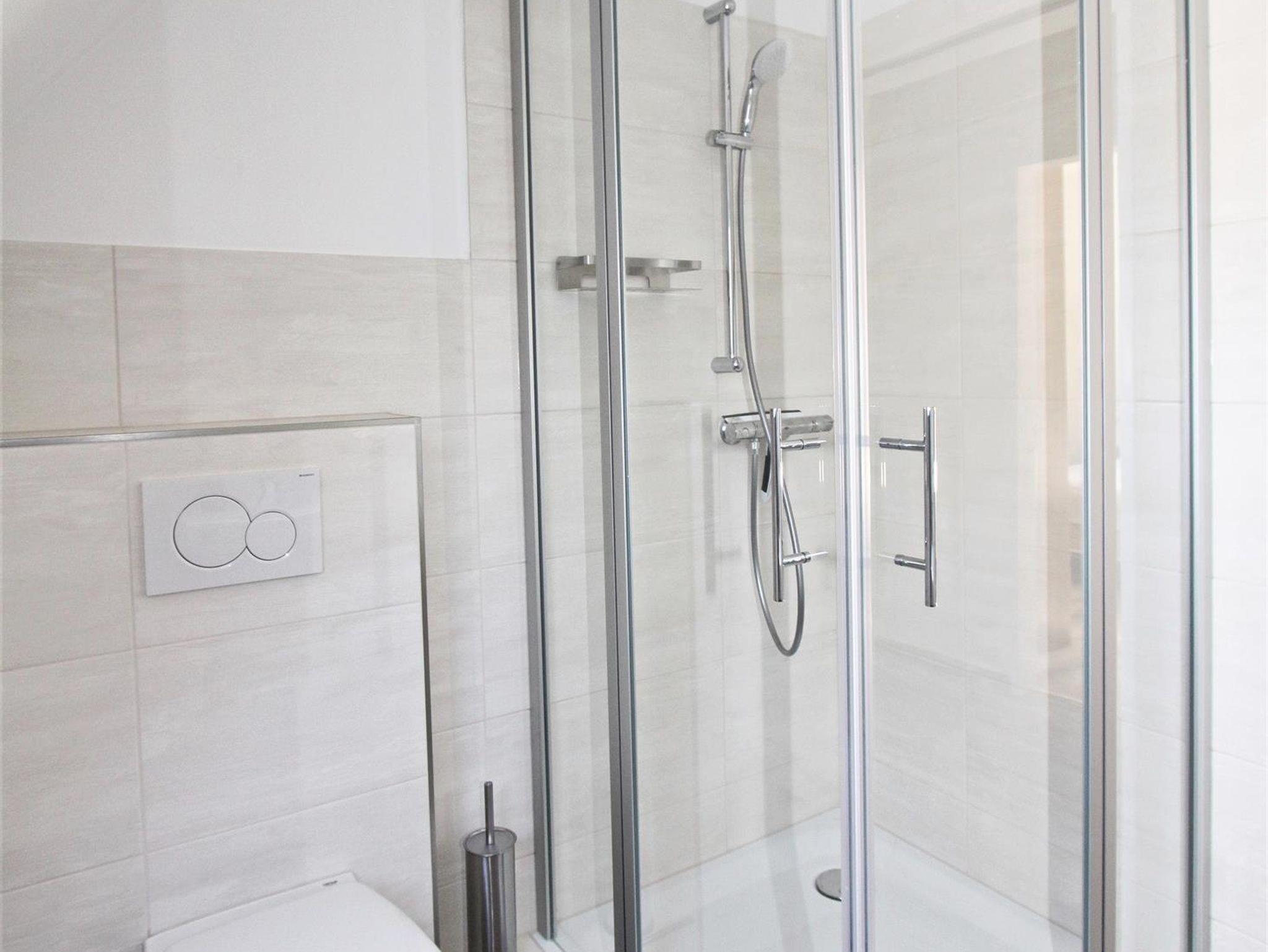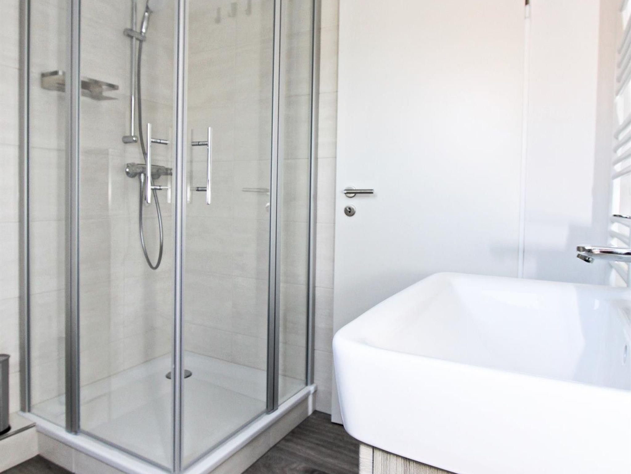 Das 2021 vollständig modernisierte Badezimmer ist ausgestattet mit Dusche, Handtuchheizkörper, Waschtisch und WC.