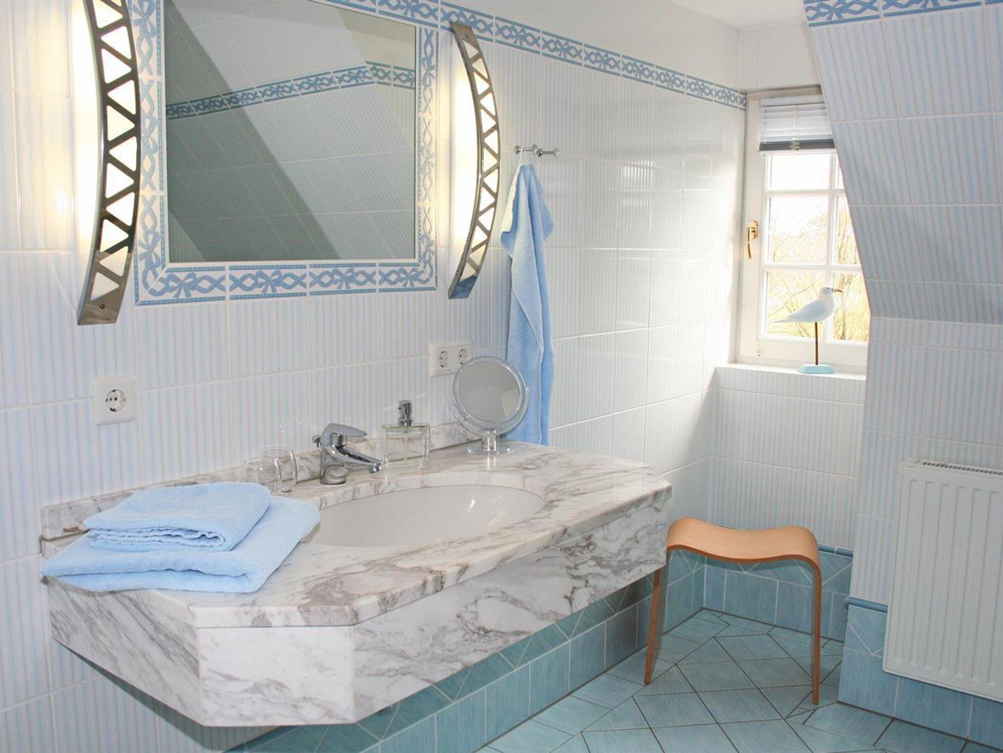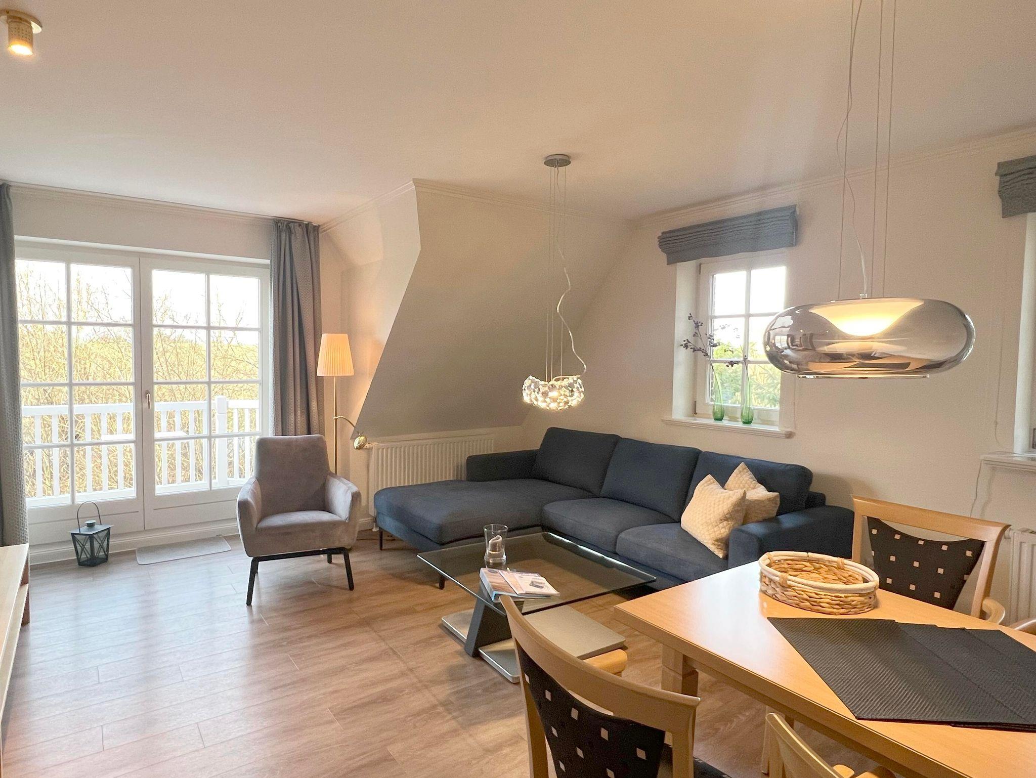 Eingangsbereich, Eingangsdiele mit Garderobe, großzügiger Wohn-Essbereich mit direktem Zugang auf einen Balkon mit Gartenmöbeln, zusätzlich im Dünengelände eine große, durch Friesenwälle und Gehölze abgeschirmte Terrasse mit Gartenmöbeln und einem Strandkorb. Zwei Schlafzimmer mit Doppelbetten, zwei Duschbäder/WC. Separate Küche. Im Untergeschoss befindet sich eine Gemeinschaftssauna (Ruheraum, verschiedene Duschen, Fußbäder), Fitnessraum, Tischtennis. Im Außenbereich: ein Spielplatz für die Kleinsten, Stellplatz, Fahrradständer.