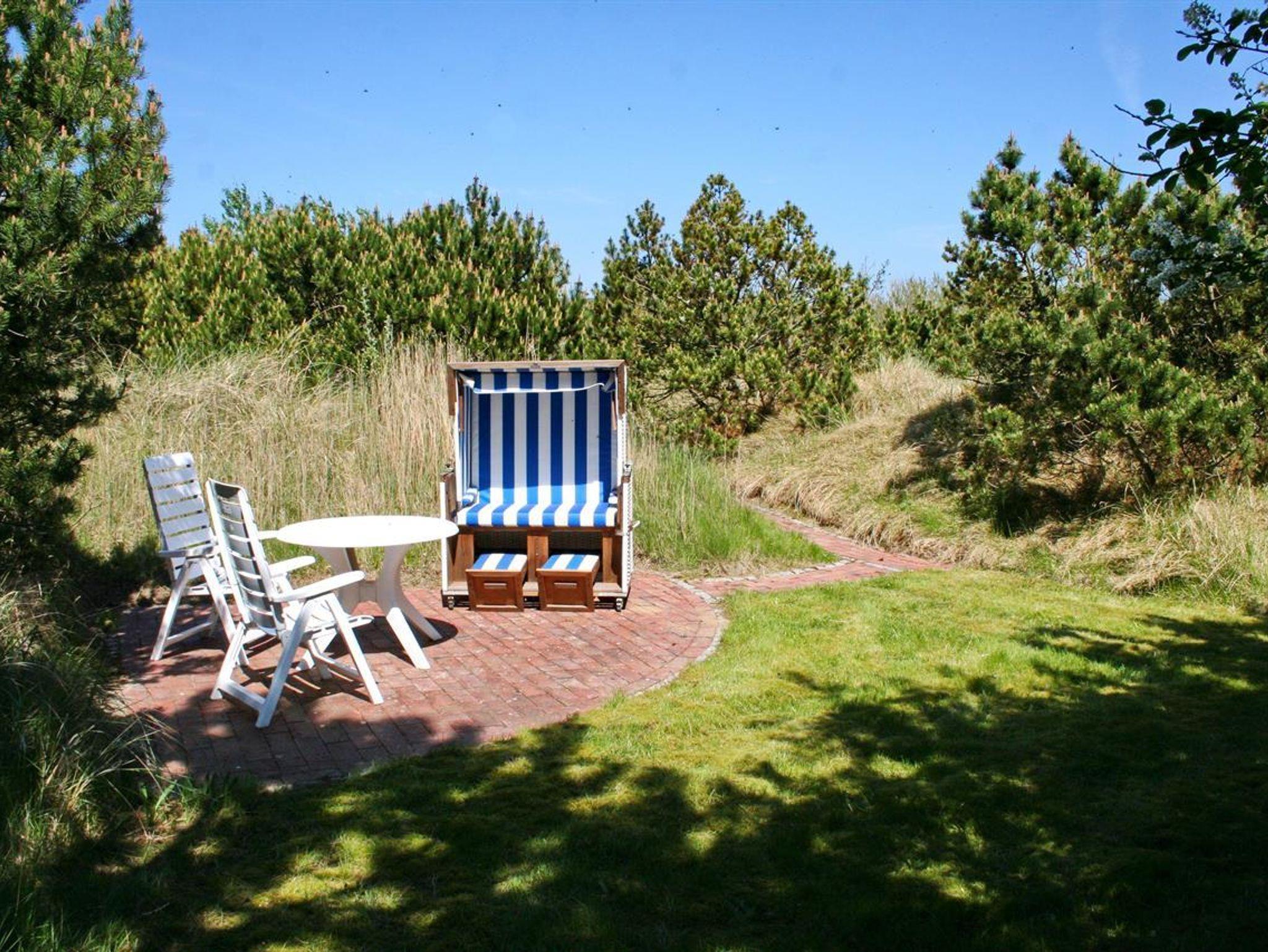 • Terrasse mit Gartenmöbeln und Strandkorb im Gartengelände umsäumt von Dünen.