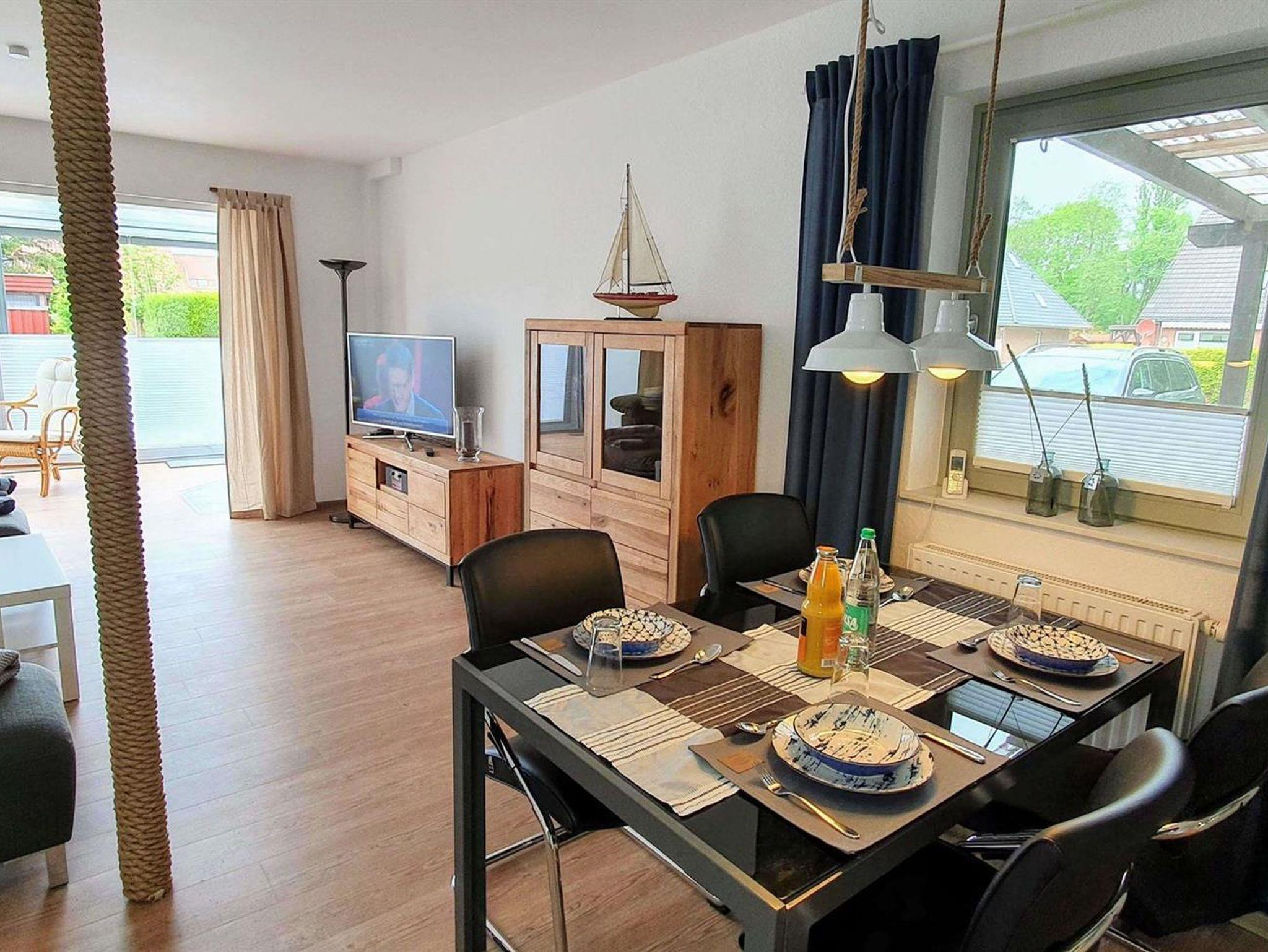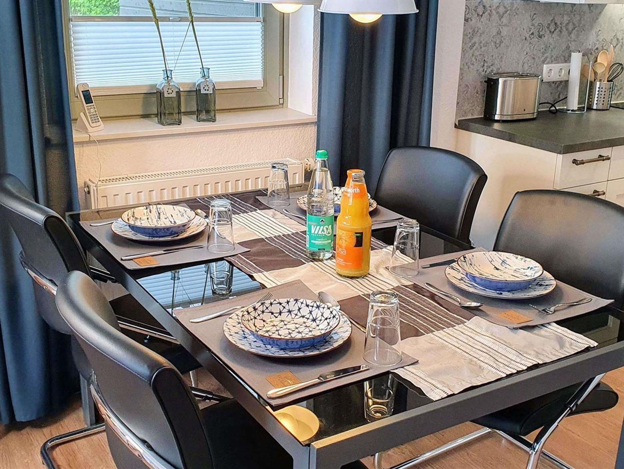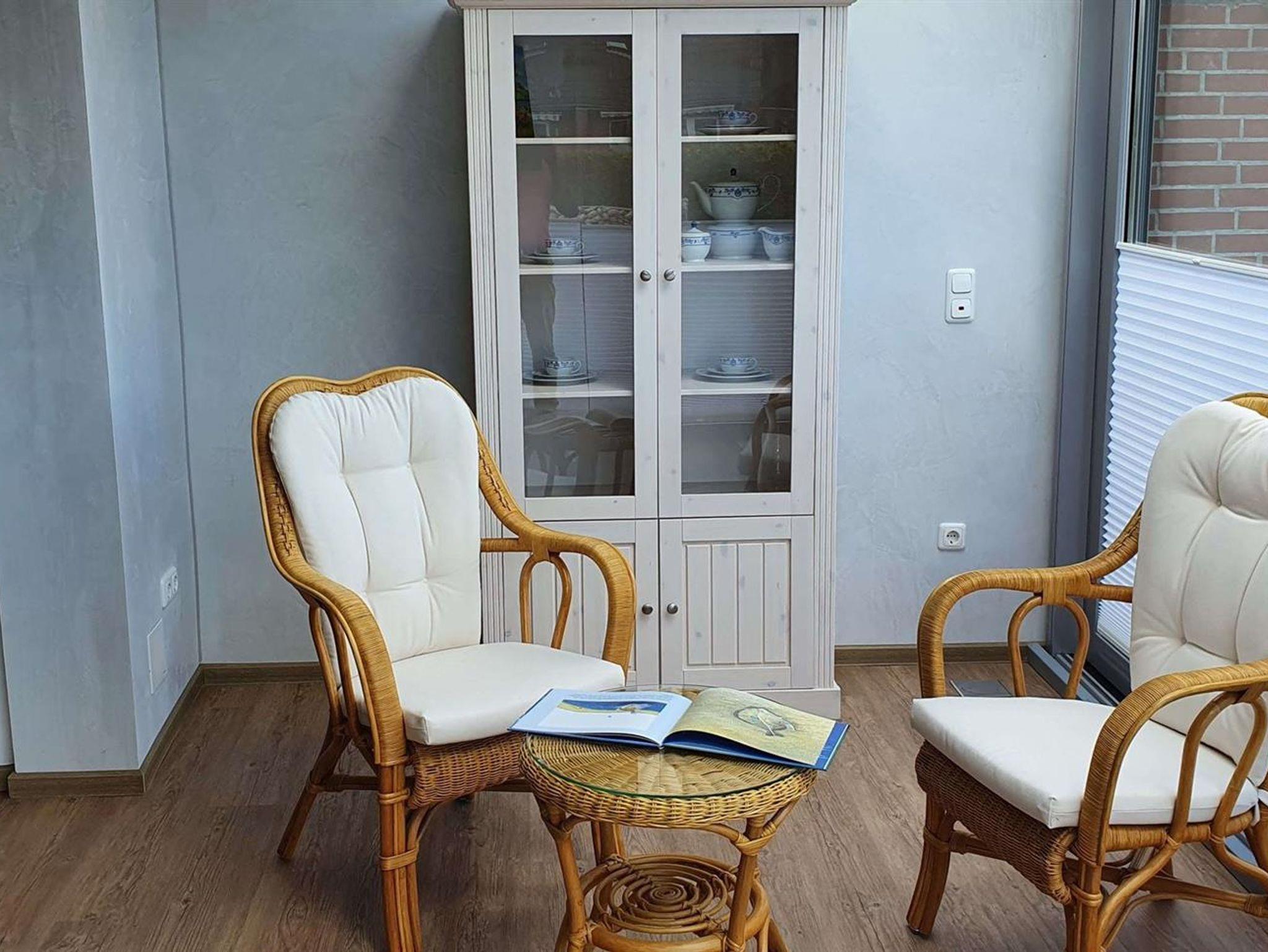 Wohnzimmer mit elektrisch verstellbarer Couch, TV mit WLAN, Internetradio mit CD + USB, Freies WLAN, direkter Zugang zur windgeschützten, möblierten Gartenterrasse nach Südwesten. Offene Küche mit Backofen, Mikrowelle, Kühlschrank mit Gefrierfach und Geschirrspüler.
