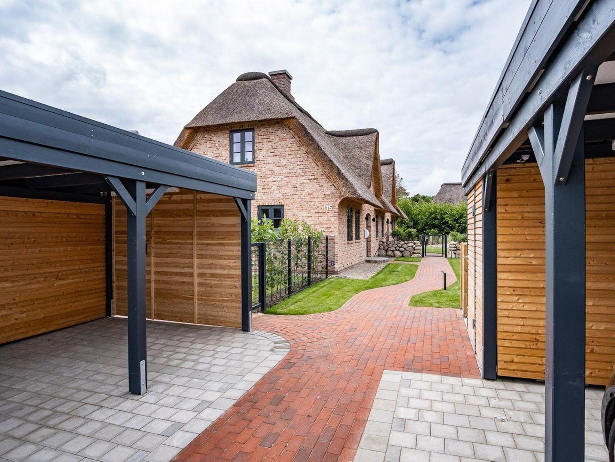 Das Grundstück mit Stellplatz, Carport, Rasenfläche und einer großzügigen geschützten, sonnigen Terrasse, inklusive edlen Gartenmöbeln ist mit heimischen Pflanzen und einem Friesenwall mit Dünengras angelegt.