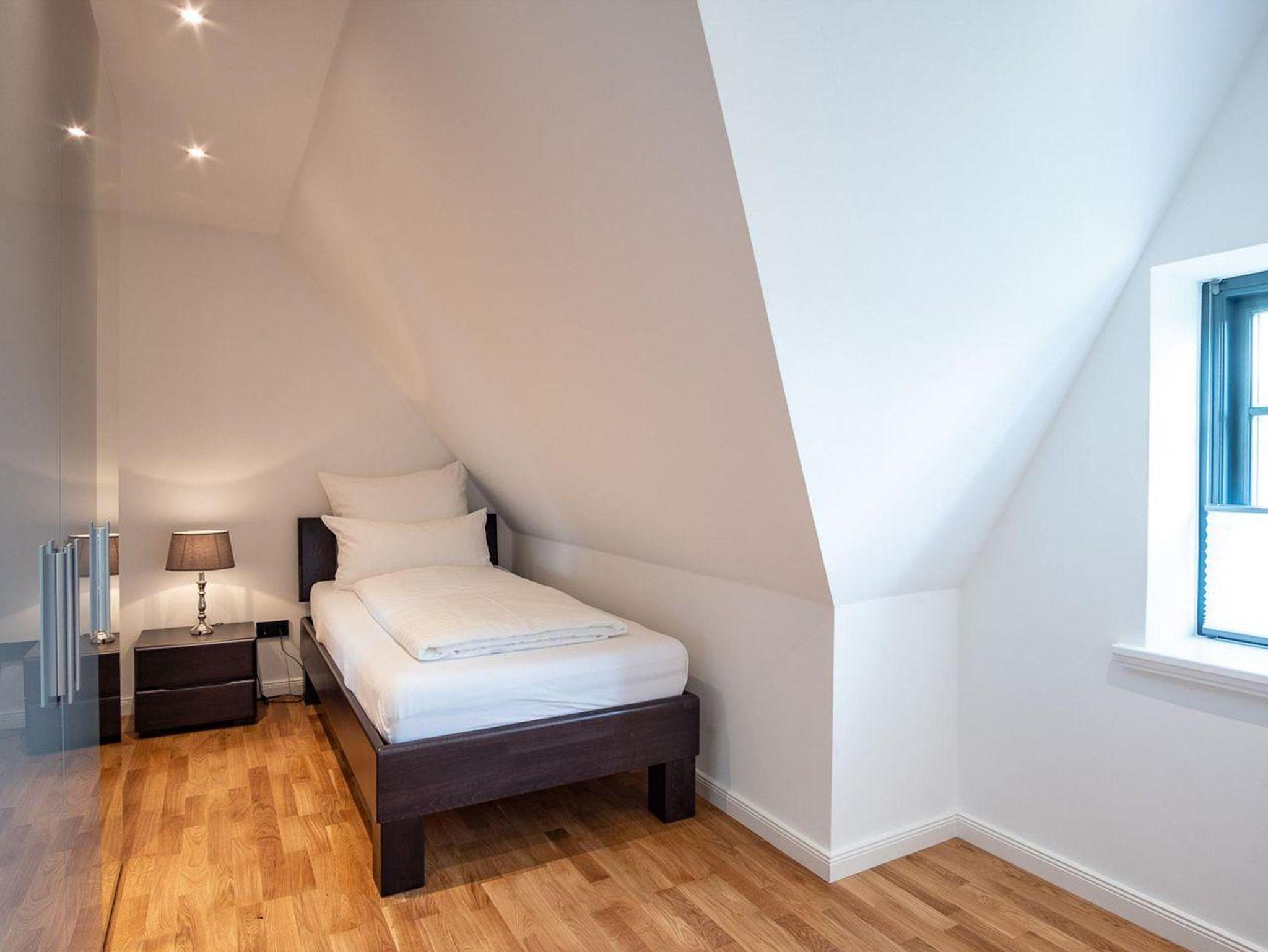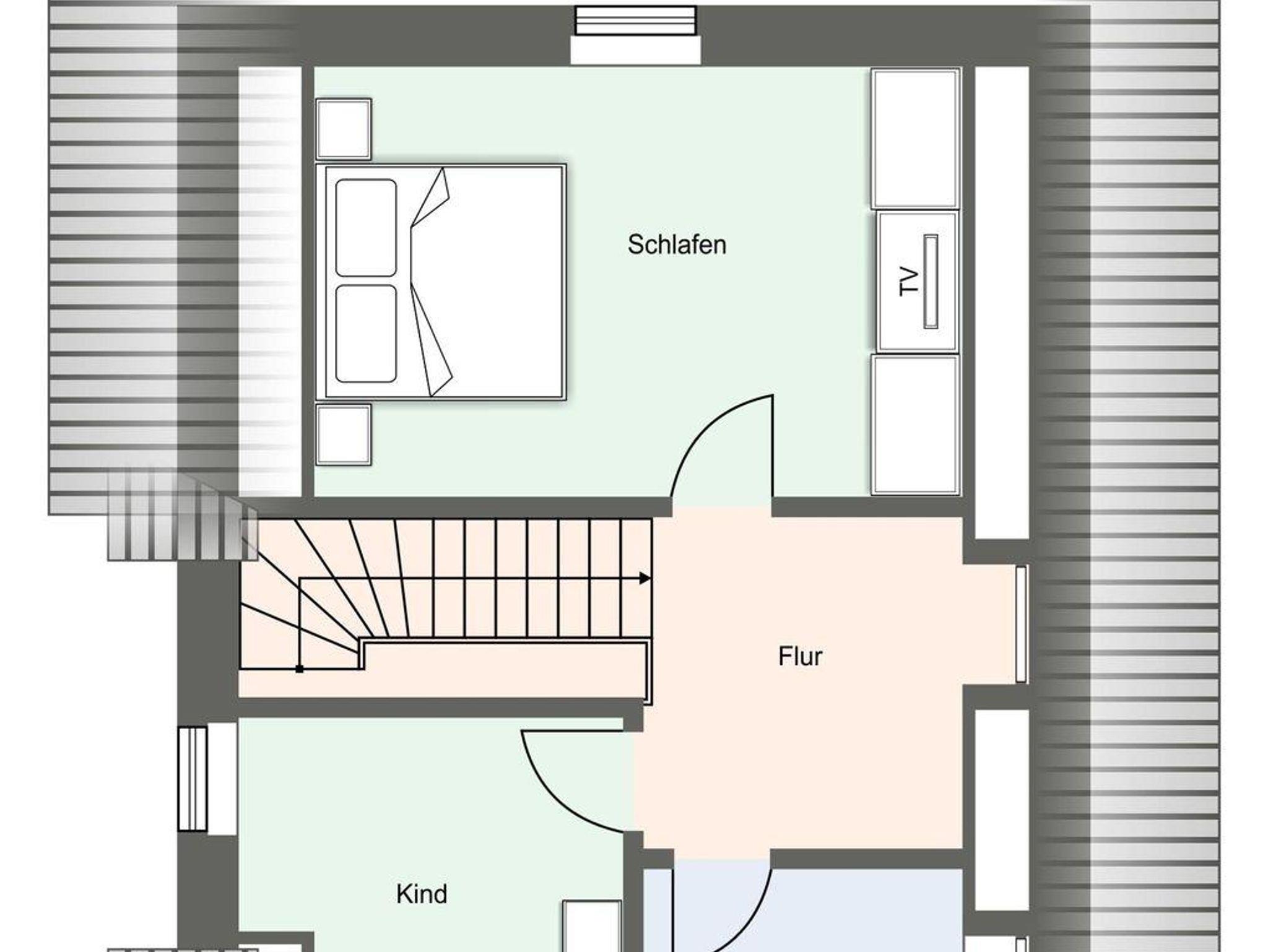 Über eine Holztreppe gelangt man in das Obergeschoss. Die beiden Schlafzimmer, eines mit Doppelbett und TV und das andere mit 1 Einzelbett, bieten ruhevolle Erholung.