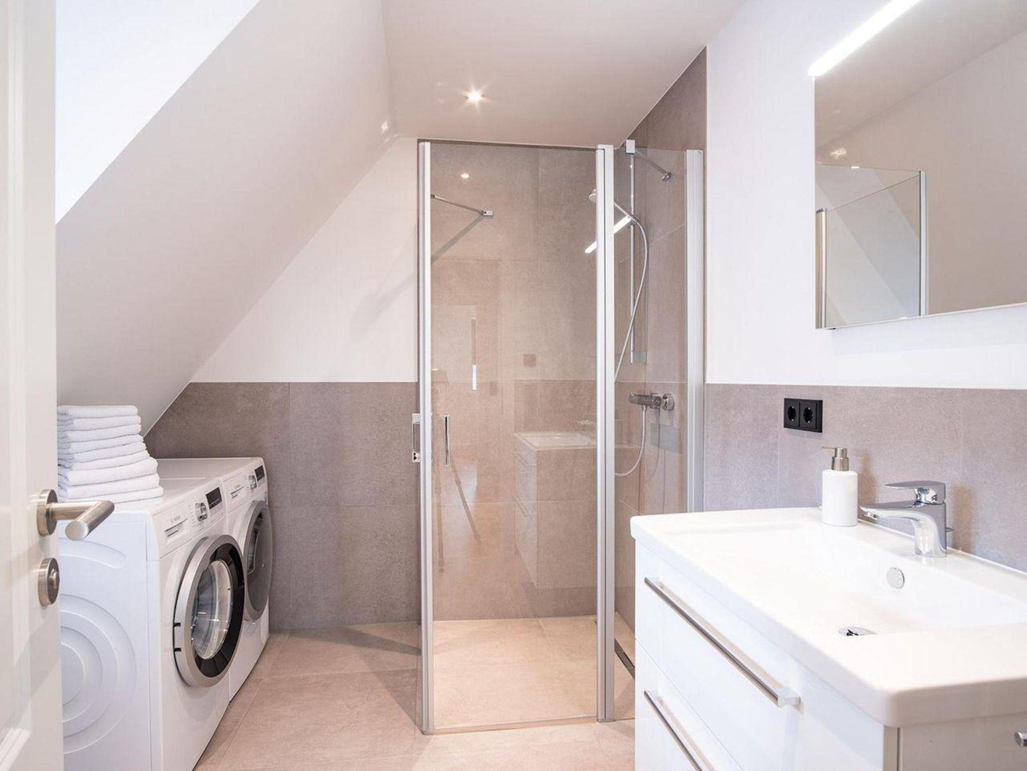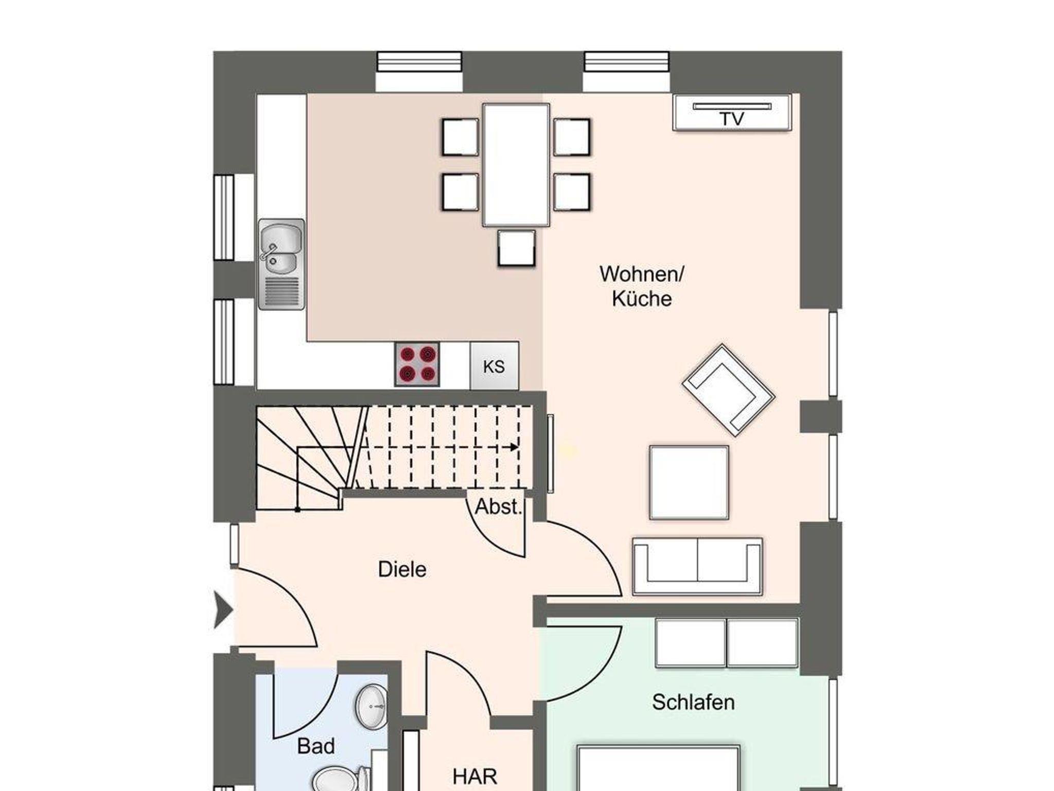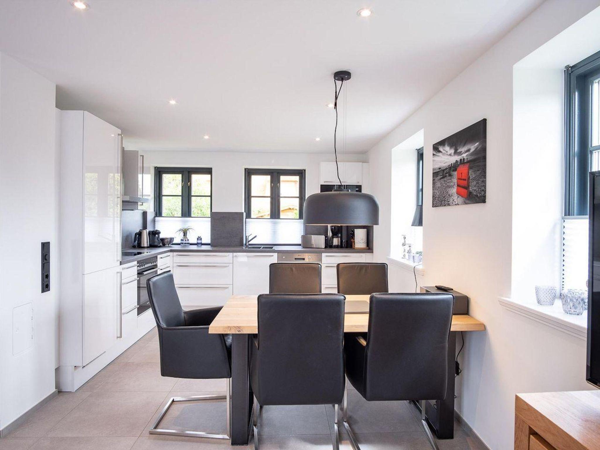 Im Erdgeschoss befindet sich der lichtdurchflutete Wohnraum mit TV, einer luxuriösen, angrenzenden Küche sowie einem stilvollen Essbereich. Der Wohnraum ist mit modernen, stylischen Möbeln eingerichtet. Die Küche verfügt über hochwertige Elektrogeräte und ist voll ausgestattet. An den Wohnbereich schließen sich ein Flur, ein Duschbad und ein Doppelschlafzimmer mit TV an.