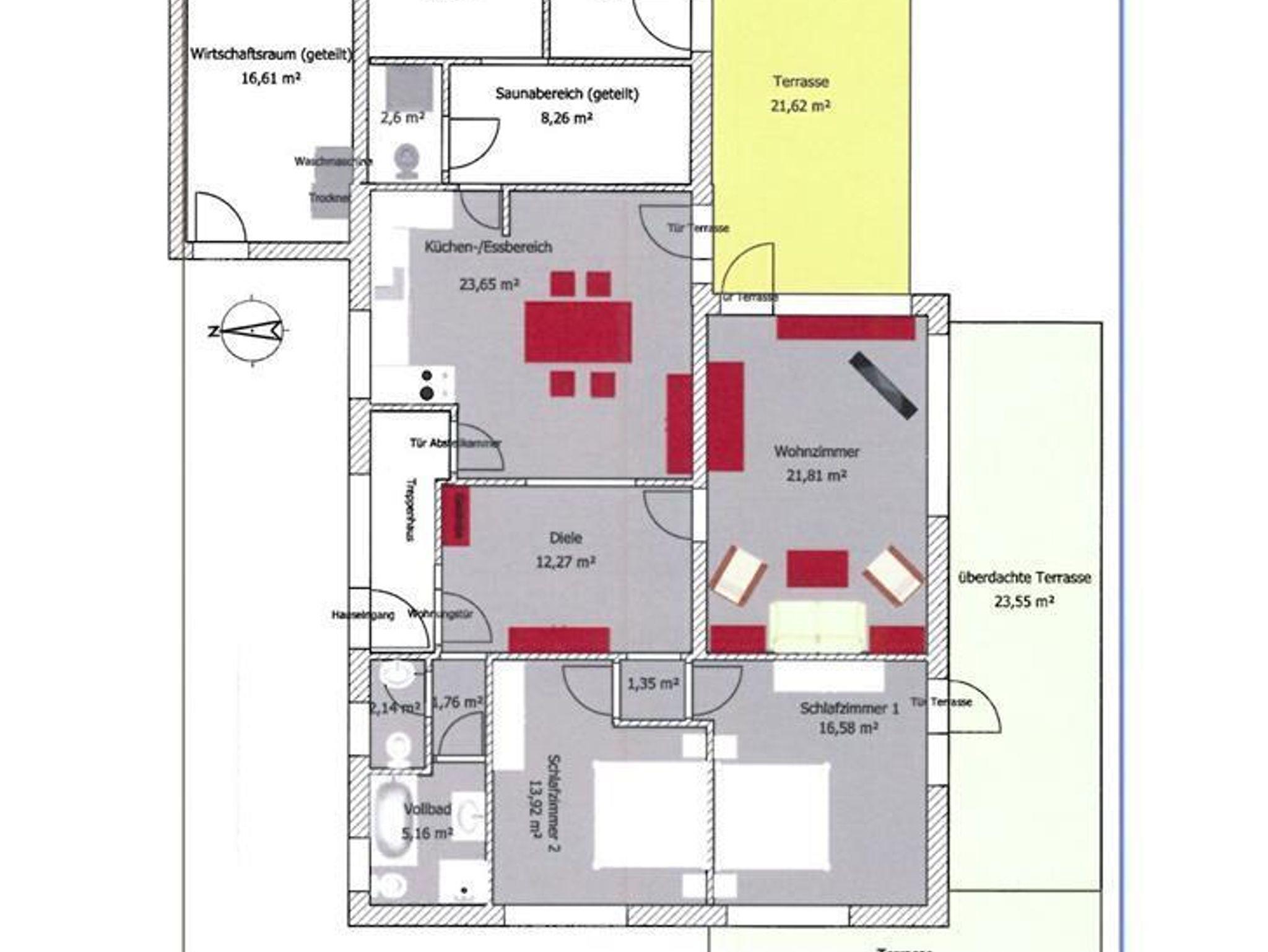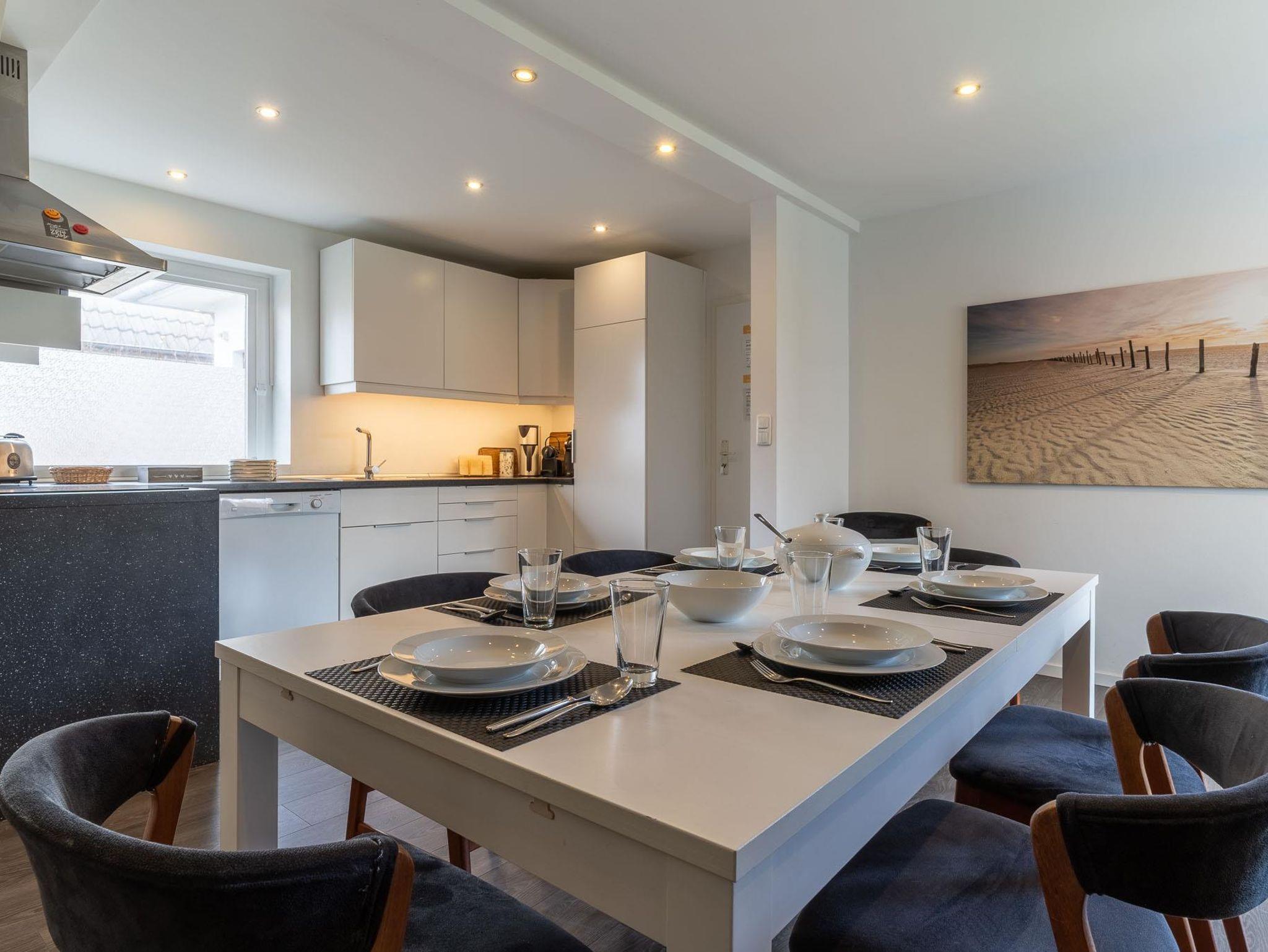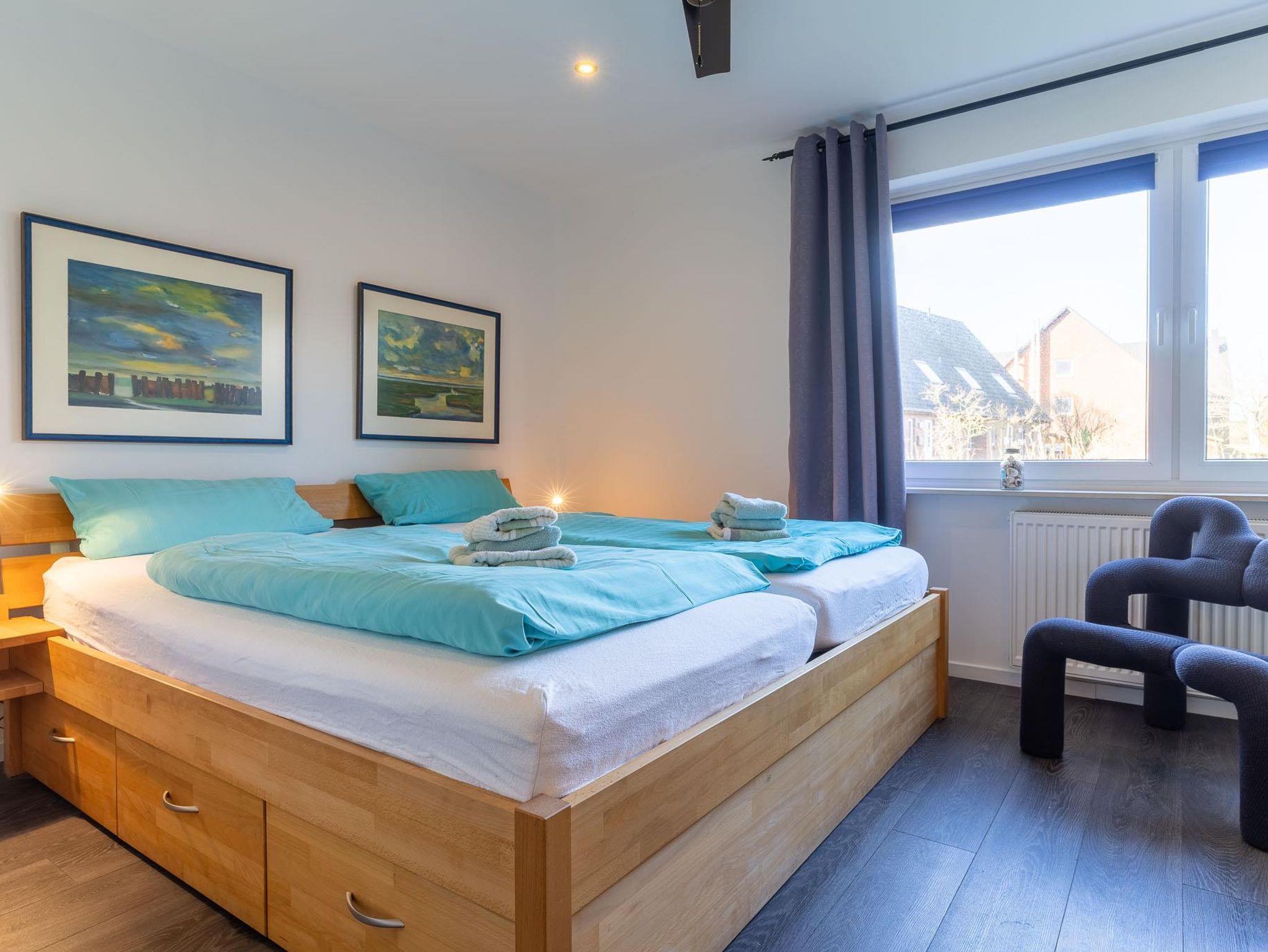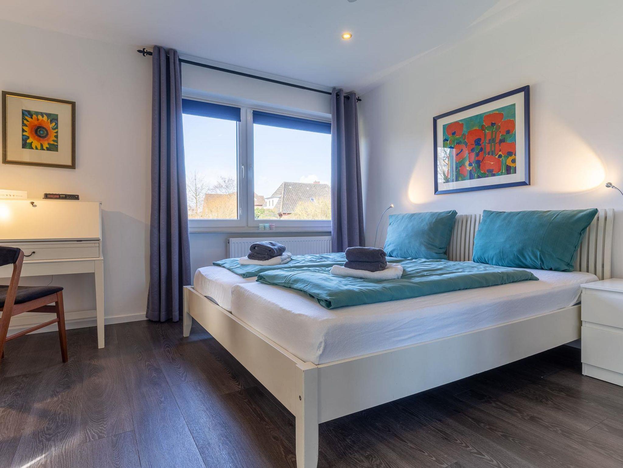 Die sehr großzügige mit 4 Sternen vom DTV zertifizierte, ca. 100 qm große und helle Ferienwohnung für vier Personen liegt im Erdgeschoß des Einzelhauses. Sie besteht aus einem Wohnzimmer, zwei Schlafzimmern mit Doppelbetten, einem Küchen/Essbereich, einer Eingangsdiele, einem Vollbad und einem separaten Gäste-WC. In allen Räumen befinden sich Vinylpaneele in Holzoptik oder Fliesen. Die hellen Wände, der etwas dunklere Fußboden, und die großen Fenster geben der Wohnung eine helle, moderne und wohnliche Atmosphäre. Das Wohnzimmer ist mit einer Stoffgarnitur, Flachbildschirm-TV und einem Stereosystem (inclusive Bluetooth) ausgestattet. In beiden Schlafzimmern befinden sich große Kleiderschränke und Doppelbetten, von denen eins die Maße 180x200cm hat und das andere die Masse 180x190 cm. Beide Doppelbetten sind mit separaten Einzel-Matratzen und Lattenrosten ausgestattet. Die vollständig eingerichtete Küche verfügt neben der üblichen Ausstattung wie Herd mit Cerankochfeld und Backofen, Mikrowelle, Kühlschrank, Toaster, Wasserkocher, Eierkocher und Filter-Kaffeemaschine auch über einen Geschirrspüler, einer Nespresso und Dolce Gusto Kaffeemaschine. Das Vollbad (mit Fussbodenheizung) ist mit einer Dusche, Badewanne, Waschbecken, WC und Handtuchtrockner ausgestattet. Daneben steht ein separates Gäste -WC zur Verfügung. Die besten Voraussetzungen, um einen erholsamen Urlaub zu verbringen. Ein eigener PKW-Stellplatz und ein abschließbarer Fahrradschuppen sind direkt vor dem Haus vorhanden, und auf den Süd- und Westseiten des Hauses stehen Terrassen und der Garten zu Ihrer privaten Nutzung bereit. Neu ist dort jetzt auch ein Strandkorb! Bettwäsche und Handtücher sind einmalig inklusive. Ein Kinderhochstuhl und ein Kinderbett stehen bei Bedarf zur Verfügung. Die Kosten für die Nutzung des Wlan-Zugangs zum Internet, Strom, Heizung und Wasser sind im Mietpreis enthalten. Für die Benutzung der mit den zwei anderen Wohnungen geteilten Waschmaschine und Trockner bedient man einen Euromünzenautomat, wobei ein Euro für eine gesamte Waschladung ausreicht. Das Mitbringen von Haustieren und das Rauchen sind in der Wohnung nicht gestattet. Die Mindestmietdauer beträgt 7 Übernachtungen. Bei Buchungen unter 7 Übernachtungen wird ein Kurzbucherzuschlag i.H.v. einmalig 10,50 € pro Person erhoben.