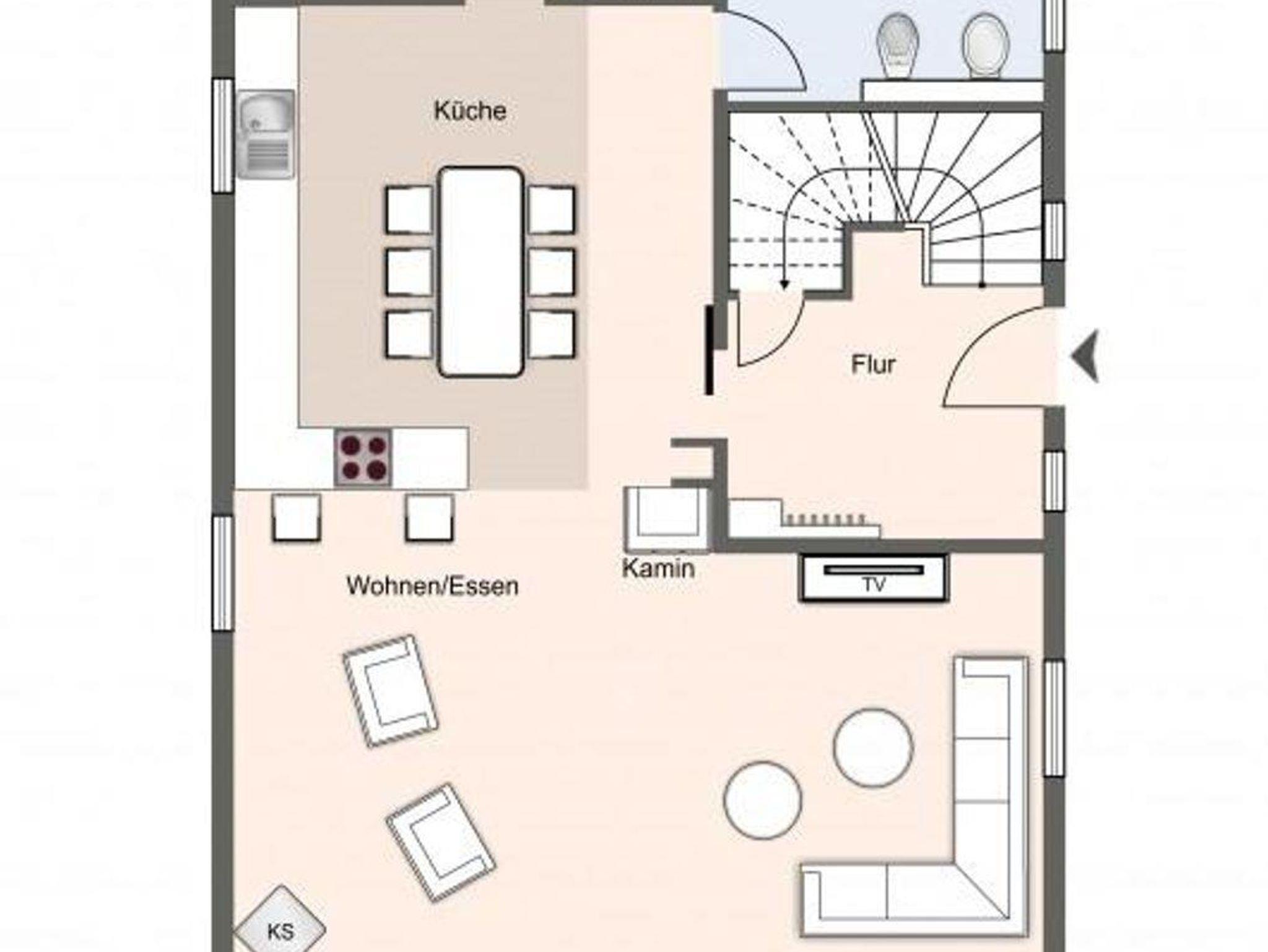 Im Erdgeschoss befindet sich der lichtdurchflutete Wohnraum mit TV, einer großen offenen Küche sowie einem stilvollen Essbereich. Die Wohnräume sind mit exklusiven Möbeln ausgestattet. Die Küche verfügt über hochwertige Elektrogeräte. An den Wohnbereich schließen sich ein Duschbad mit Sauna, ein Hauswirtschaftsraum und ein geräumiger Flur. Das gesamte Erdgeschoss verfügt über geschmackvolle Fußbodenfliesen und Dielenboden. Für ein wohliges Klima sort im ganzen Haus eine Fußbodenheizung.