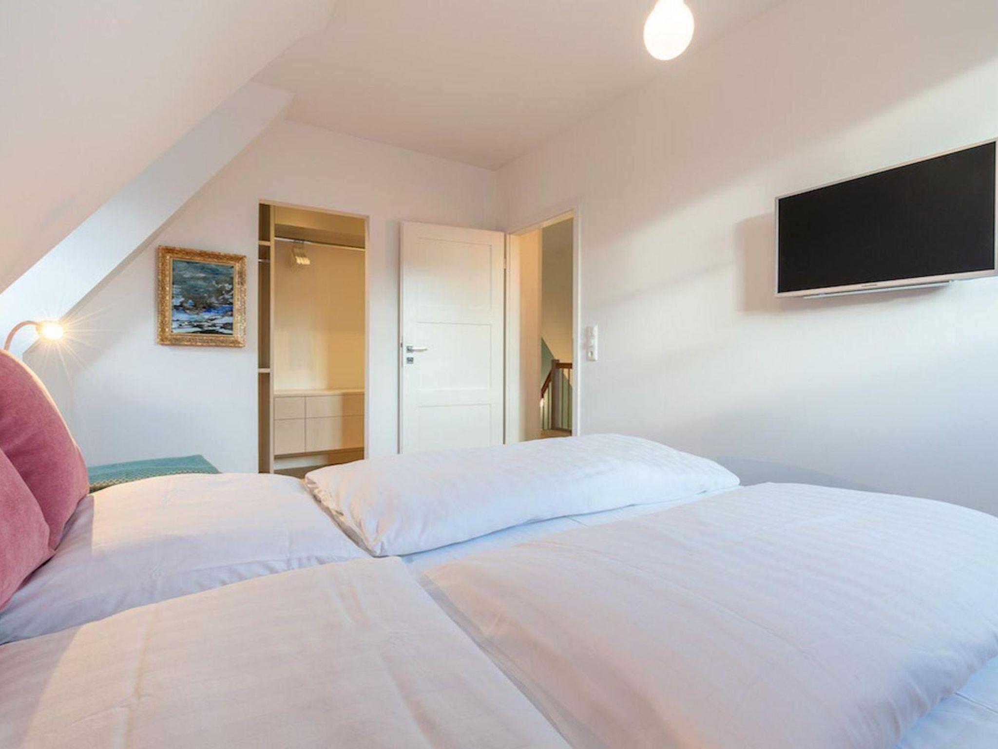 Über eine Holztreppe gelangt man in das mit Eichendielen ausgelegte Obergeschoss. Die beiden Schlafzimmer mit je einem Doppelbett und TV bieten jeden Komfort. Begehbare Kleiderschränke gewähren Ihnen hinreichend Ablageflächen. Darüber hinaus befindet sich im Obergeschoss ein weiteres Schlafzimmer, hier sind 2 hochwertige Schlafsofas für 2 Personen. Der Lounge Room kann ebenso als Büro oder Lesezimmer genutzt werden. Ein geräumiges Bad mit Dusche und freistehender Badewanne runden jeden Luxus ab.