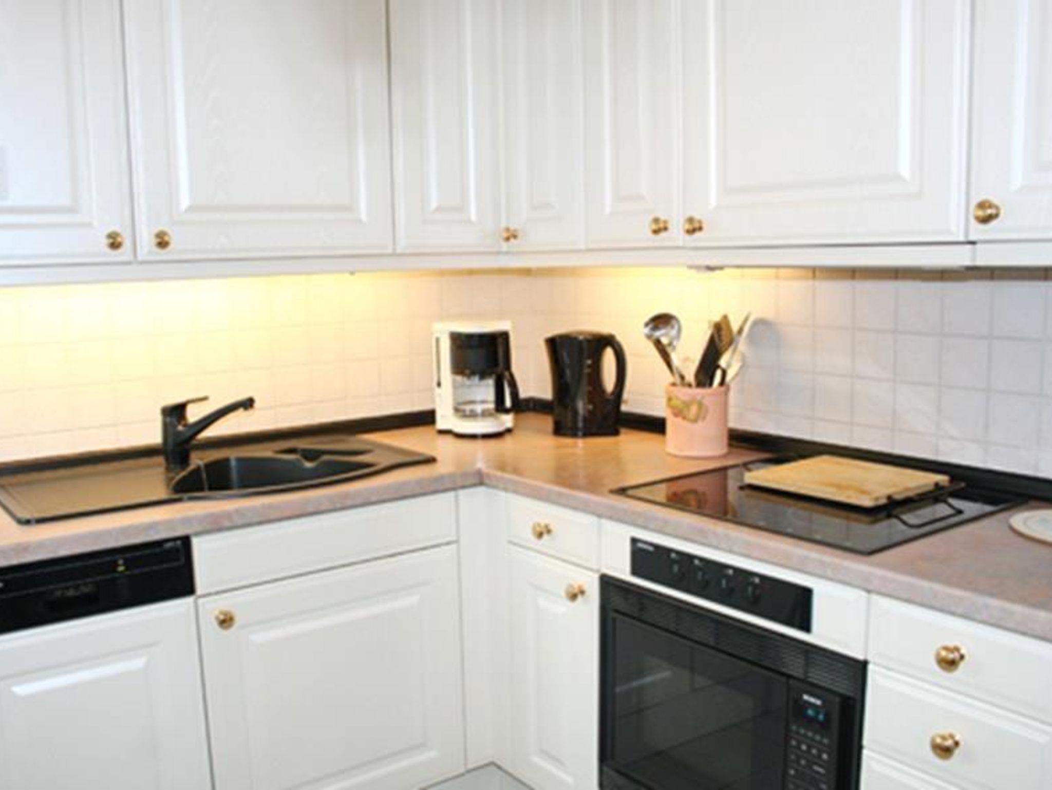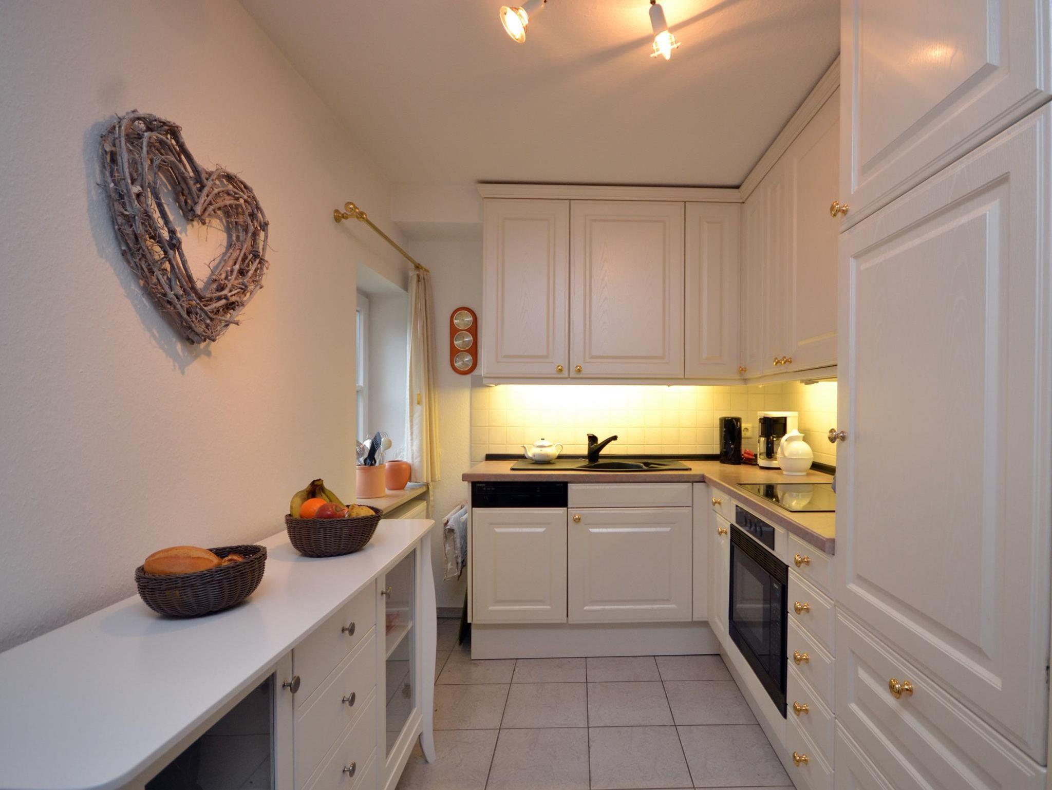 Wohnzimmer: außziehbares Sofa, Couchtisch, Korbsessel mit Fußhocker, Kommode mit Flachbild-TV (Kabelfernsehen), Esstisch mit 3 Stühlen, schöne offene Küche mit 4-Platten Ceranfeld, Mikrowelle, Geschirrspüler, Kühlschrank mit 3 Sterne Gefrierfach, Kaffeemaschine, Wasserkocher, Toaster, Geschirr, Kochtöpfe