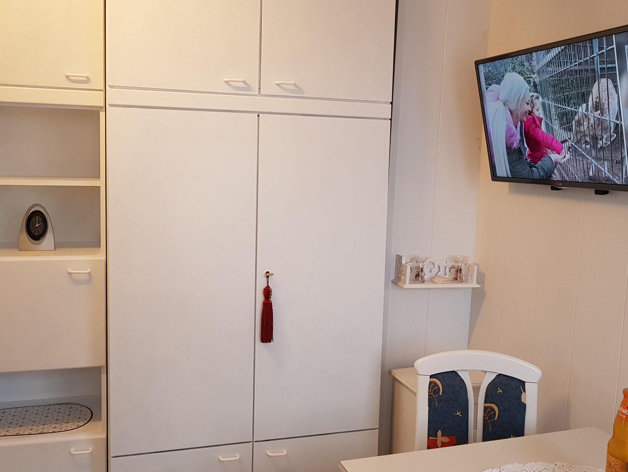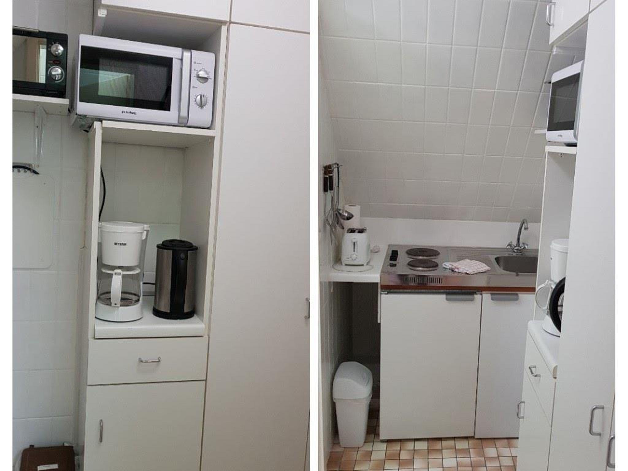 • Separate kleine Küche mit Herd (2-Plattenherd), Kühlschrank mit Gefrierfach und Mikrowelle. Haushaltsschrank mit Staubsauger