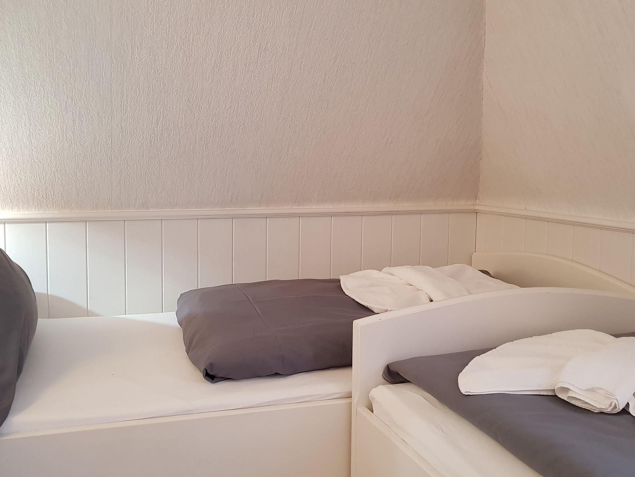 • Gemütliches Wohn-/Schlafzimmer mit 2 Einzelbetten, Einbauschrank, 2 Sesseln, TV, Radio und kleinem Esstisch mit 2 Stühlen