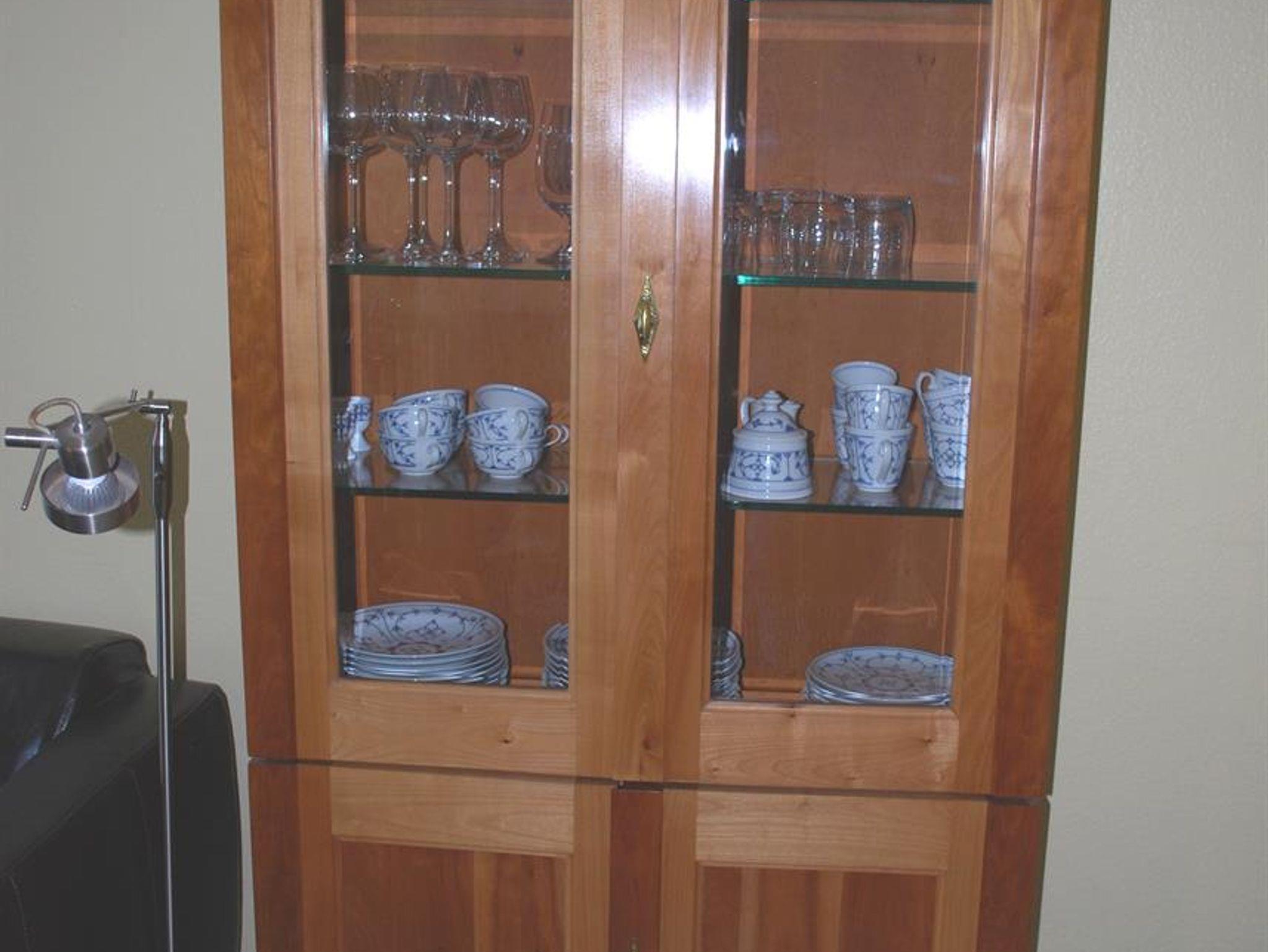 Vitrine (für Porzellan und Gläser) und Vertiko, beide aus massivem Kirschholz, Biedermeierschrank, Essgruppe und wertvollen Teppichen.