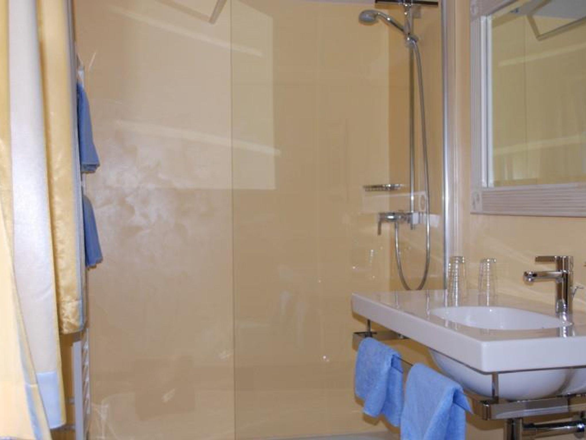Das Bad mit großer Duschzelle, Föhn und Wandschrank ist edel ausgestattet.