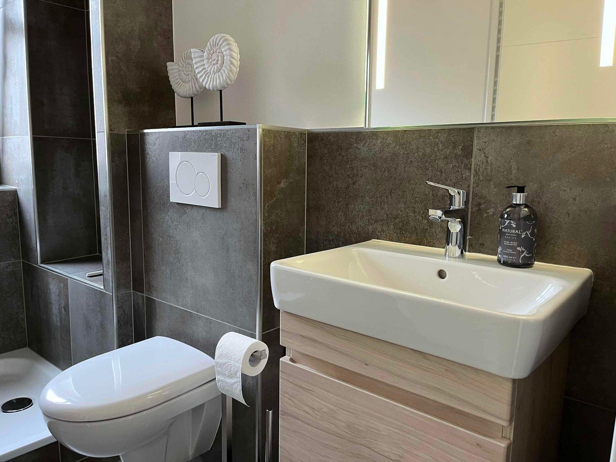 Bad: Dusche, Waschbecken, WC, E-Heizung