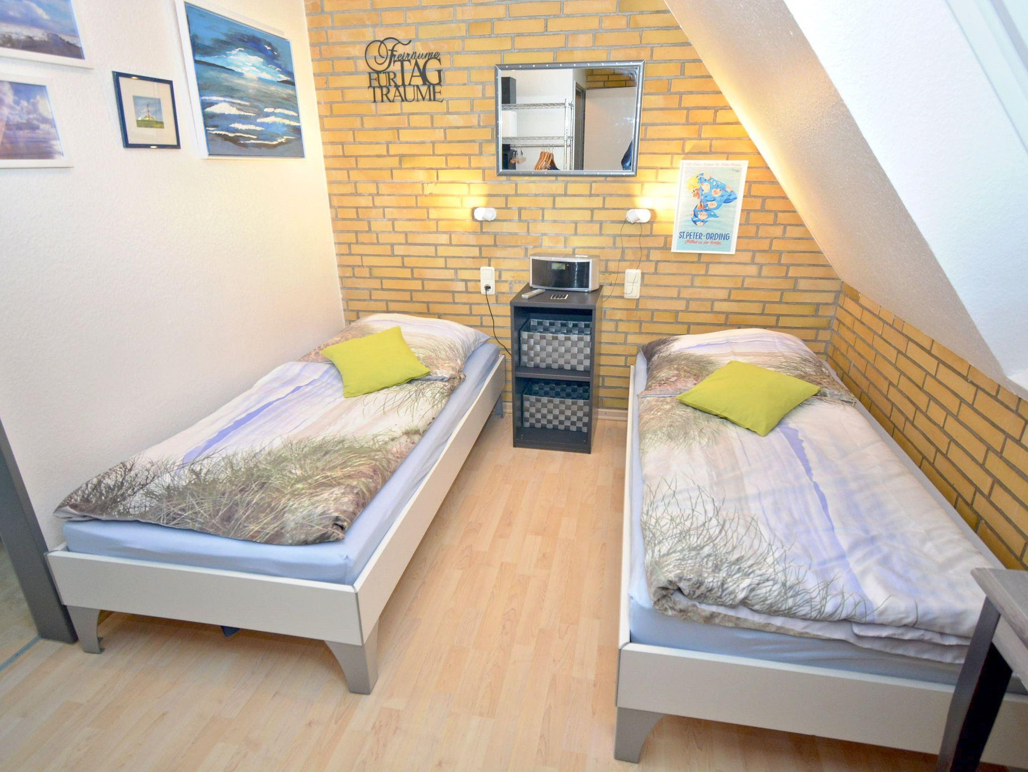Schlafzimmer 1: 2 Einzelbetten, 2 Nachttische, Ablage, Kleiderständer, Kofferradio mit CD-Player, Sessel, Spiegel, Stuhl, Treppe nach unten