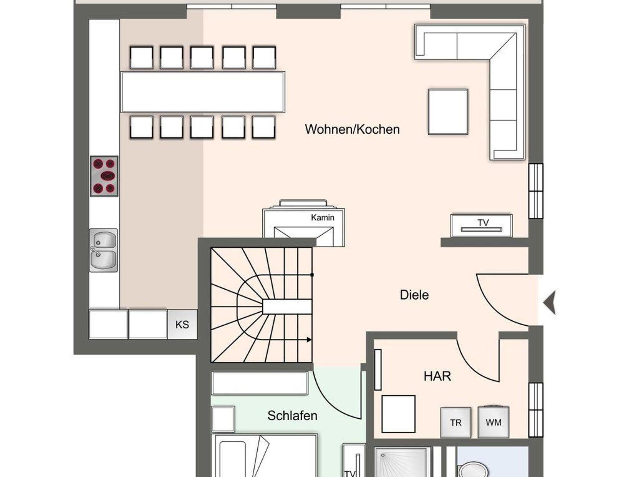 Im Erdgeschoss erwarten Sie ein einladender Flur mit Garderobe, ein geräumiger Wohn- und Essbereich mit offener Küche und Kaminofen, ein Schlafzimmer mit einem komfortablen Boxspringbett (180 x 200 cm) und eigenem Duschbad/WC sowie ein Hauswirtschaftsraum mit Waschmaschine und Trockner.