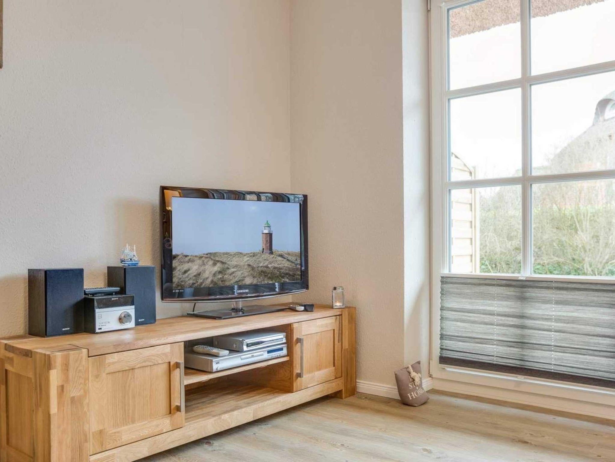 Wohnzimmer mit Sofa für 2 Personen, Sessel, TV (Kabel), DVD-Player und Stereo-Kompaktanlage. Direkter Zugang zur möblierten Gartenterrasse nach Westen mit Strandkorb.