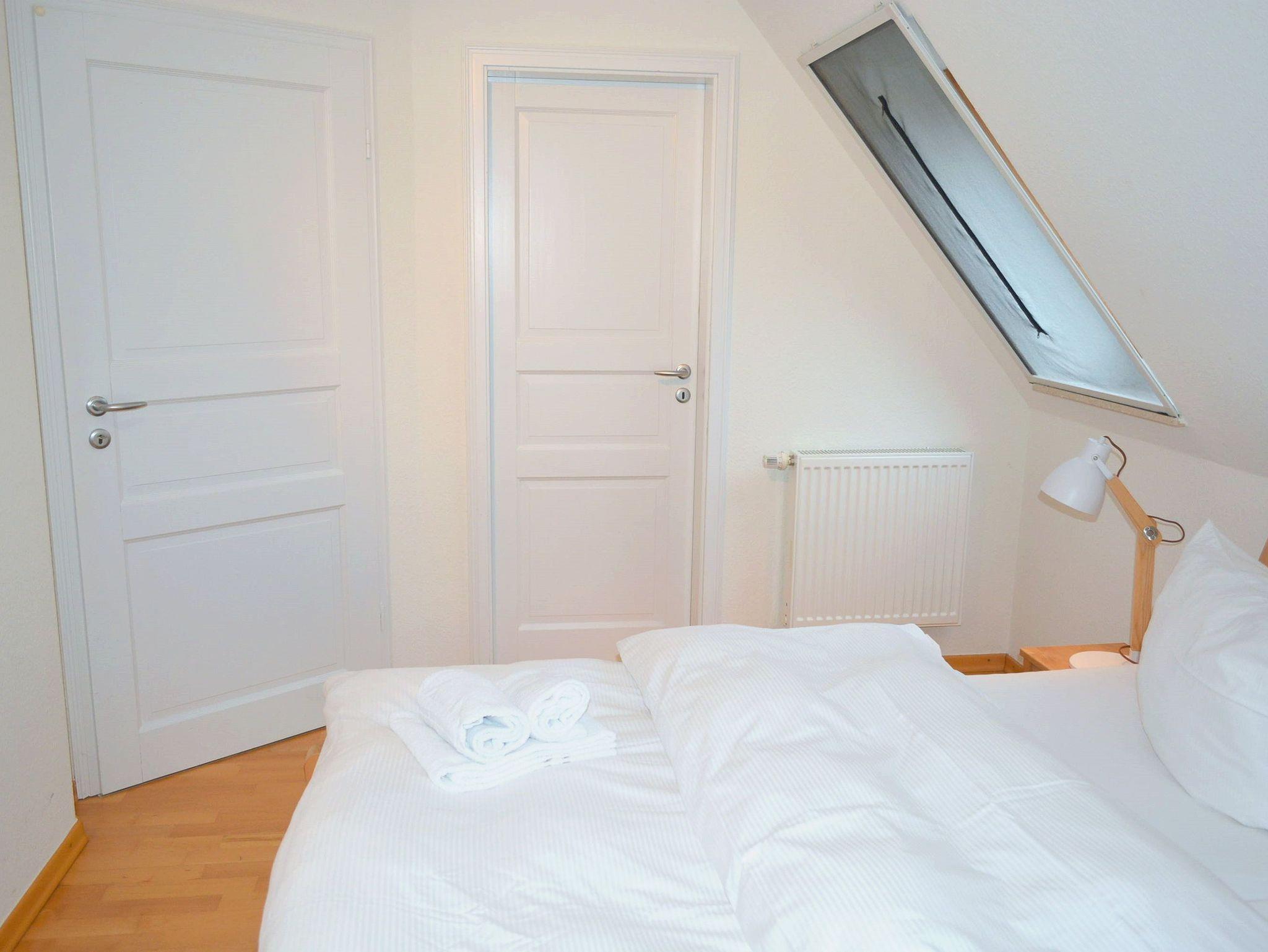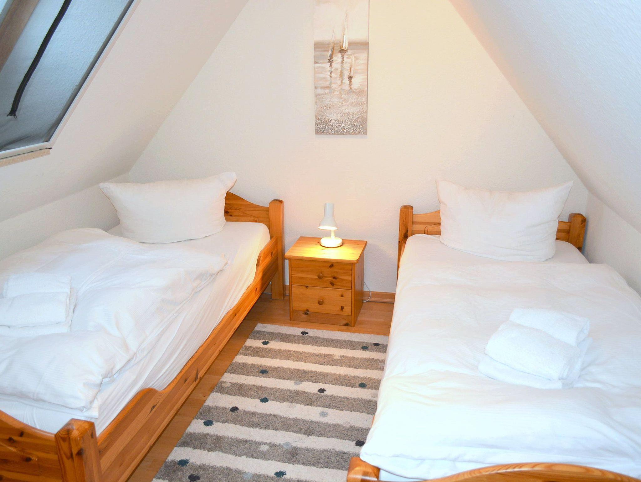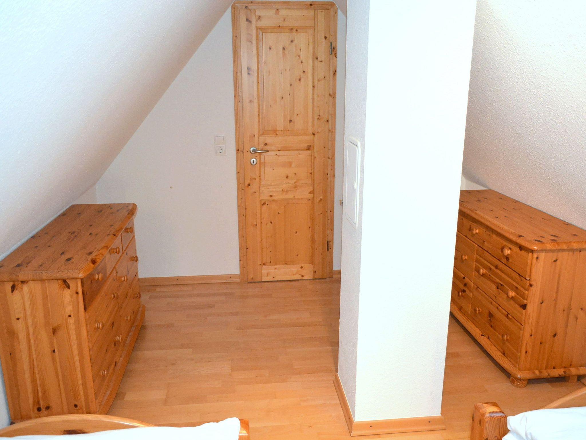Schlafzimmer 2: 2 Einzelbetten, 2 Kommoden, Fliegengitter vor dem Fenster, Nachttisch