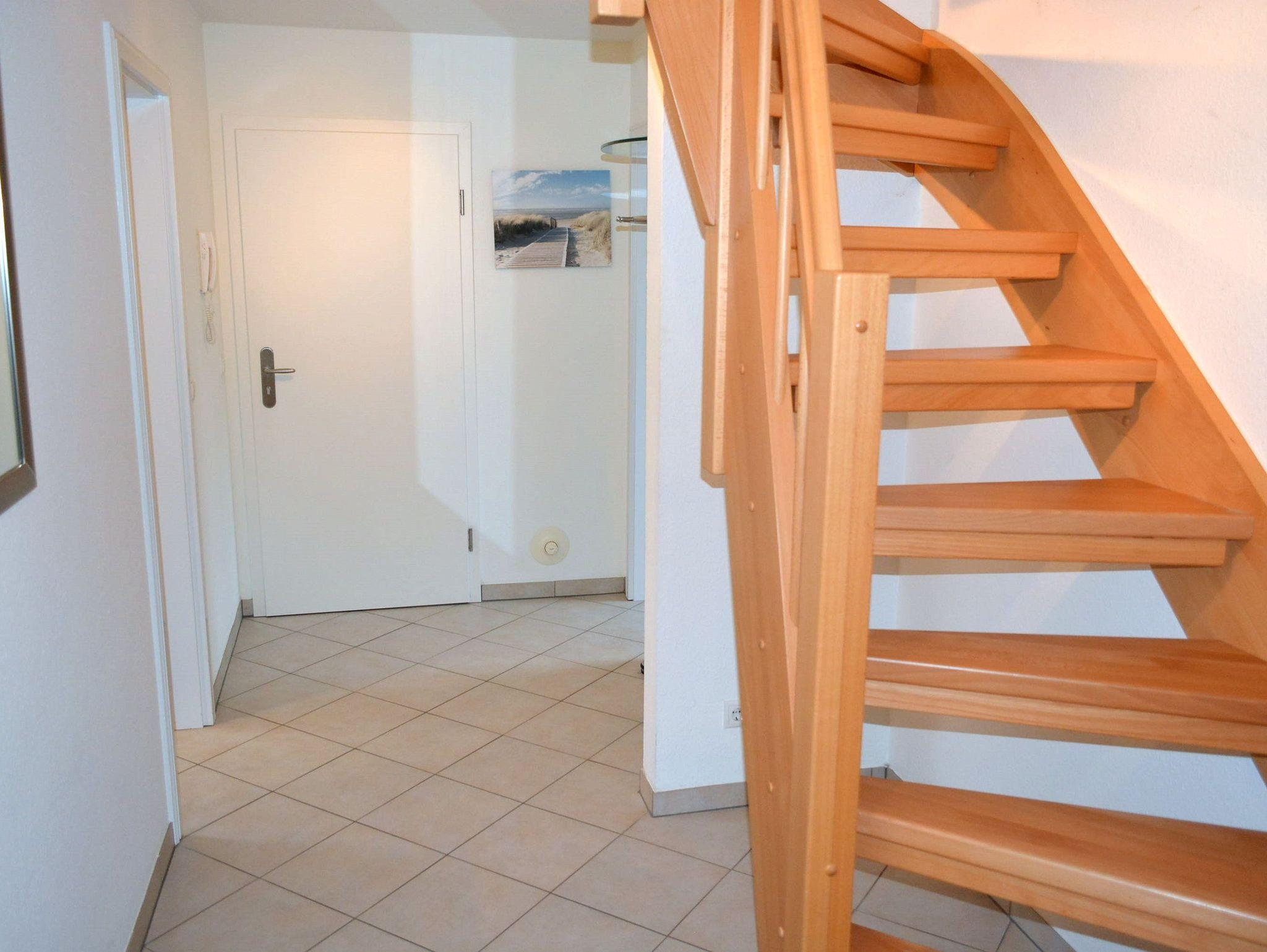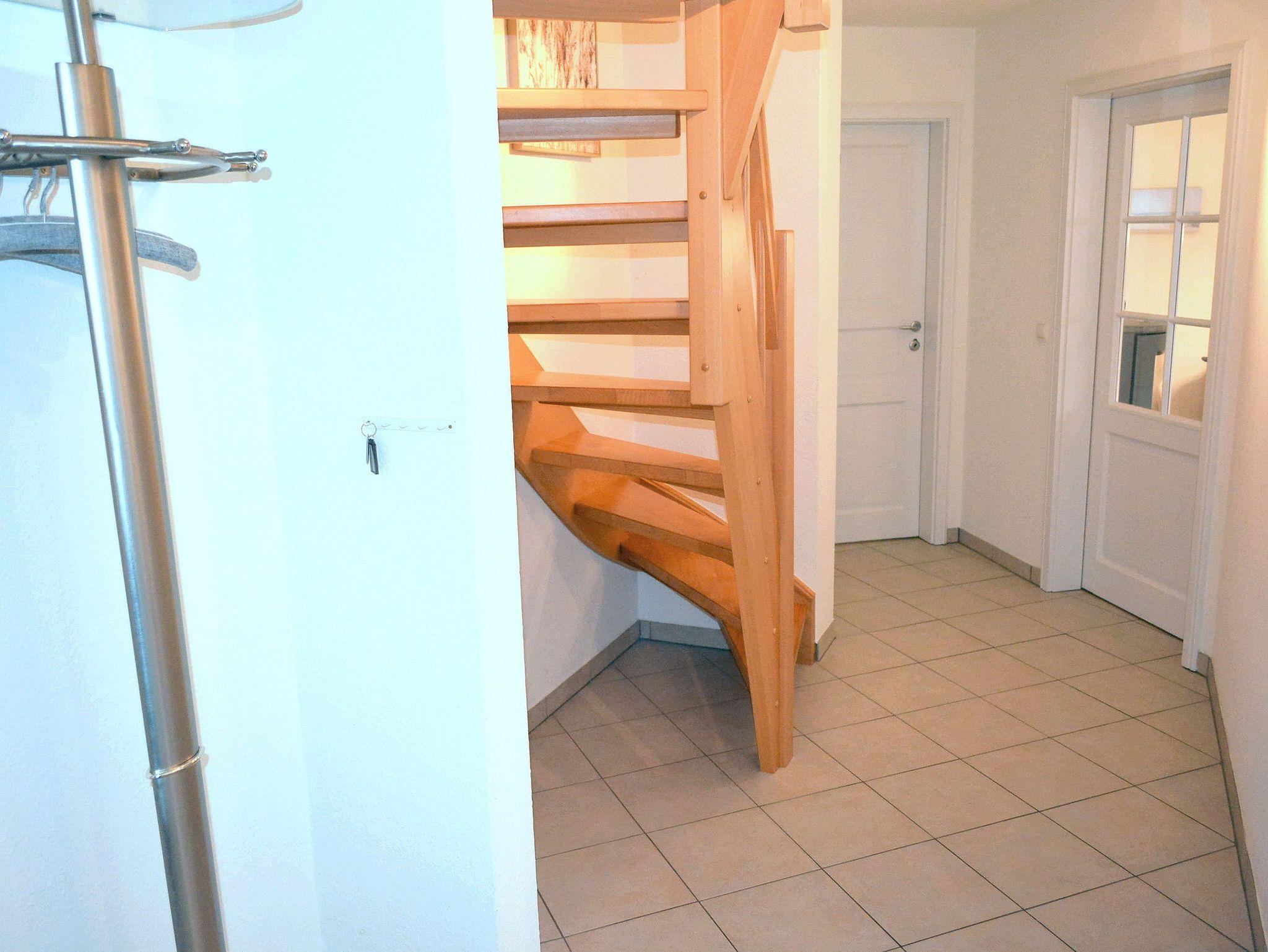Flur: Fußbodenheizung, Garderobe, Spiegel, Treppe nach oben