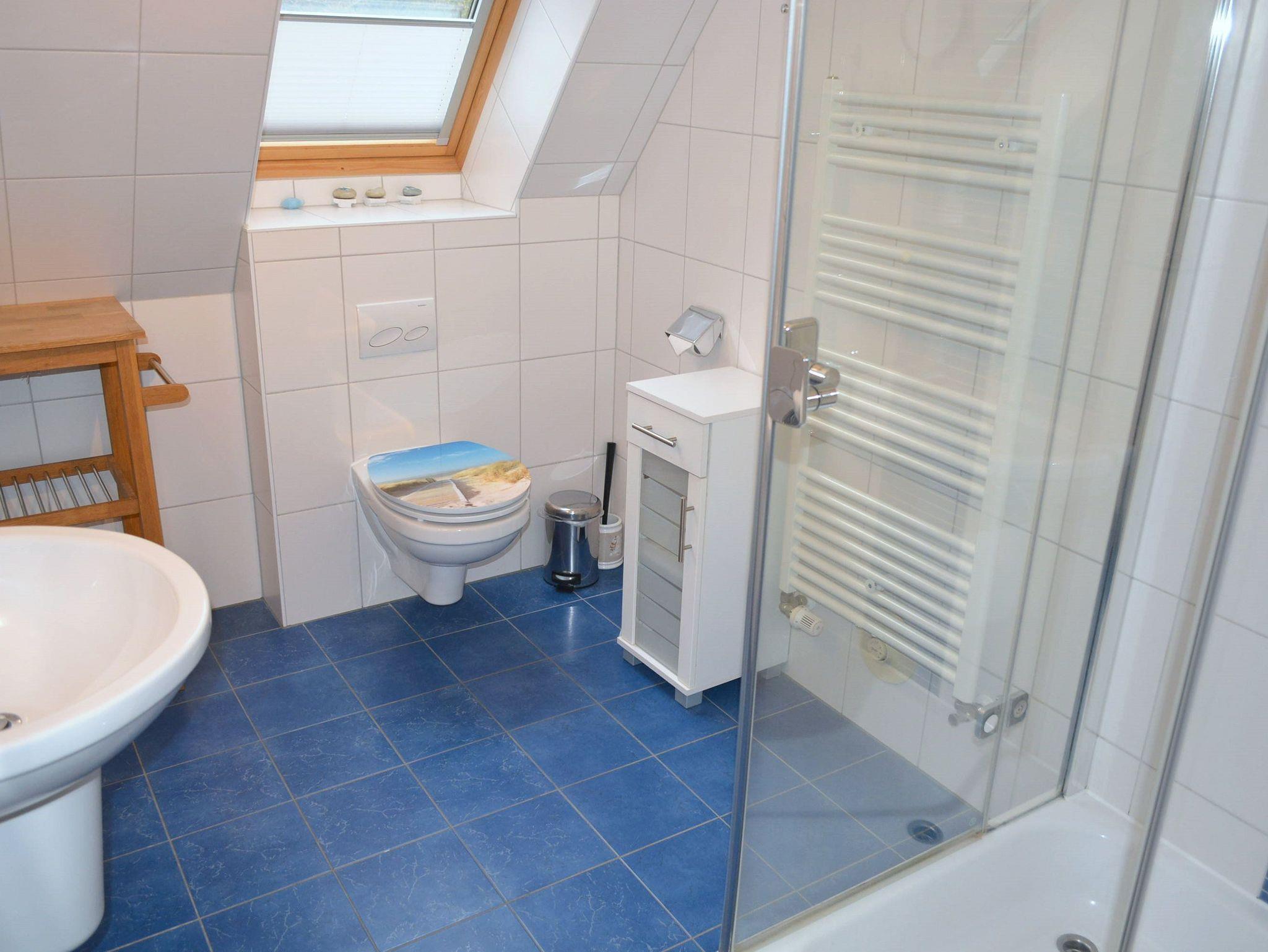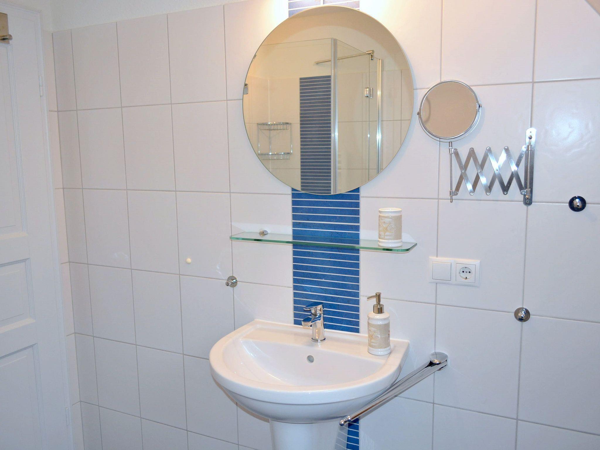 Bad 1: Dusche, Duschkabine, Fußbodenheizung, Handtuchheizkörper, kleiner Schrank, Kosmetikspiegel, Rollregal, Spiegel, Waschbecken, WC