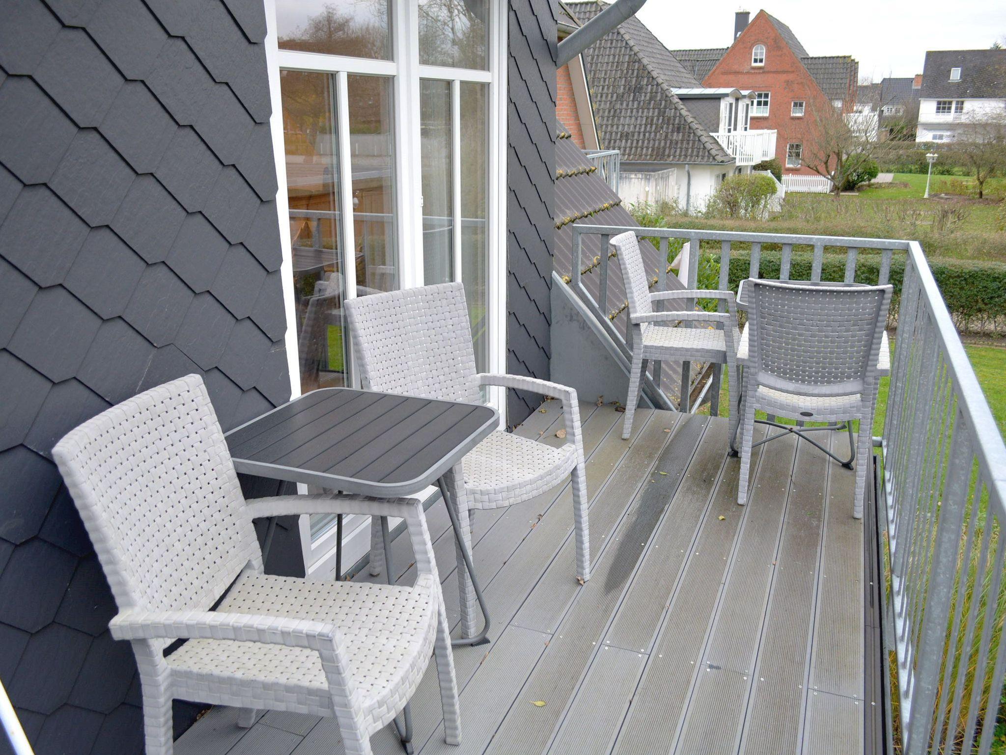 Balkon: 2 Tische, 4 Stühle, Liege, Nord- Südlage, Sonnenschirm