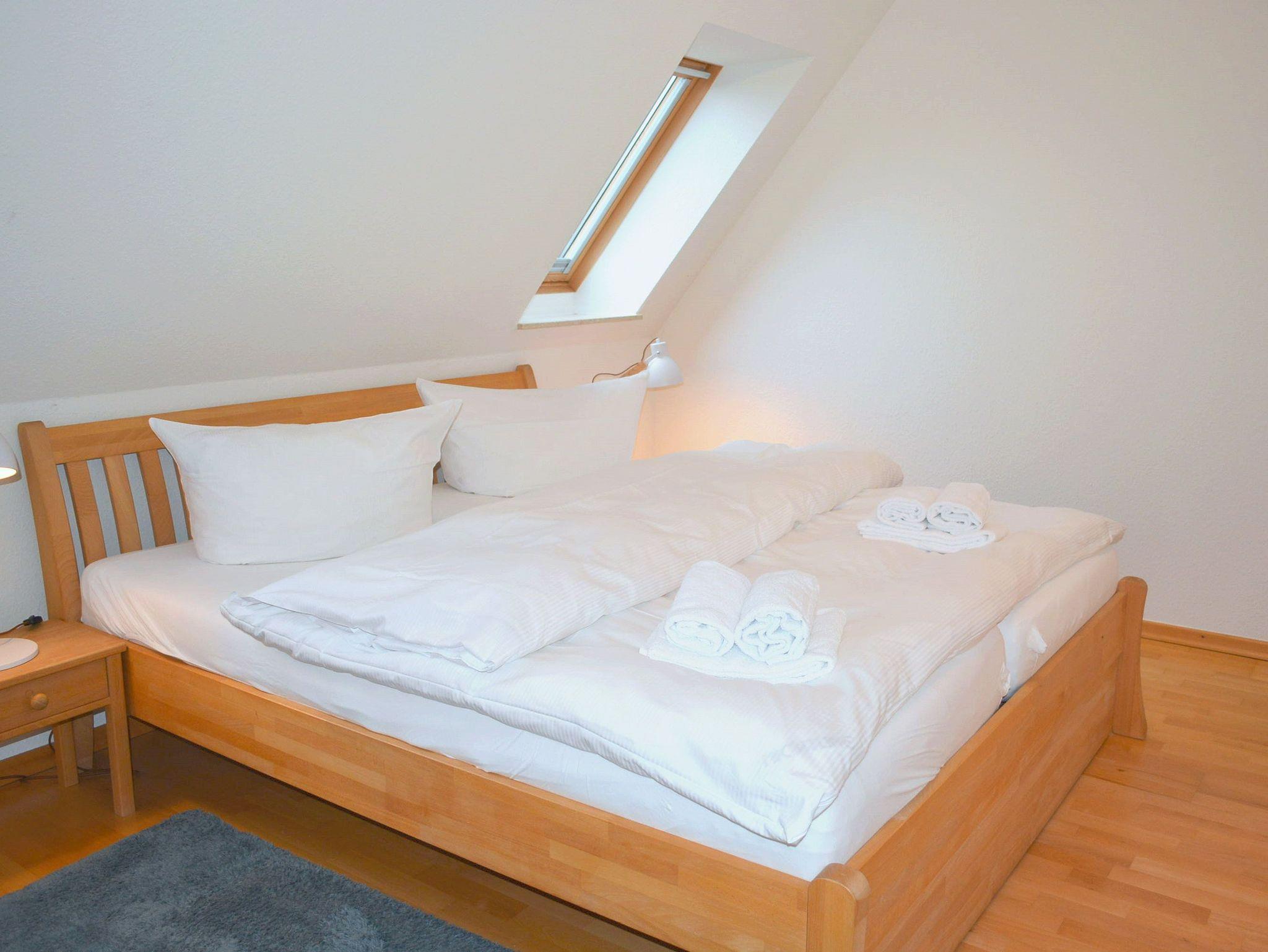 Schlafzimmer 1: 2 Nachttische, Doppelbett 2,00 x 1,80 m, Fliegengitter vor einem Fenster