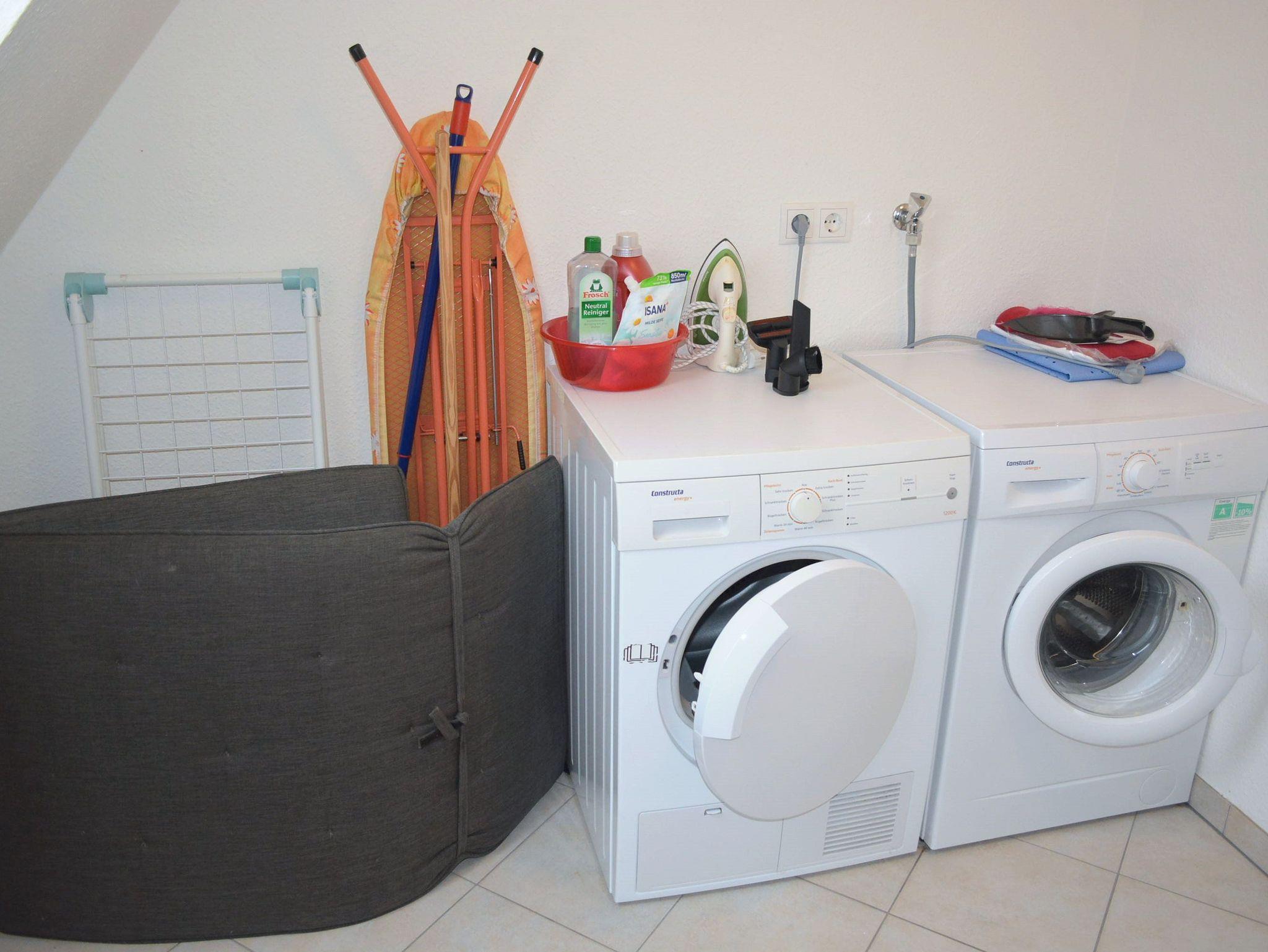 Hauswirtschaftsraum: Bügelbrett, Bügeleisen, Kinderhochstuhl, Kinderreisebett, Staubsauger, Trockner, Wäschesackständer, Waschmaschine