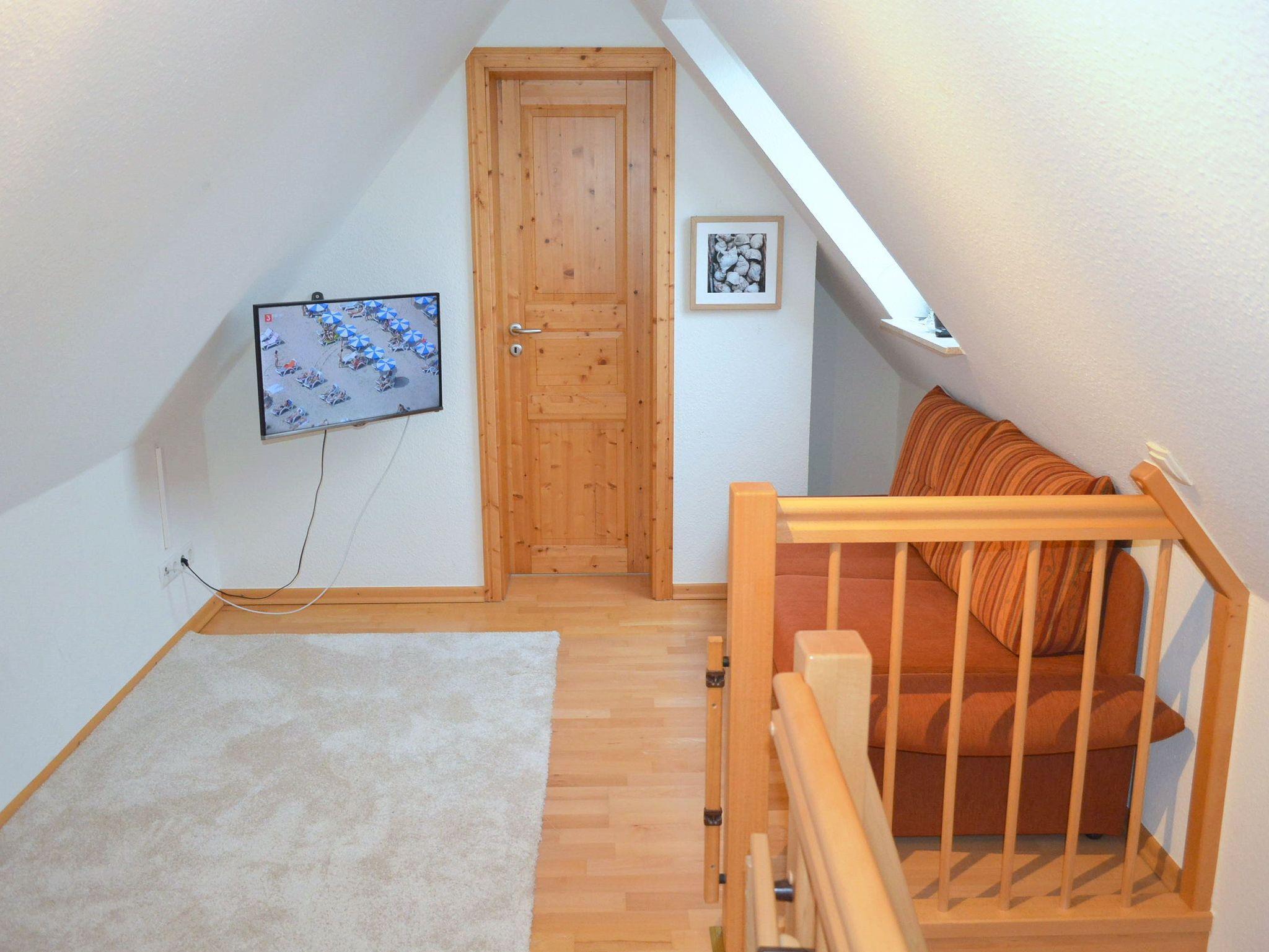 Flur 2: Couch, Kindertreppengitter, Sat-TV, Treppe nach unten