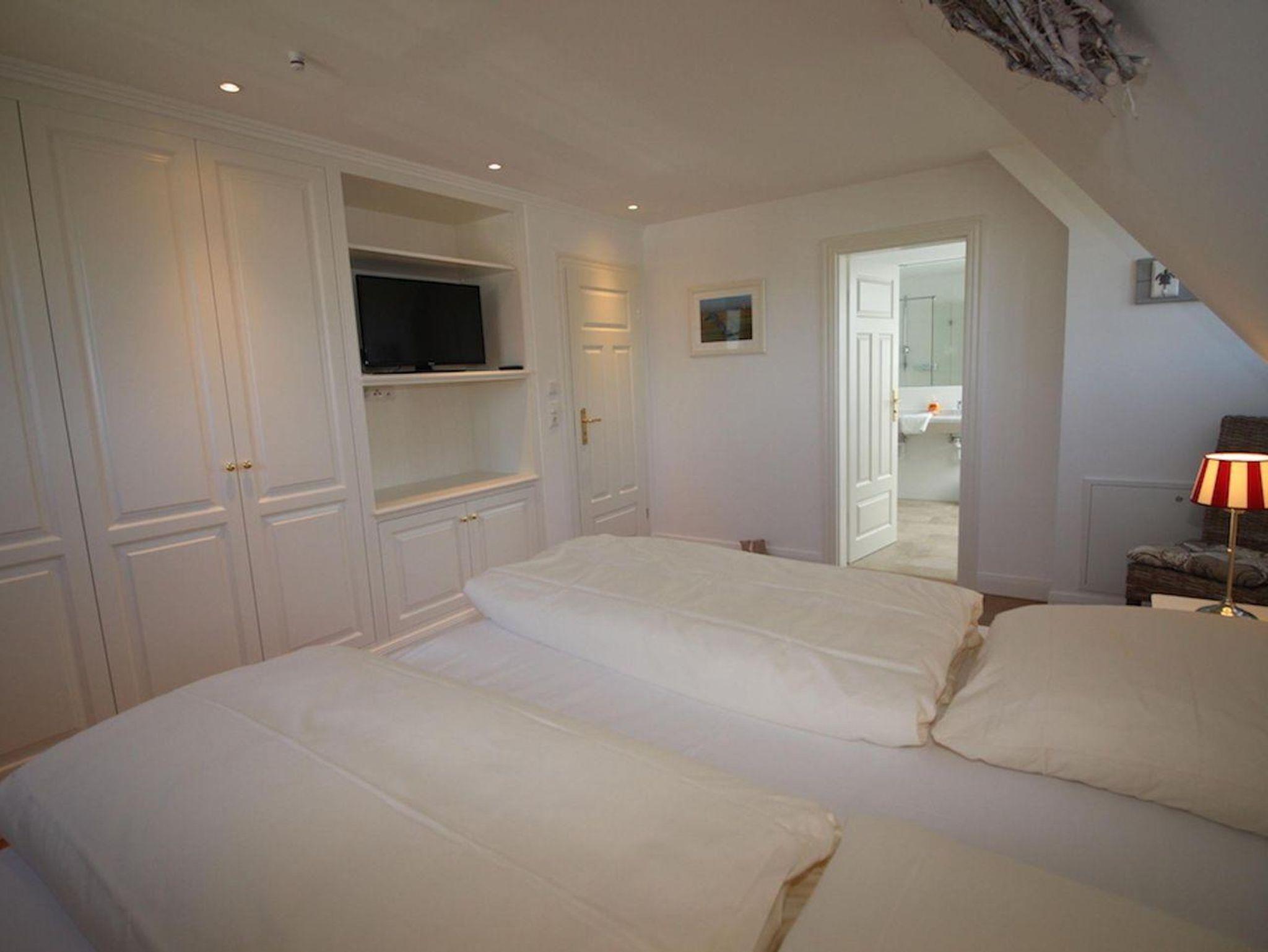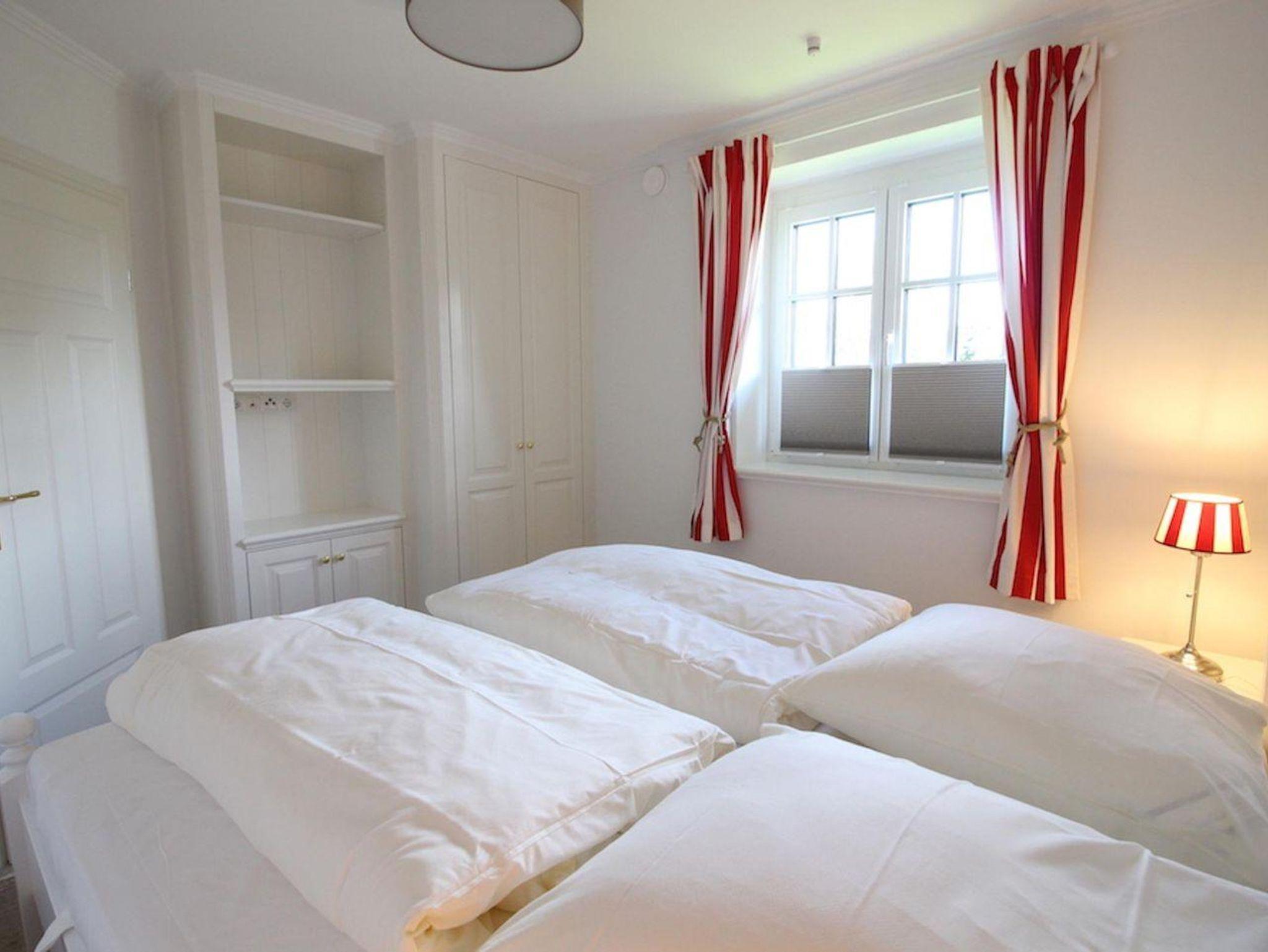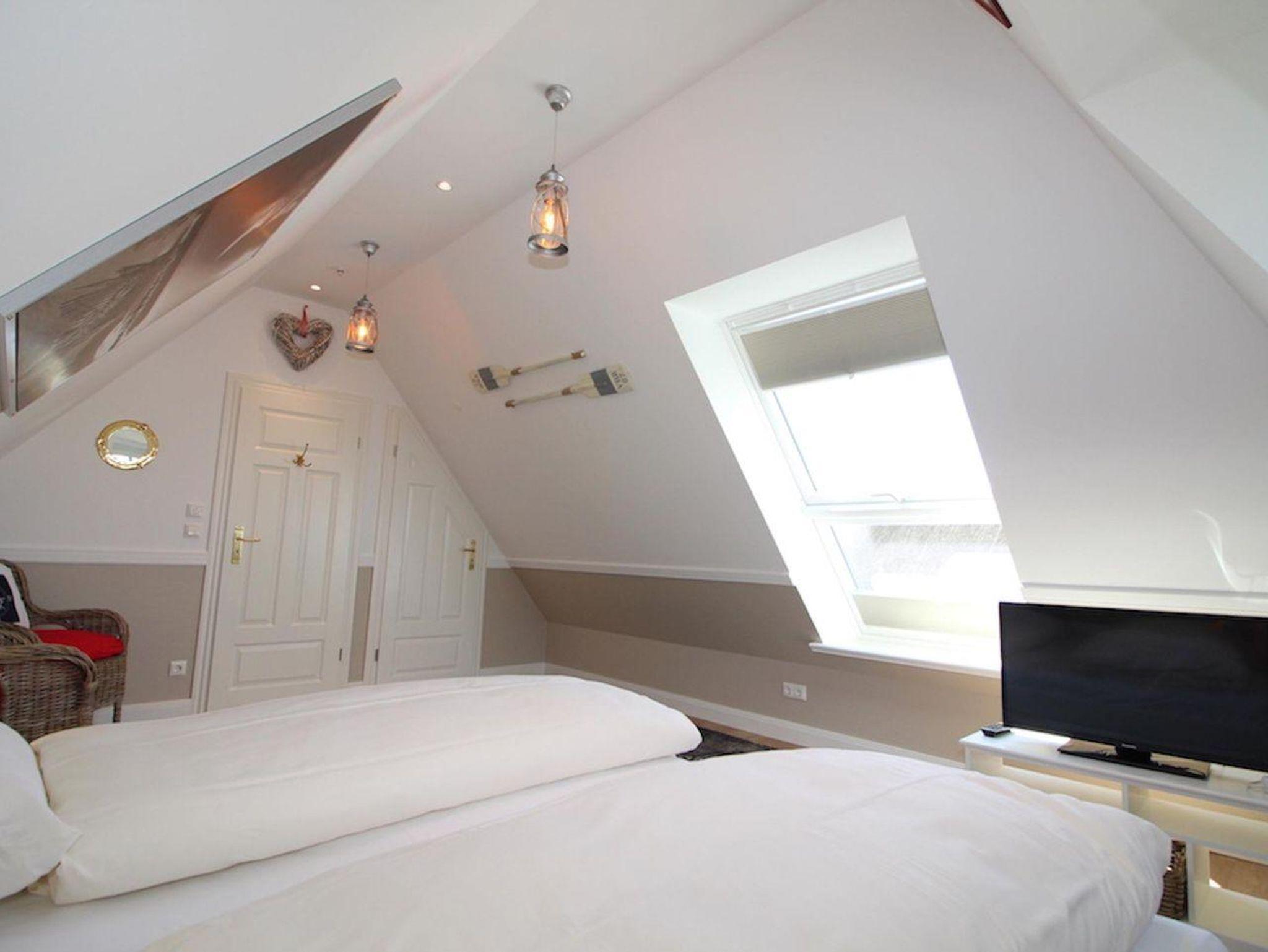 Im Erdgeschoss befindet sich der lichtdurchflutete Wohnraum mit TV, Kamin, einer offenen Küche sowie einem stilvollen Essbereich mit gemütlicher Eckbank. Die Wohnräume sind mit exklusiven Möbeln ausgestattet. Die Küche verfügt über hochwertige Elektrogeräte. An den Wohnbereich schließen sich ein Flur mit eingebauter Garderobe, ein Abstellraum und ein Gästebad an. Ebenso ist Ebenerdig ein Doppelschlafzimmer mit Einbauschränken. Das gesamte Erdgeschoss ist mit geschmackvollen Fußbodenfliesen versehen, die über eine Fußbodenheizung beheizt werden können. Über eine Holztreppe gelangt man in das mit Parkett ausgelegte Obergeschoss. Dieses verfügt ebenfalls über eine Fußbodenheizung. Die beiden Schlafzimmer, jeweils mit einem Doppelbett, sind ebenfalls mit TV ausgestattet. Einbauschränke gewähren Ihnen hinreichend Ablageflächen. Darüber hinaus befinden sich im Obergeschoss zwei weitere, geräumige Bäder mit Dusche. Für zusätzliche Entspannung sorgt eine Sauna mit Sternenhimmel. Vom Obergeschoss führt die Holztreppe hinauf in das Dachgeschoss. Ein drittes Schlafzimmer mit Doppelbett und großen Fenstern mit Blick bis zum Wasser erfüllt jeden Urlaubstraum.