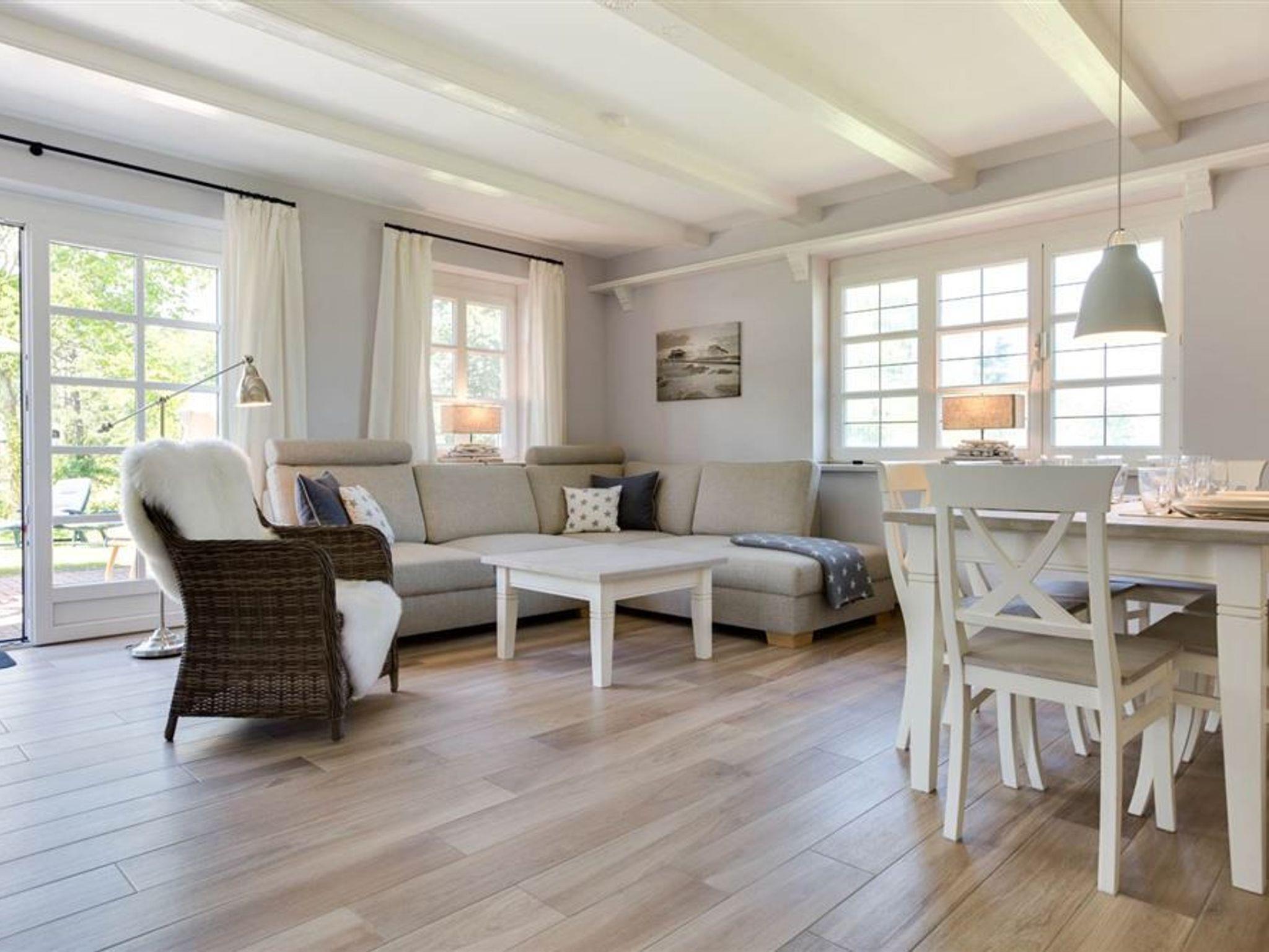 Wohnzimmer mit großem Ecksofa (für 3-5 Personen), Sessel, großem TV (Kabel), Esstisch für 6 Personen und Kamin. Direkter Zugang zur sonnigen, möblierten Gartenterrasse nach Westen mit Strandkorb.