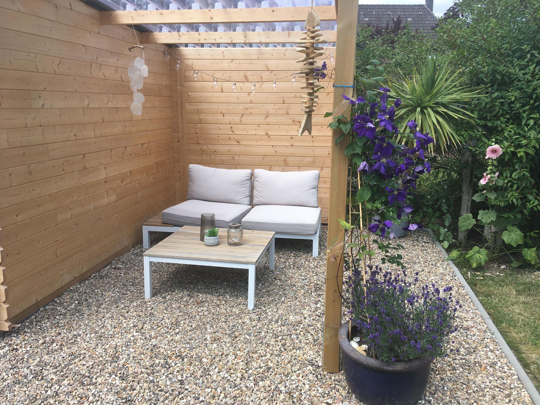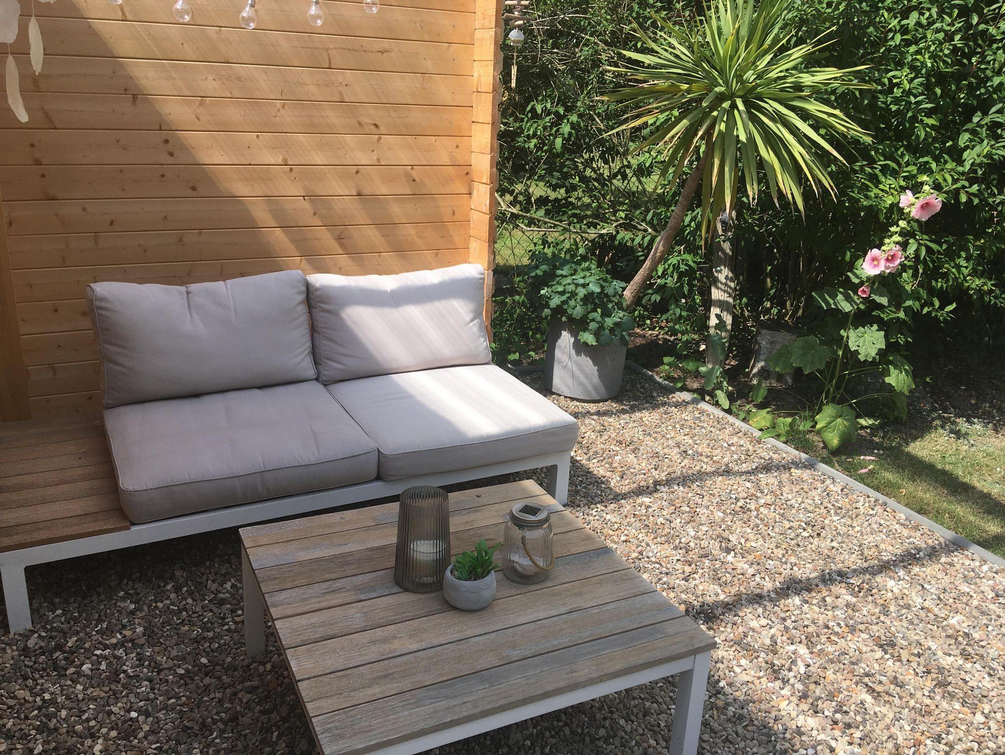 Der Garten mit Gartenmöbeln und Liegen lädt zum Erholen ein.