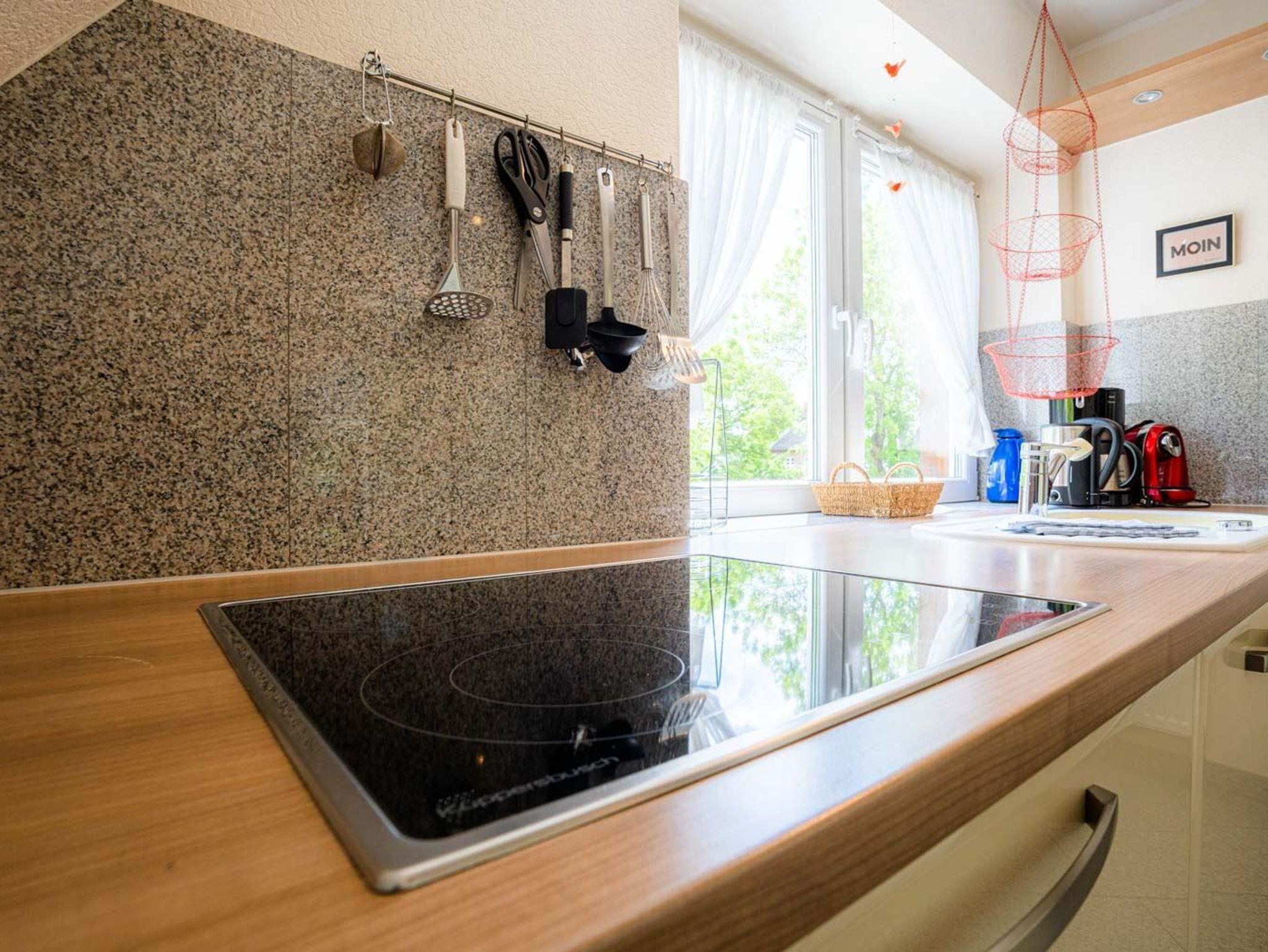 Separate Küche mit allem Komfort: Backofen auf Arbeitshöhe, Mikrowelle, Geschirrspüler, Kühlschrank mit Gefrierfach und Tchibo Caffissimo Kapsel-Kaffeemaschine. Abstellkammer mit Bügelset.