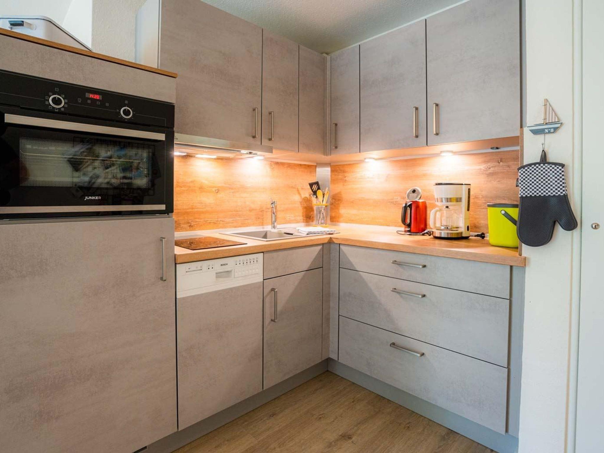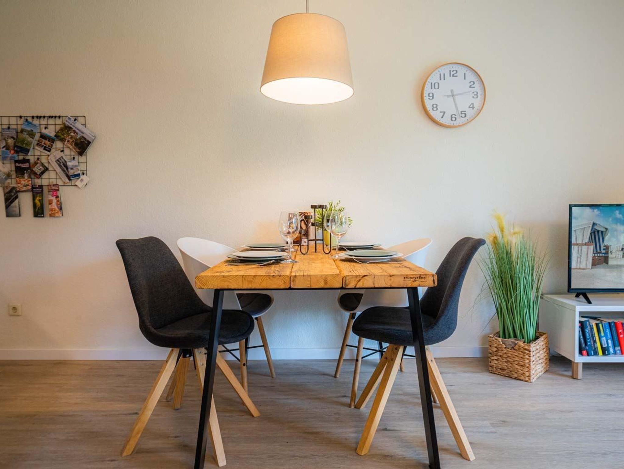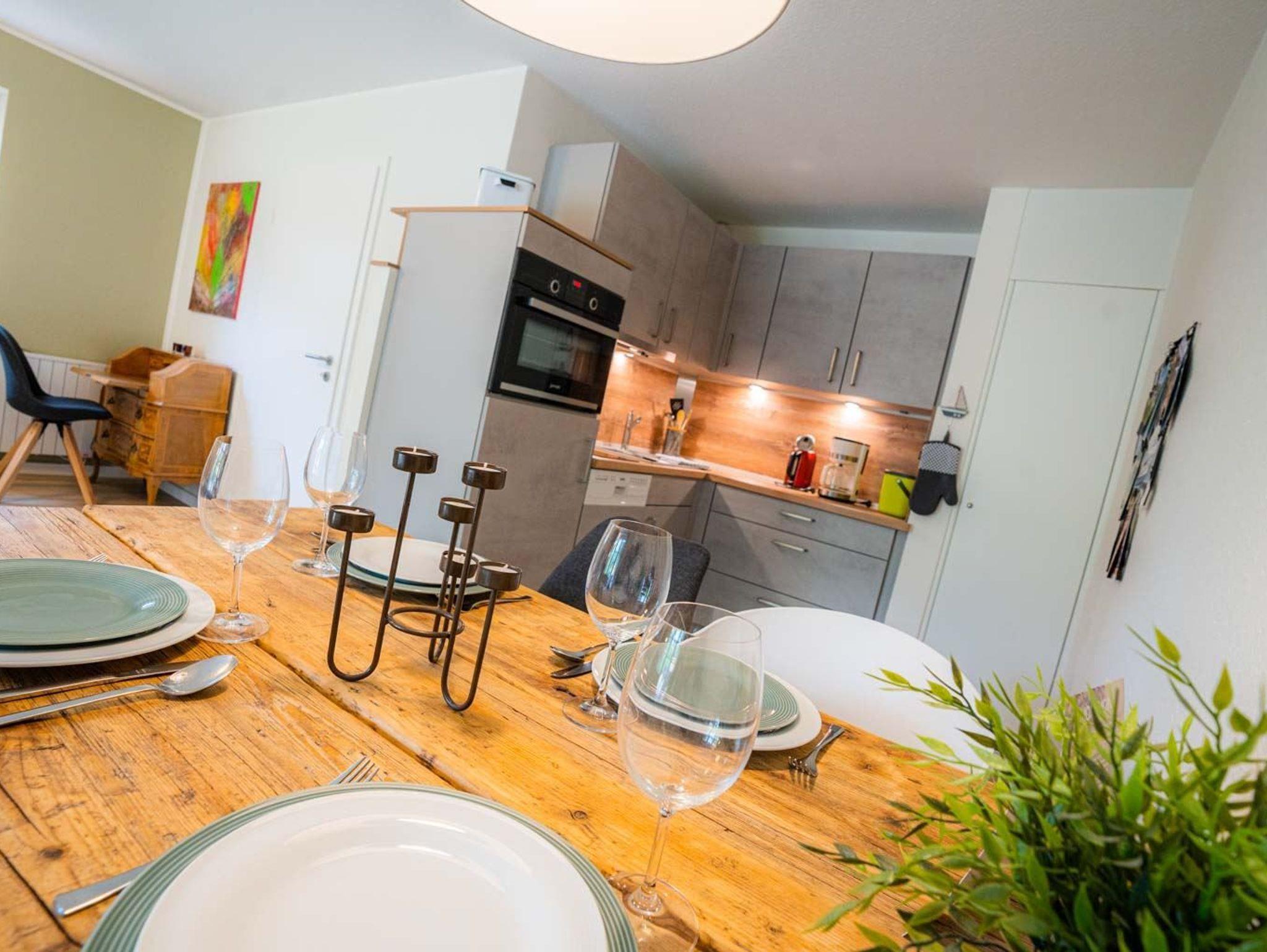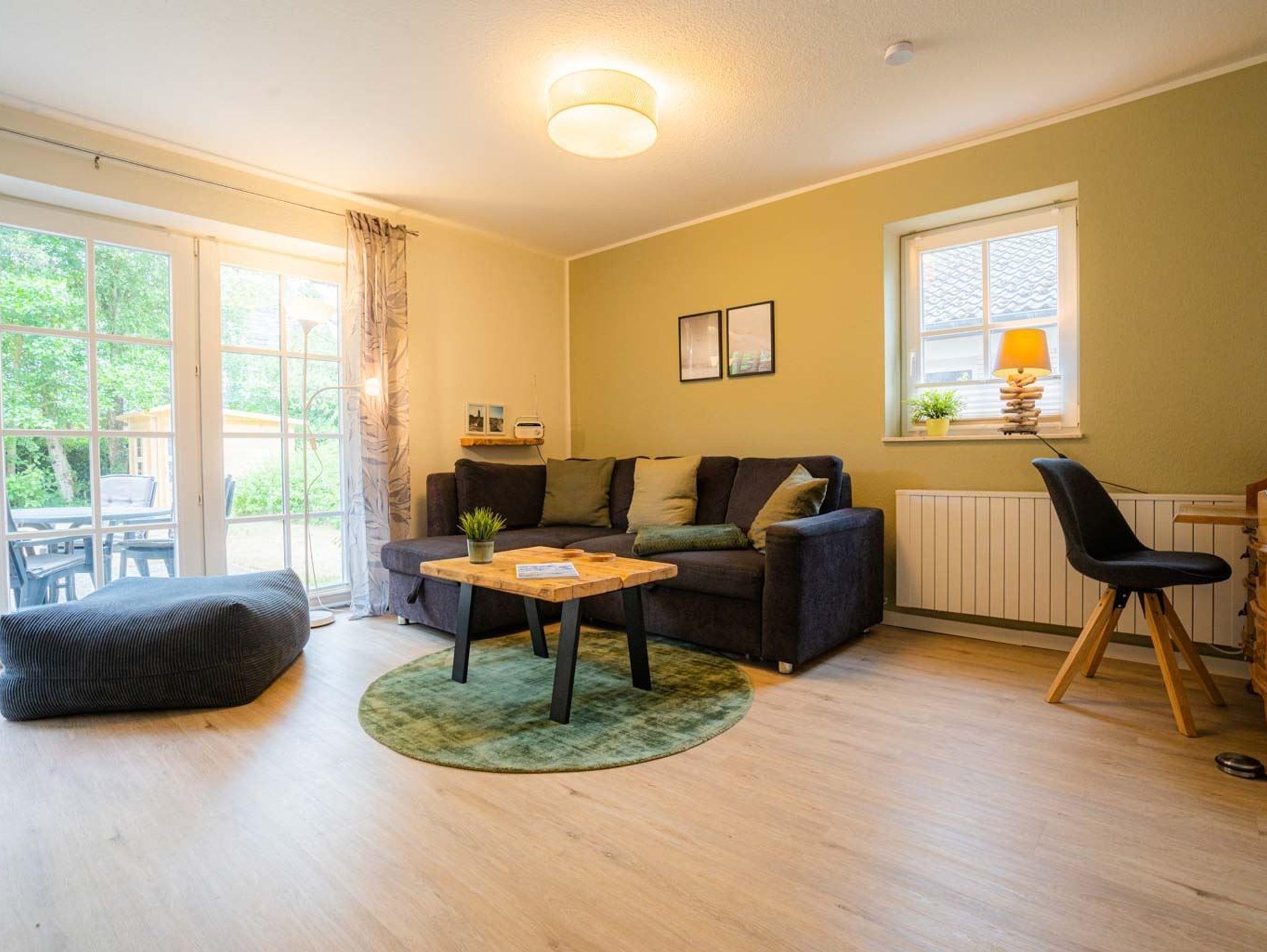 Wohnzimmer mit (ausklappbarem Schlaf-) Sofa (120x190cm), TV (Kabel), Radio mit CD-Player und Esstisch mit 4 Stühlen. Offene Küche mit Backofen, Geschirrspülmaschine und Kühlschrank mit Gefrierfach. Direkter Zugang zur möblierten Garten-Terrasse nach Westen.
