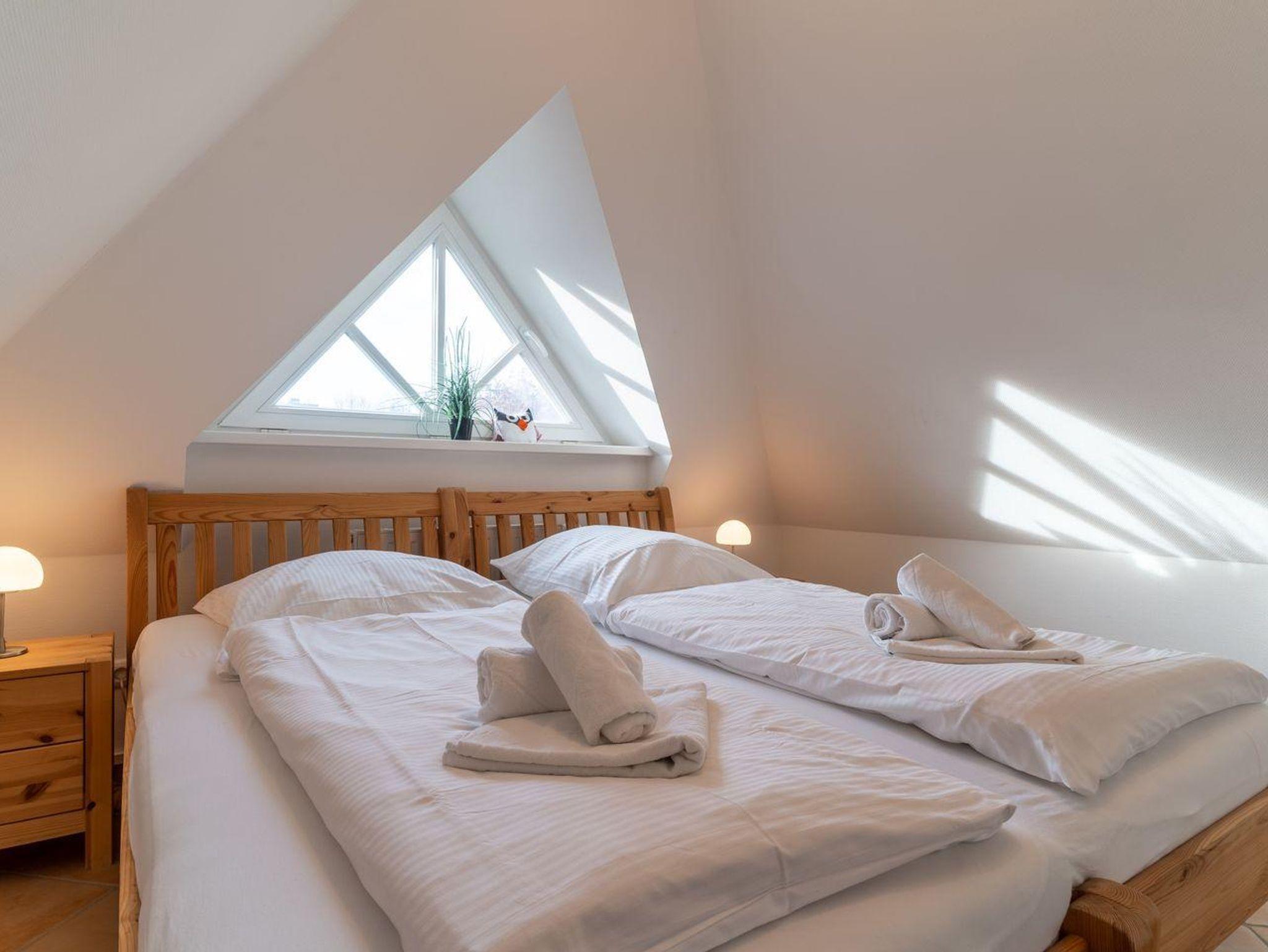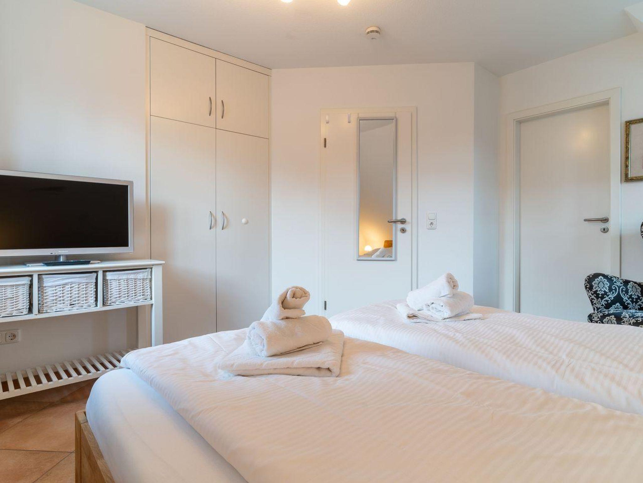 Eine elegante hölzerne Treppe führt Sie ins 1. Obergeschoss, wo zwei der insgesamt drei Schlafzimmer auf Sie warten. Das erste Schlafzimmer ist mit einem komfortablen Doppelbett (180x200 cm), einem zusätzlichen Fernseher und einem praktischen Einbauschrank ausgestattet. Im zweiten Schlafzimmer finden Sie zwei Einzelbetten (90x200 cm), ebenfalls mit Fernseher und Einbauschrank. Das Dachgeschoss bietet zwei weitere gemütliche Schlafplätze in zusammengestellten Einzelbetten (2x90x200 cm).