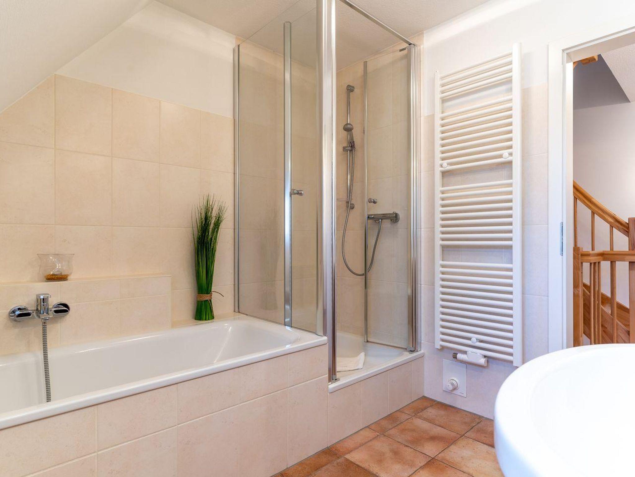 Besonders angenehm ist, dass das Haus über zwei moderne Bäder verfügt: Ein Vollbad mit Handtuchheizung und ein weiteres Bad mit ebenerdiger Dusche. Im Erdgeschoss finden Sie zudem einen umfangreich ausgestatteten Hauswirtschaftsraum, der keine Wünsche offen lässt.