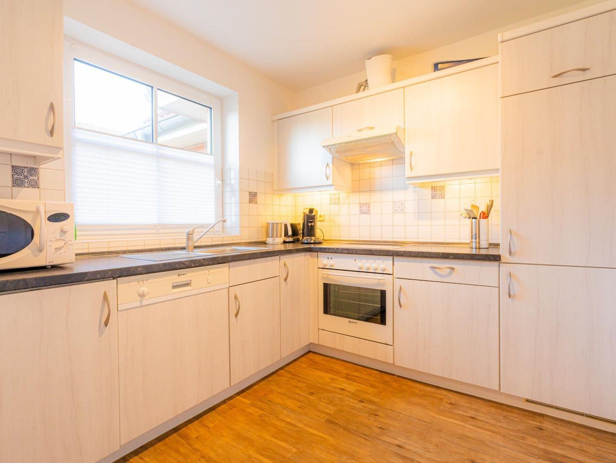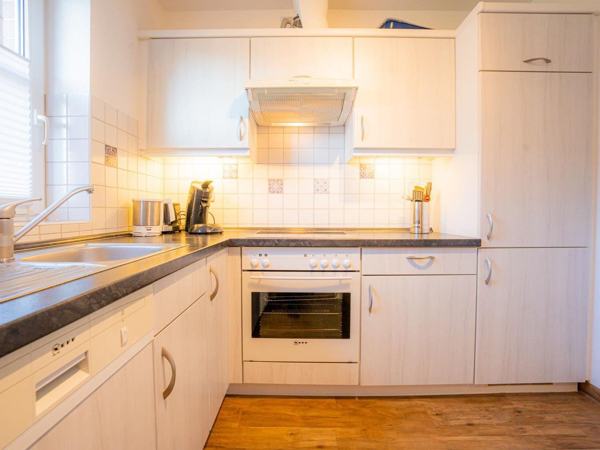 Separate Küche mit Backofen, Mikrowelle, Geschirrspüler, Kühlschrank mit Gefrierfach, Philips Senseo Kaffee-Kapselmaschine und Waschmaschine.