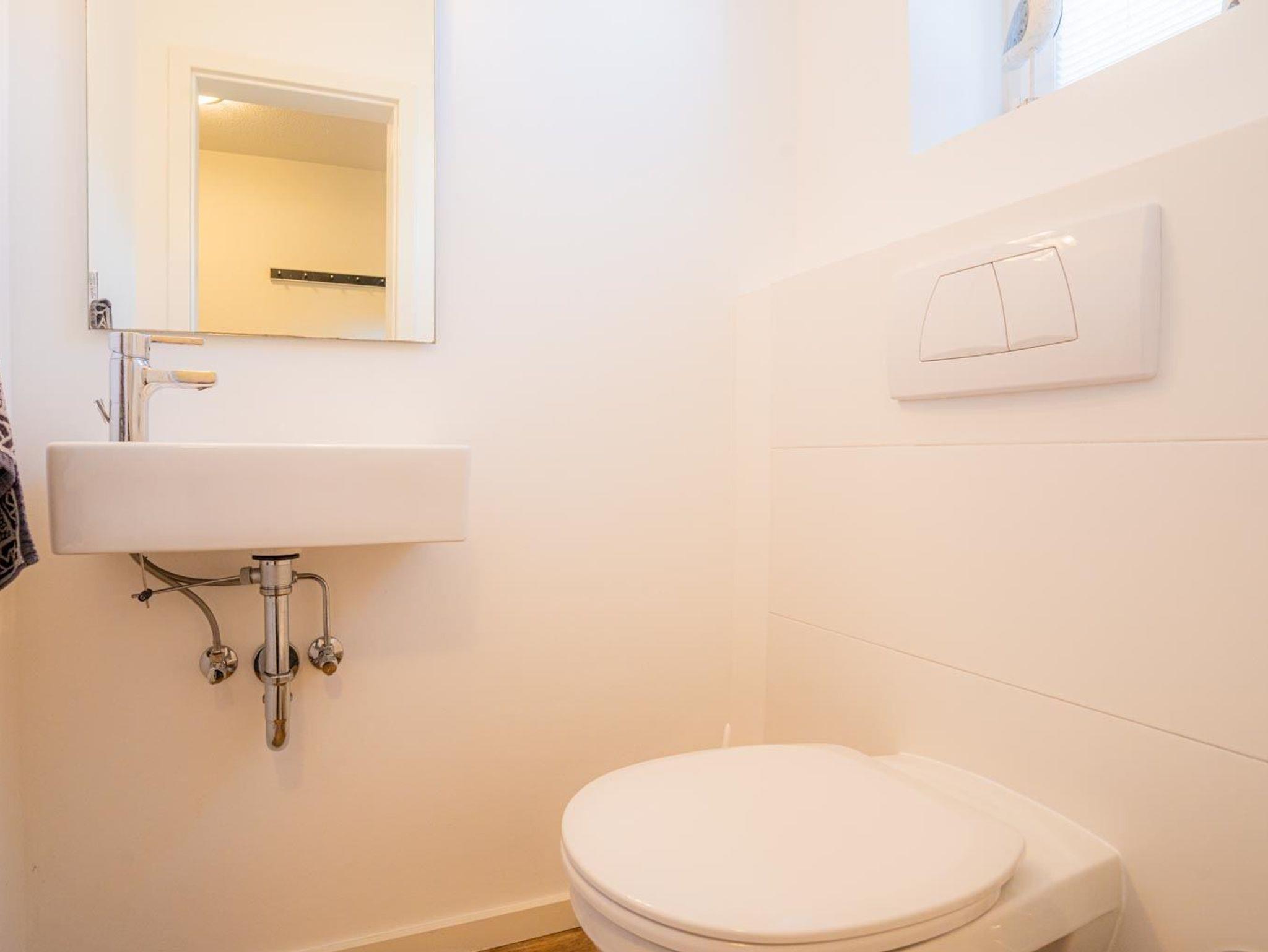 Flur mit Gäste-WC, Garderobe und Spiegel im Eingangsbereich. Abstellkammer mit kostenlos nutzbarem Kinderhochstuhl & Kinderreisebett, Staubsauger und Bügelset.