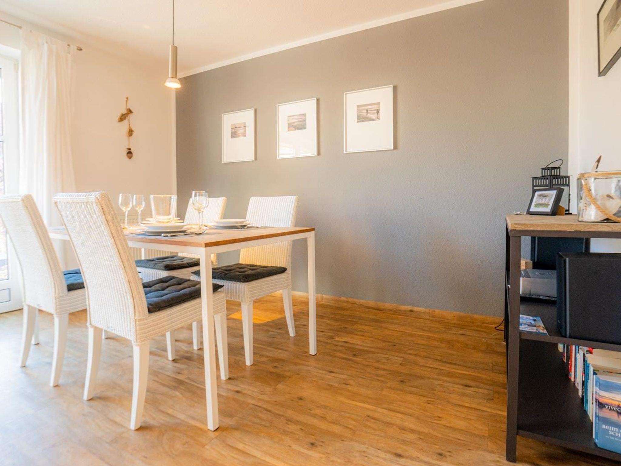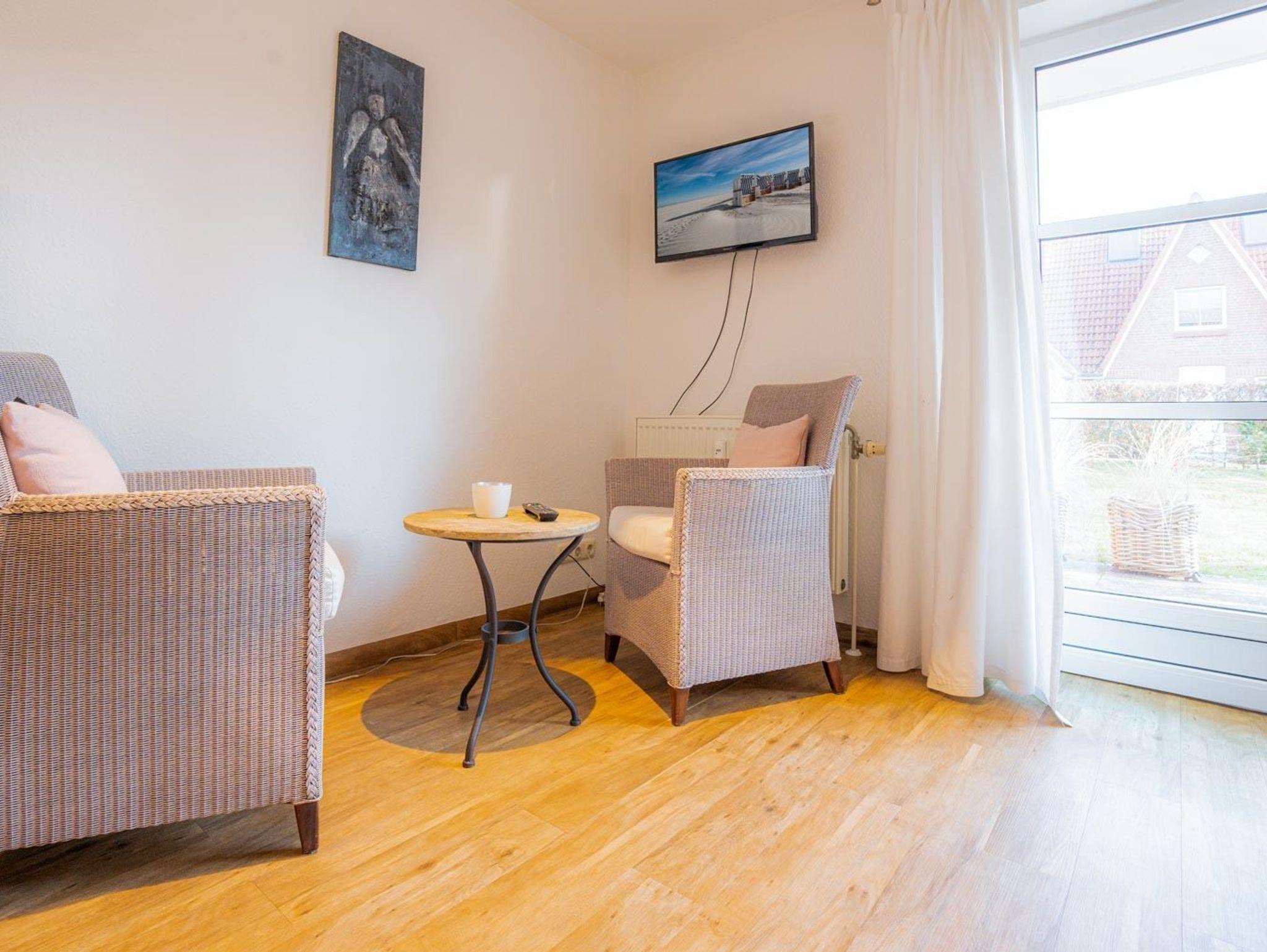 Wohnzimmer mit Eck-Ledersofa, zwei Sesseln, SMART-TV (Kabel), Radio und Esstisch mit 4 Stühlen. Direkter Zugang zur möblierten Gartenterrasse nach Südosten mit Strandkorb.