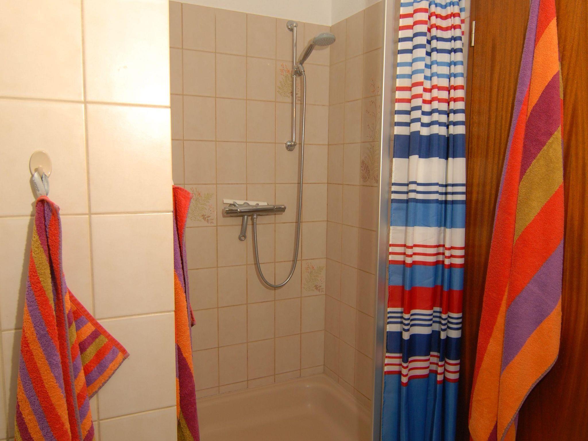 Bad: Dusche, Waschbecken, WC, Hocker, Kosmetikspiegel