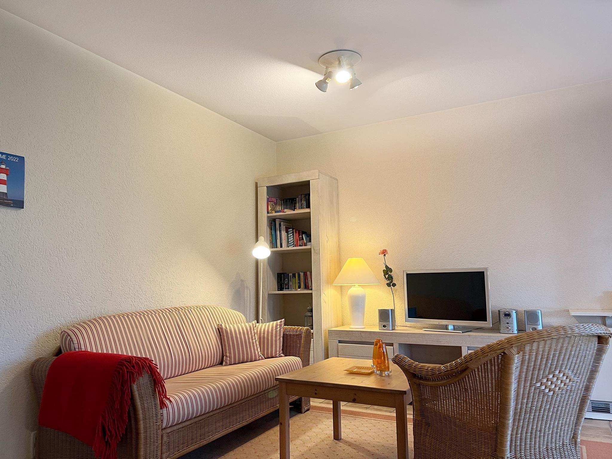 Wohnzimmer: Korbcouch, Couchtisch, 2 Korbsessel, 2 Stehlampen, Tischlampe, TV-Anrichte, Sat-TV, 2 Vitrinenschränke, Klappbett, Esstisch, 4 Stühle, E-Grill, Stereoanlage mit CD-Player, Nachtspeicherofen