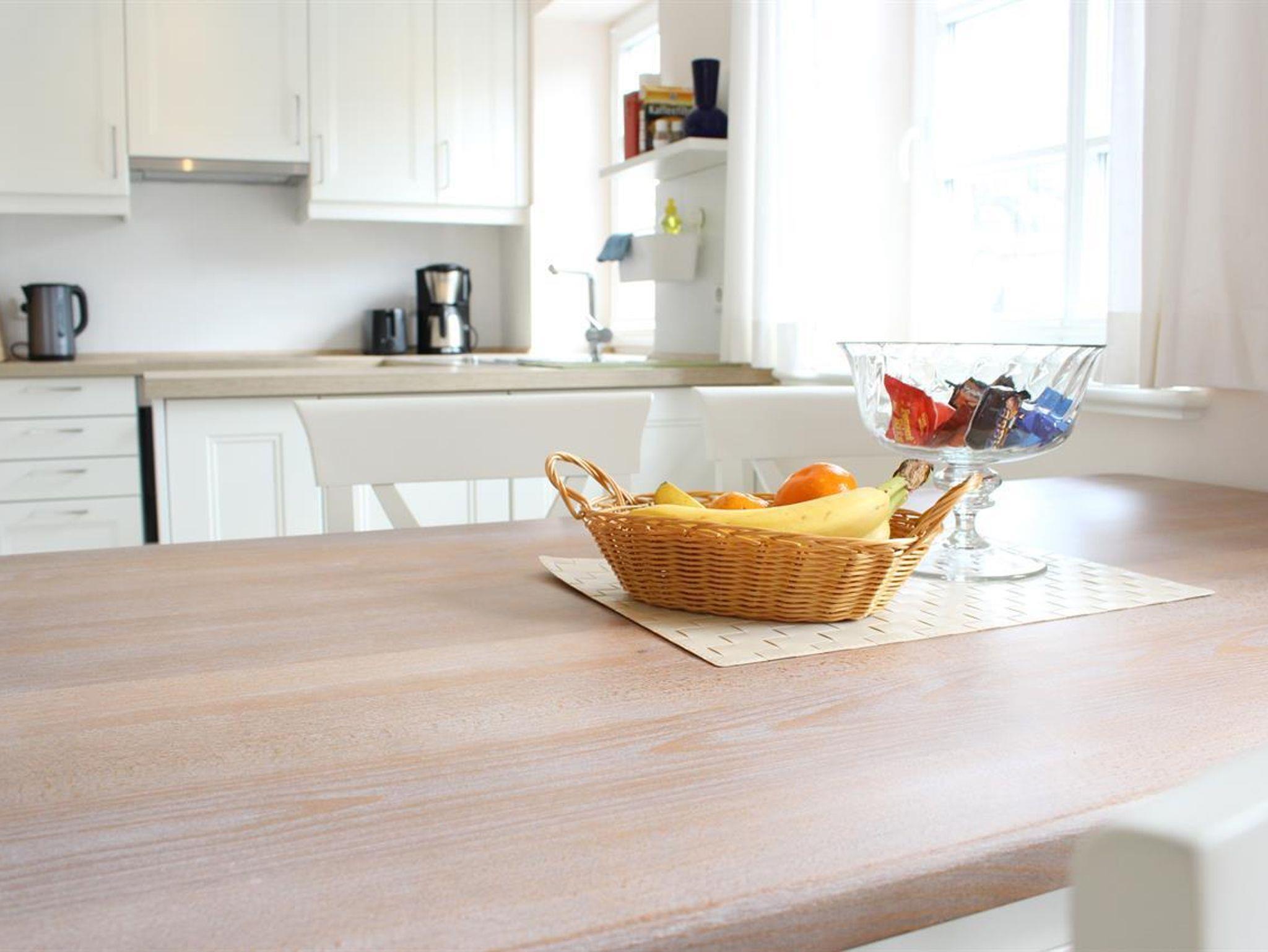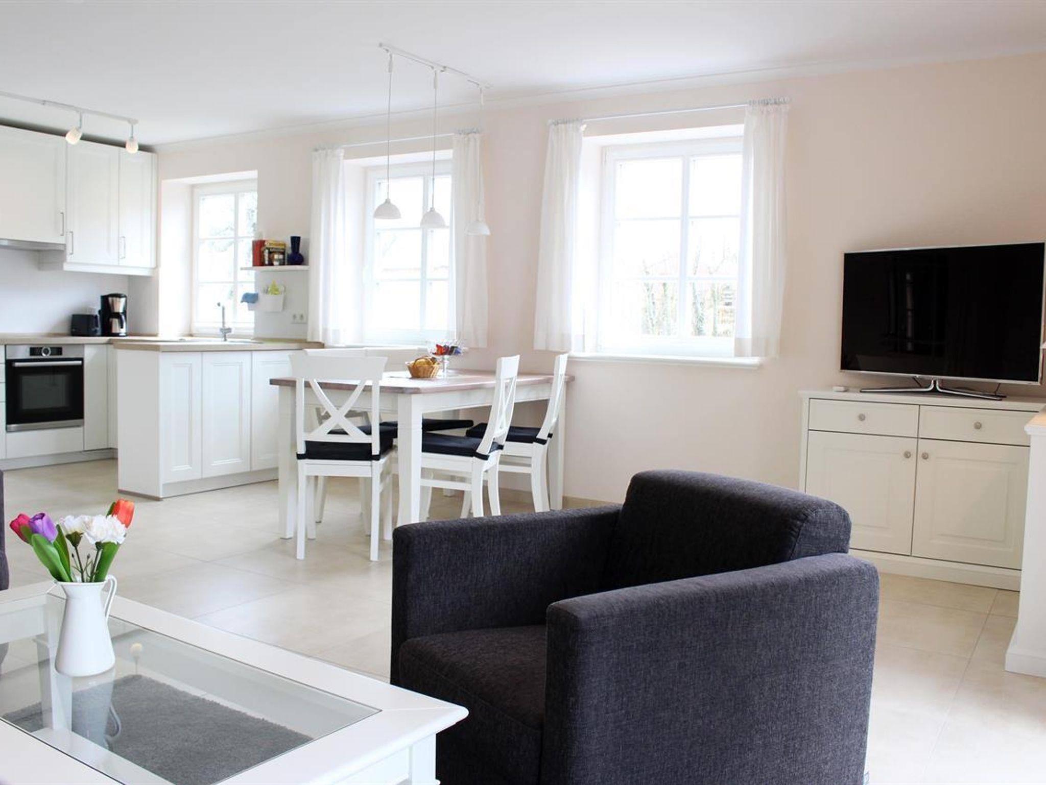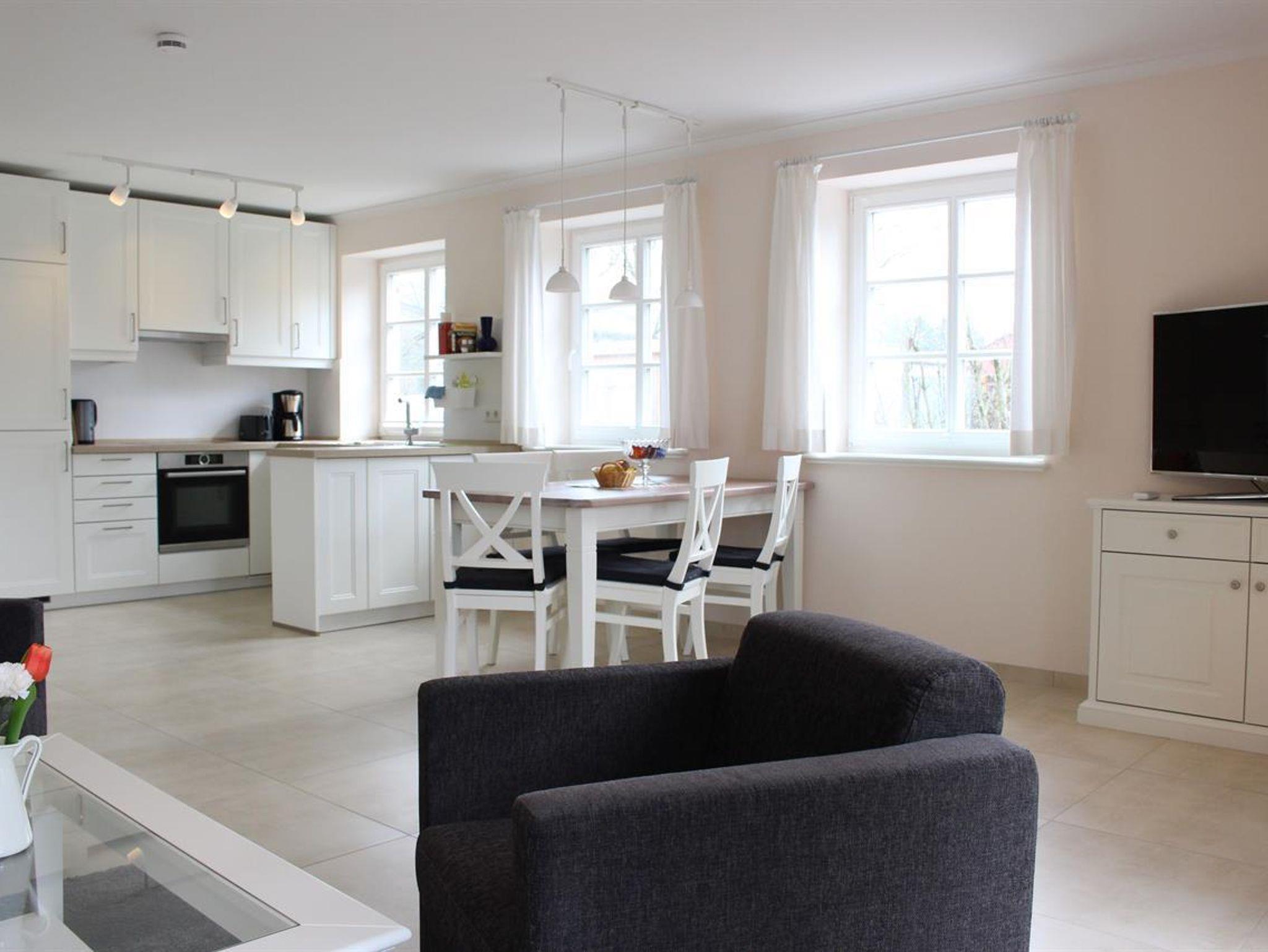 der Essbereich für bis zu 5 Personen geeignet. Blicken Sie aus den großen Panoramafenstern, oder genießen Sie die Sonne im Strandkorb auf der Südterrasse.