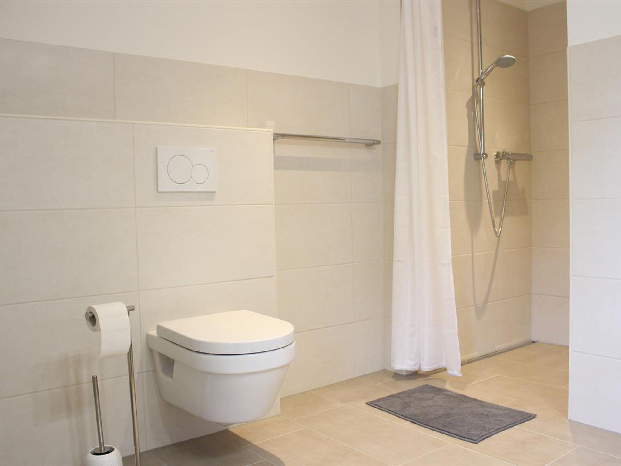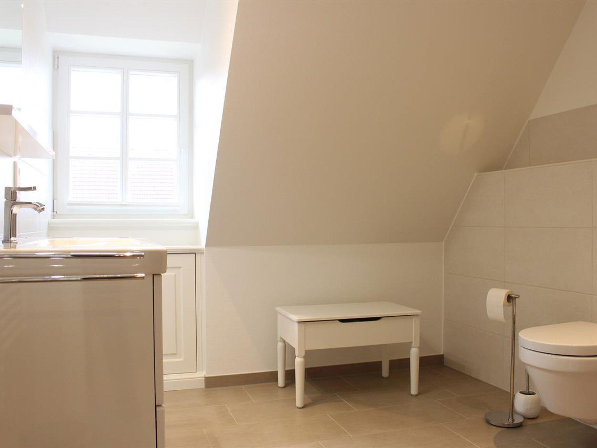 Das große Badezimmer mit ebenerdiger Dusche (kleine Duschkante), Waschtisch mit beleuchtetem Spiegel und WC befindet sich im Obergeschoss.