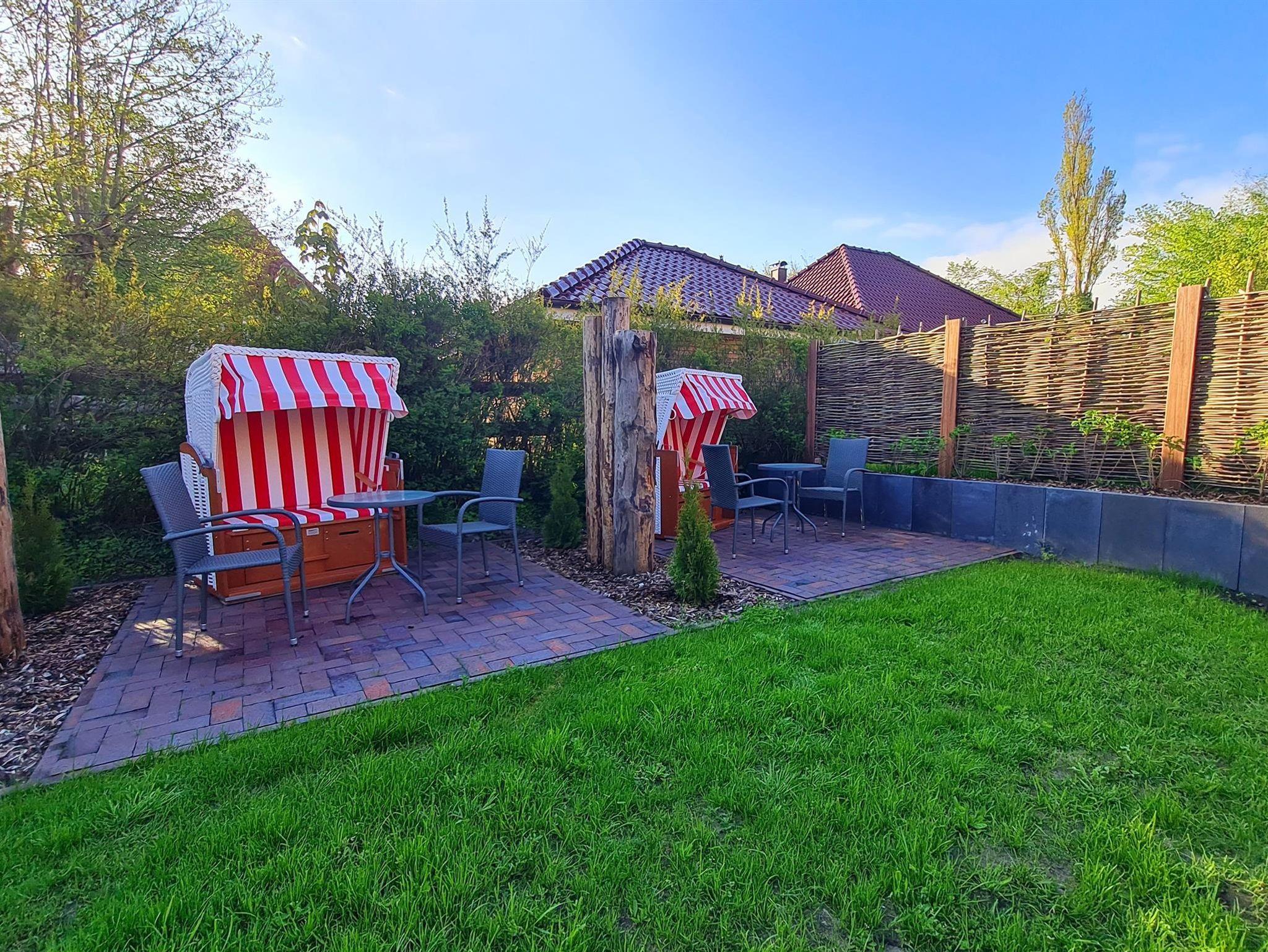 Eine zur Wohnung gehörende kleine Terrasse im hinteren Garten mit Strandkorb, Tisch und zwei Stühlen bietet einen Rückzugsort, wenn es mal nicht zum Strand gehen soll. Fahrräder können in einem Radständer oder auch in einem kleinen Fahrradschuppen abgestellt werden. Eine Lademöglichkeit für E-Bikes ist im Fahrradschuppen ebenfalls vorhanden. In der Wohnung und auf der Terrasse ist WLAN möglich. Ferner gehört zu der Ferienwohnung ein Stellplatz auf dem Grundstück.