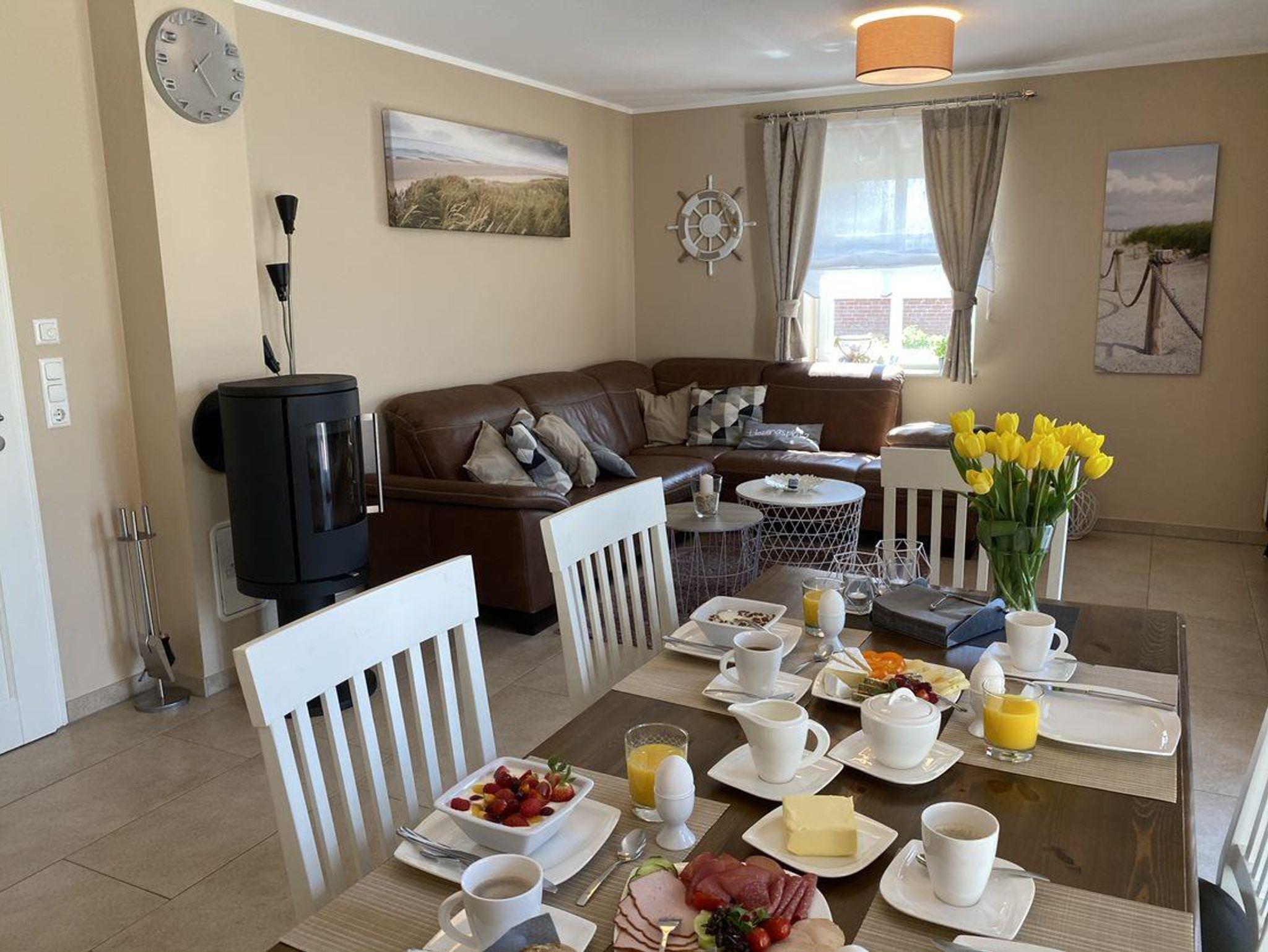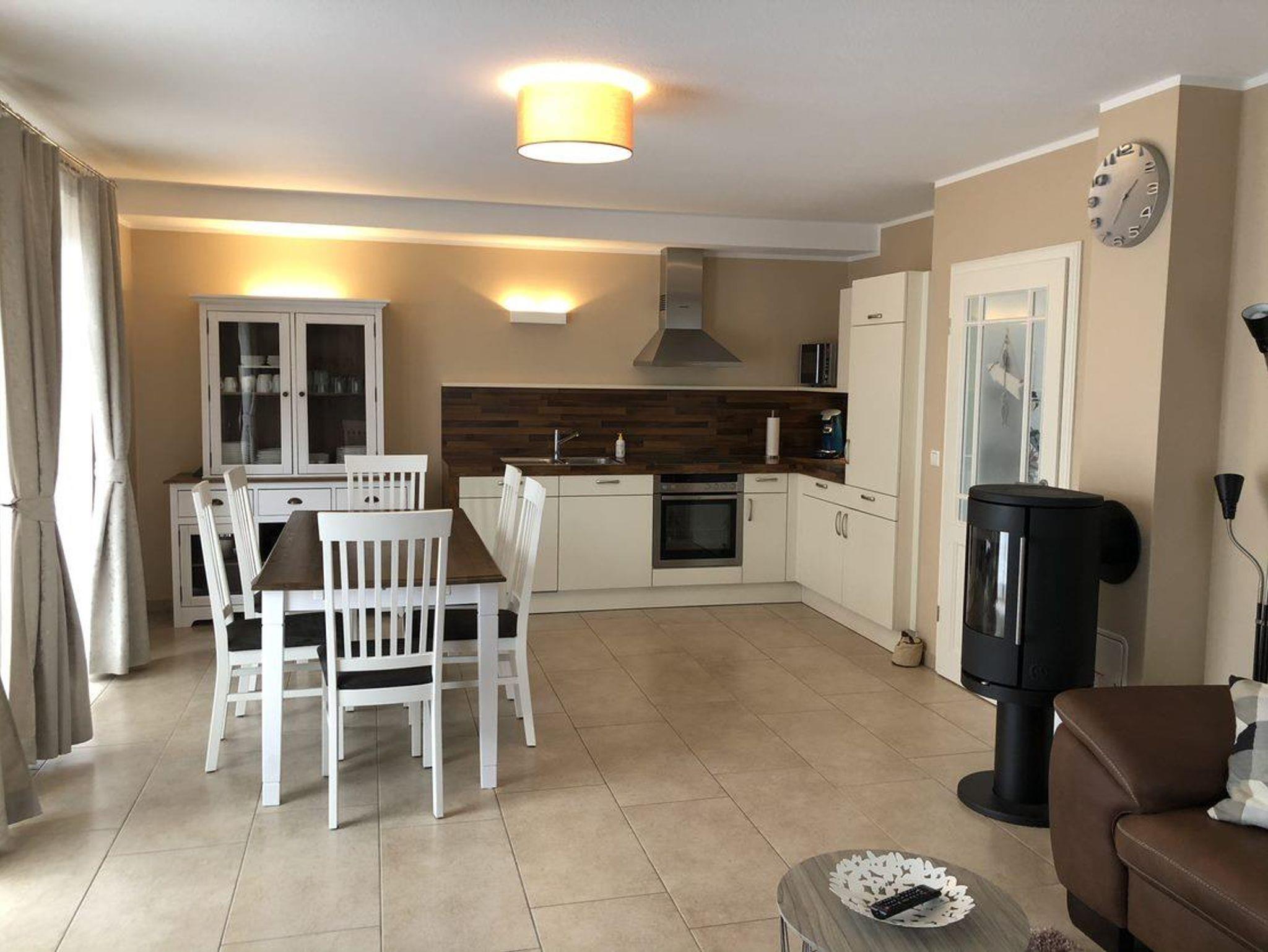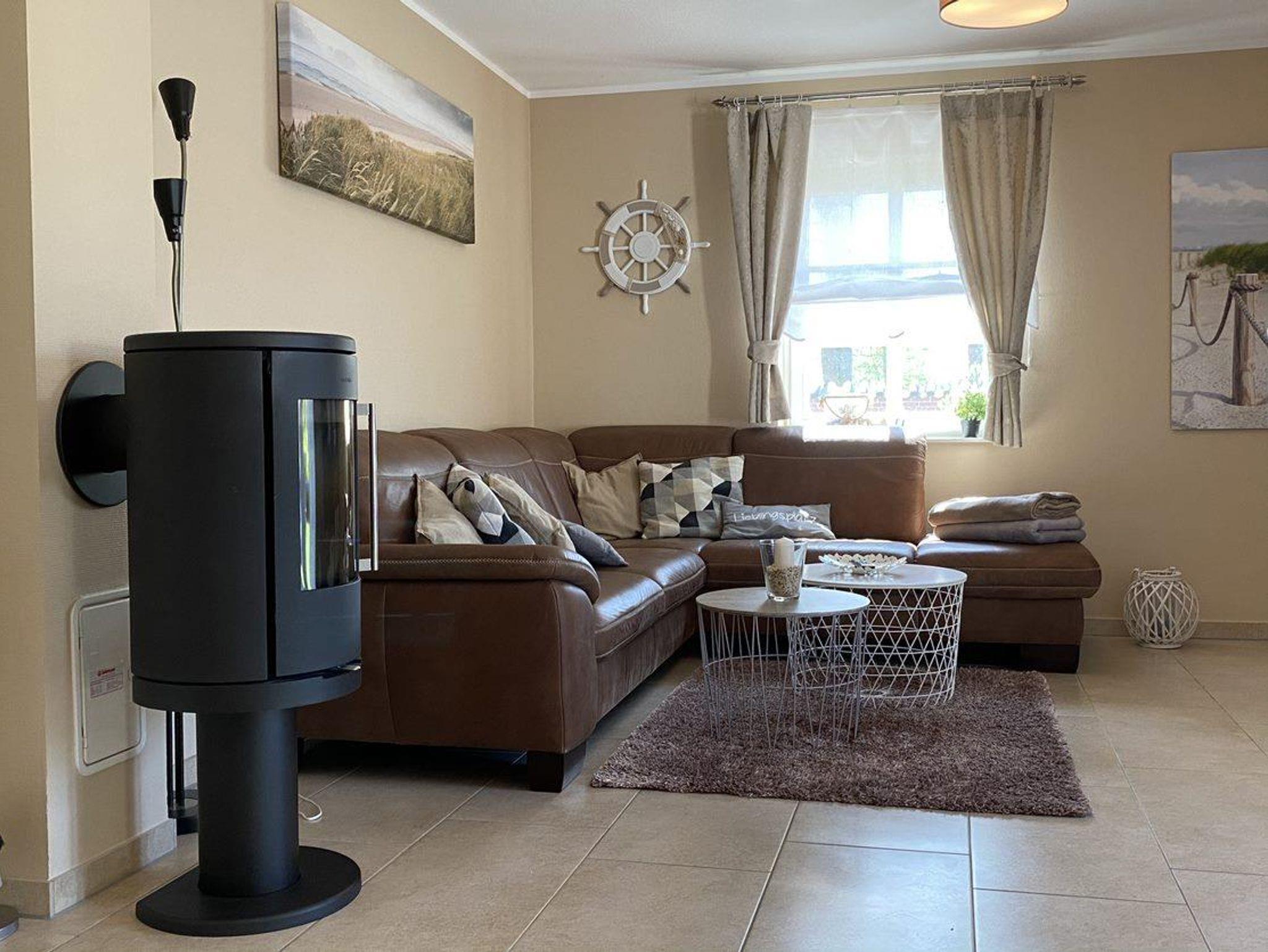 Im lichtdurchfluteten Wohn-/Eßbereich lädt eine gemütliche Leder-Couch sowie an kalten Tagen, ein gemütlicher Kamin zum Verweilen ein.