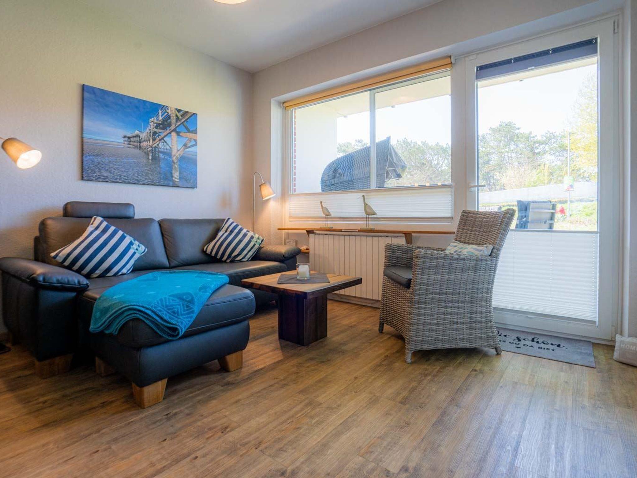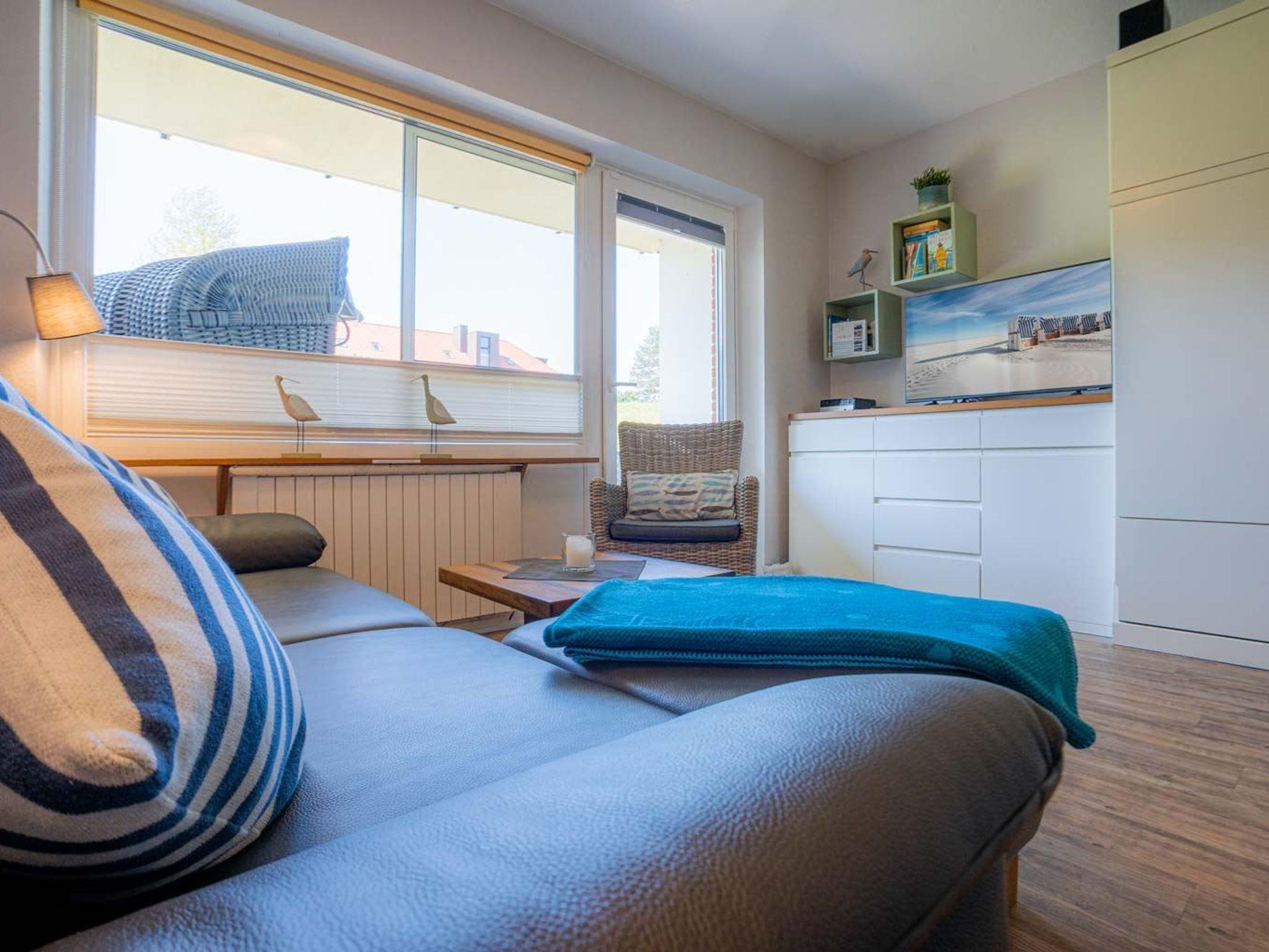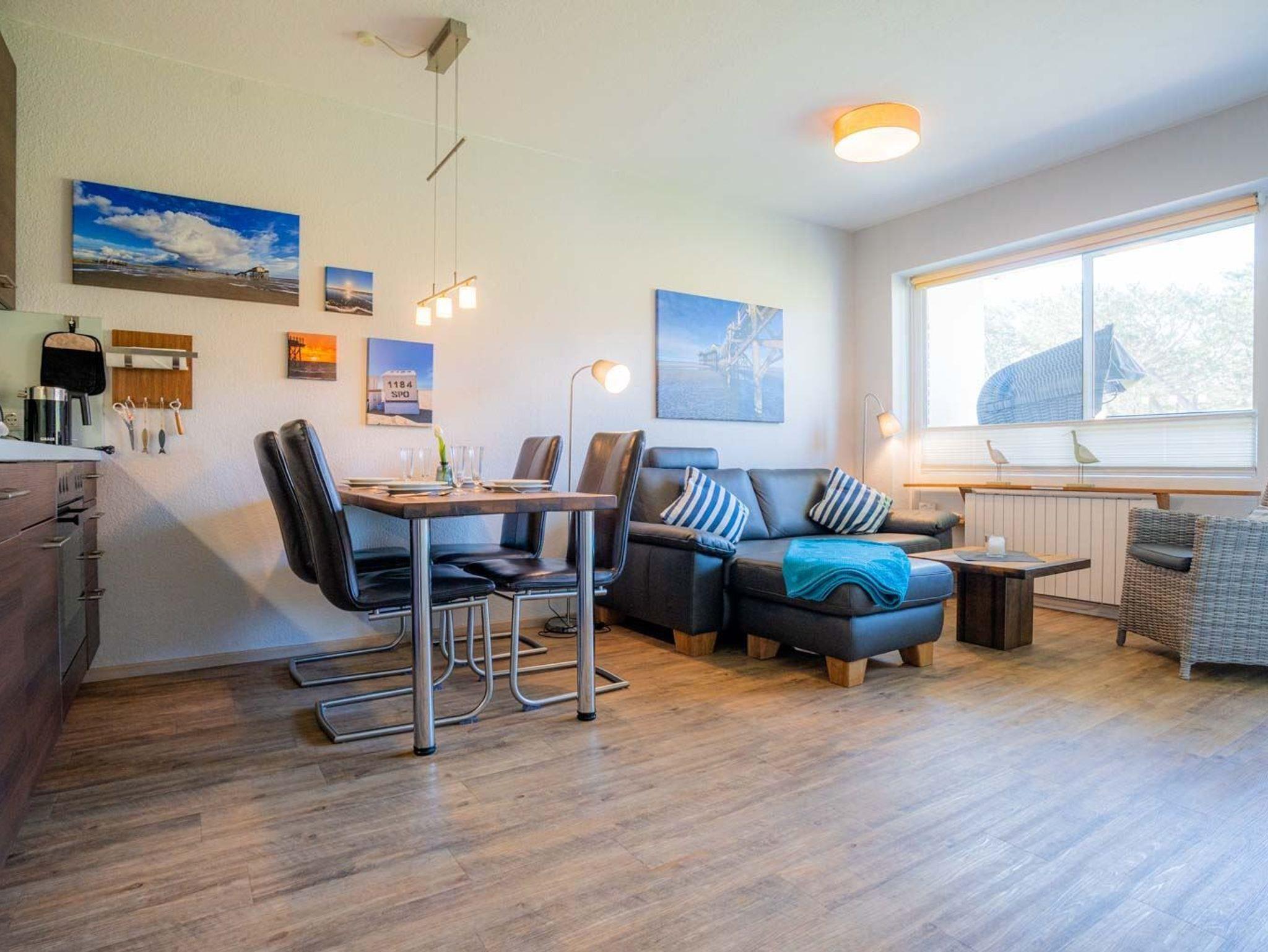 Freundlich eingerichtetes Wohnzimmer mit ausklappbarem Schrank-Bett (160x190cm), Sofa (3er), 1 Sessel mit Hocker, TV (Sat), Radio und Esstisch mit 4 Stühlen. Direkter Zugang zur möblierten Garten-Terrasse nach Südwesten mit Strandkorb. Moderne offene Küche mit Backofen, Kühlschrank mit Gefrierfach und Geschirrspüler.