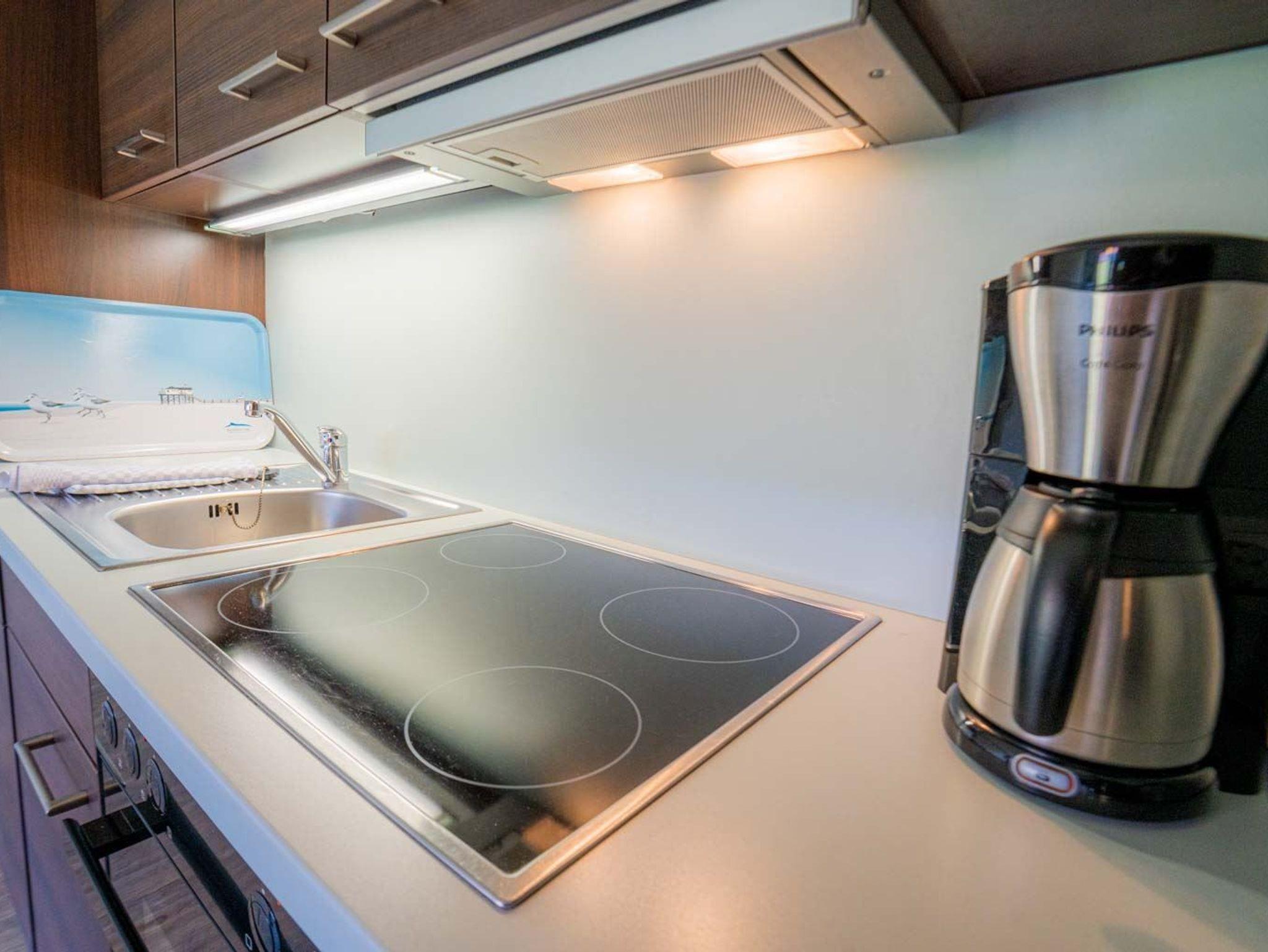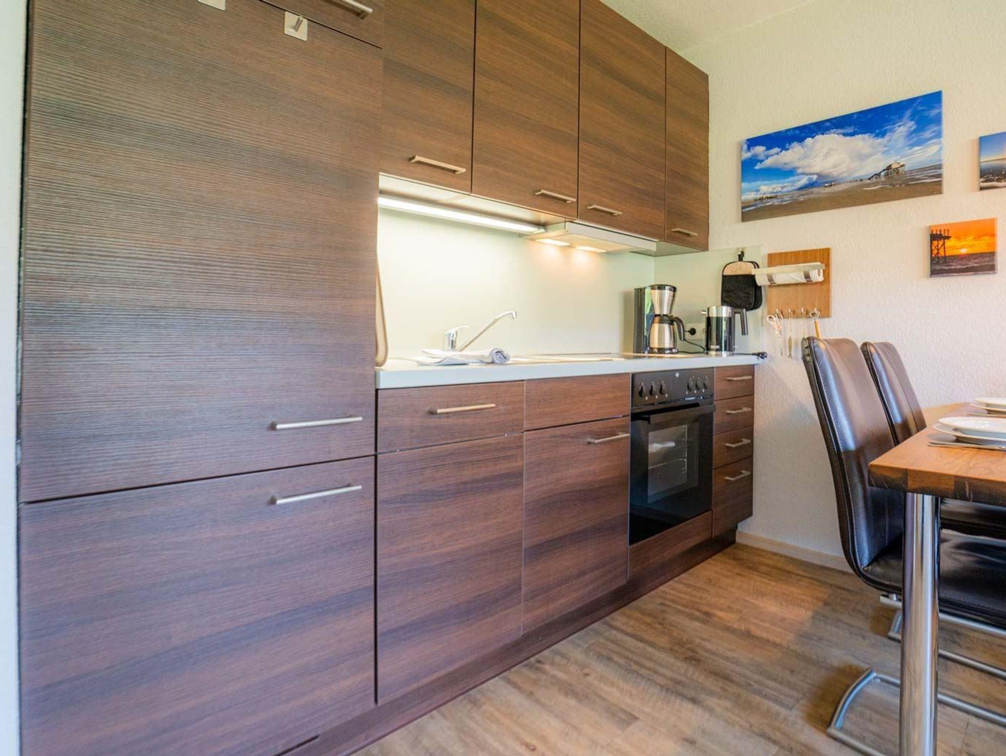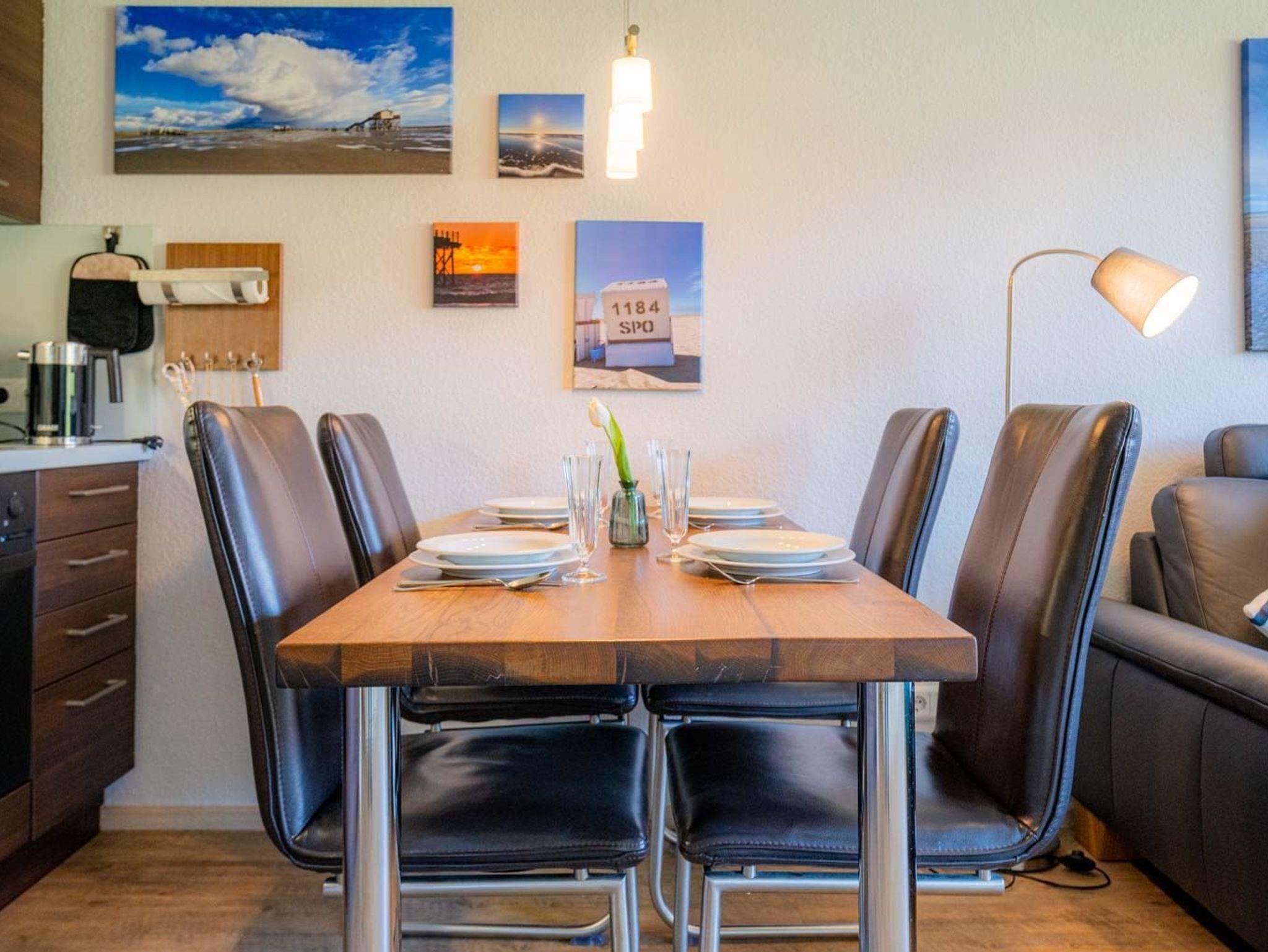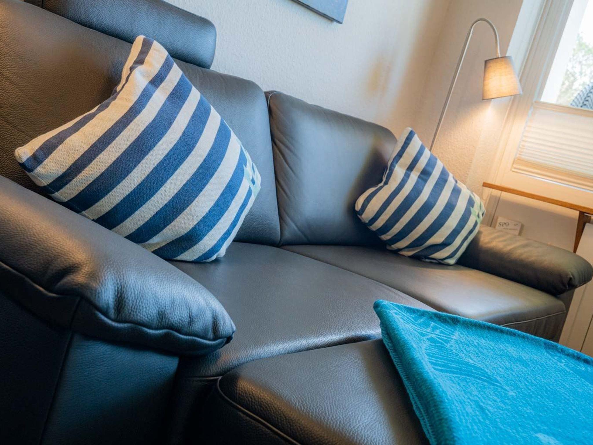 Freundlich eingerichtetes Wohnzimmer mit ausklappbarem Schrank-Bett (160x190cm), Sofa (3er), 1 Sessel mit Hocker, TV (Sat), Radio und Esstisch mit 4 Stühlen. Direkter Zugang zur möblierten Garten-Terrasse nach Südwesten mit Strandkorb. Moderne offene Küche mit Backofen, Kühlschrank mit Gefrierfach und Geschirrspüler.