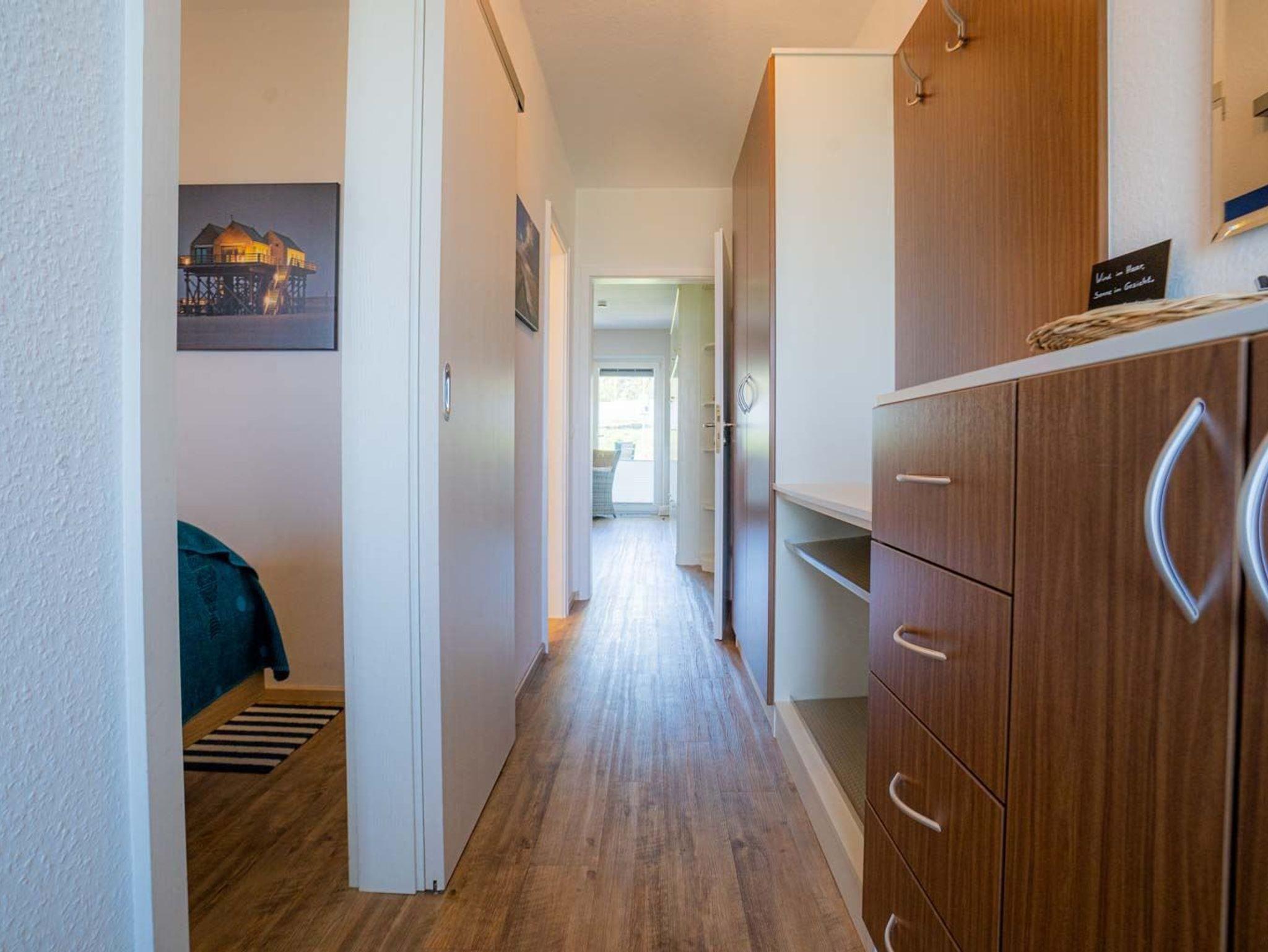 Flur mit Garderobe, Kommode und Spiegel im Eingangsbereich.