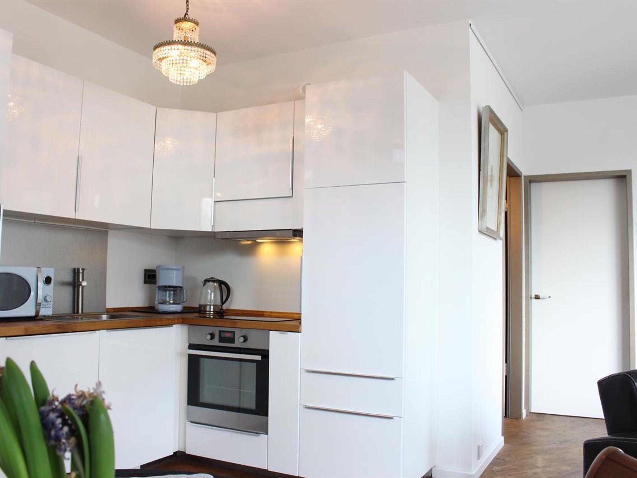 Die Einbauküche mit Backofen, Spülmaschine, Kühlschrank und Tiefkühlfach ist in den Wohnraum integriert.