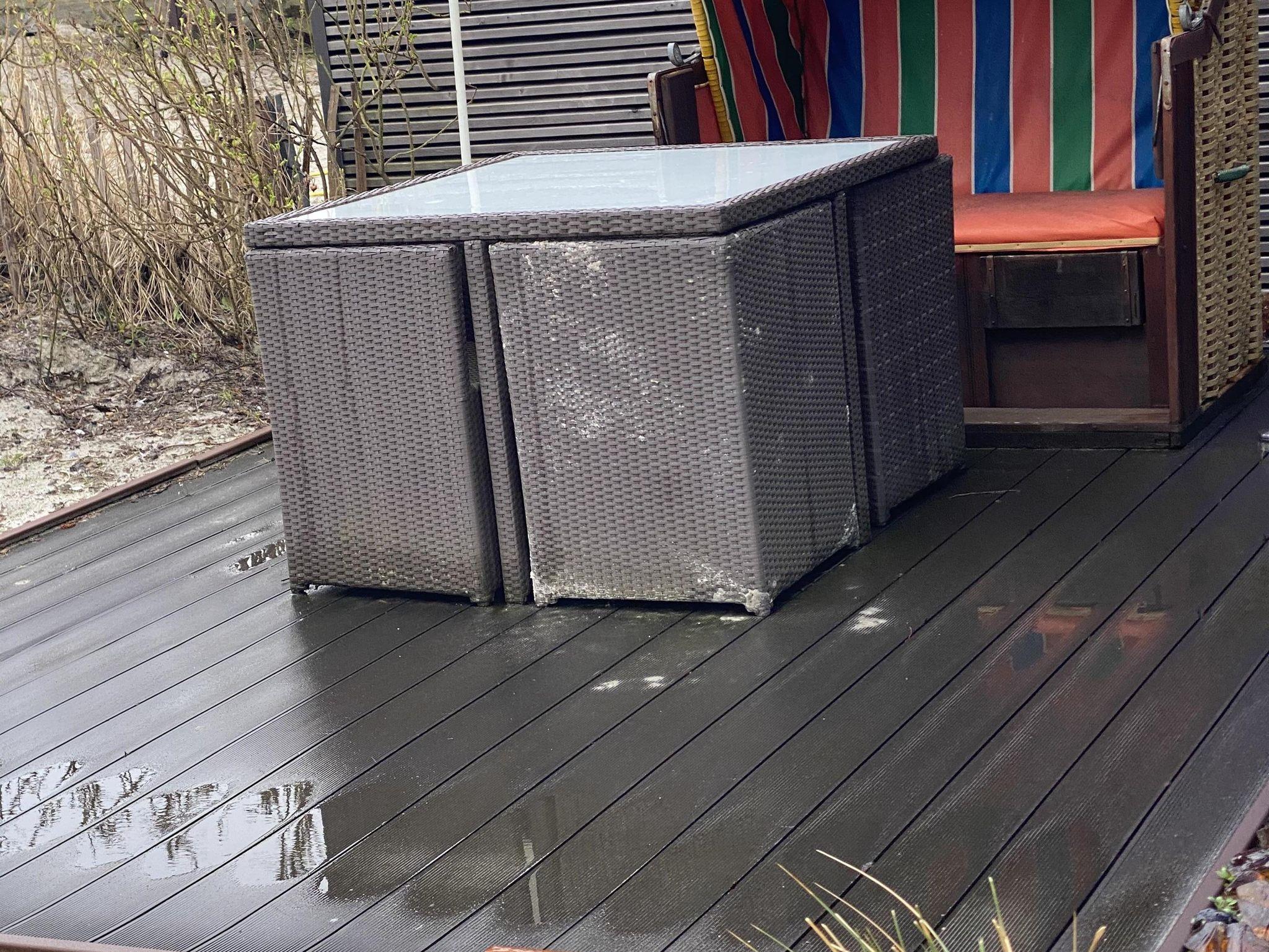 • möbilierte Terrasse mit Strandkorb, Gartenliegen, Sonneschirm