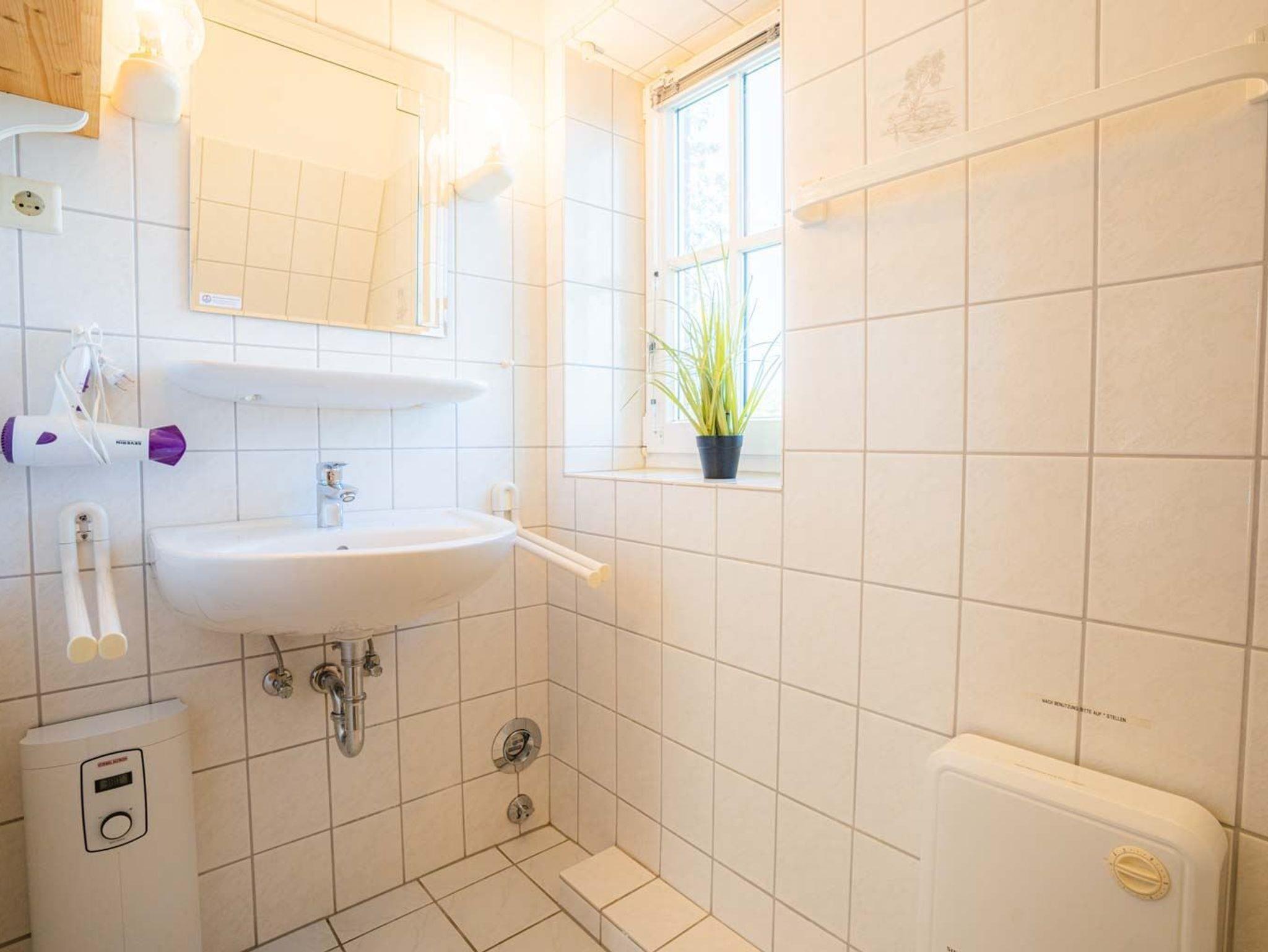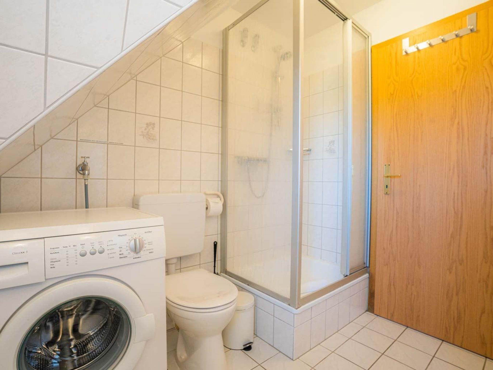 Badezimmer (Duschbad) mit Dusche, WC, Waschmaschine gegen Gebühr, Tageslicht und Föhn.