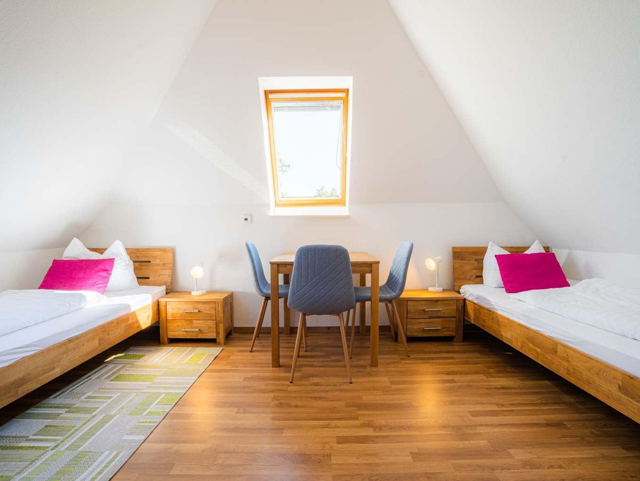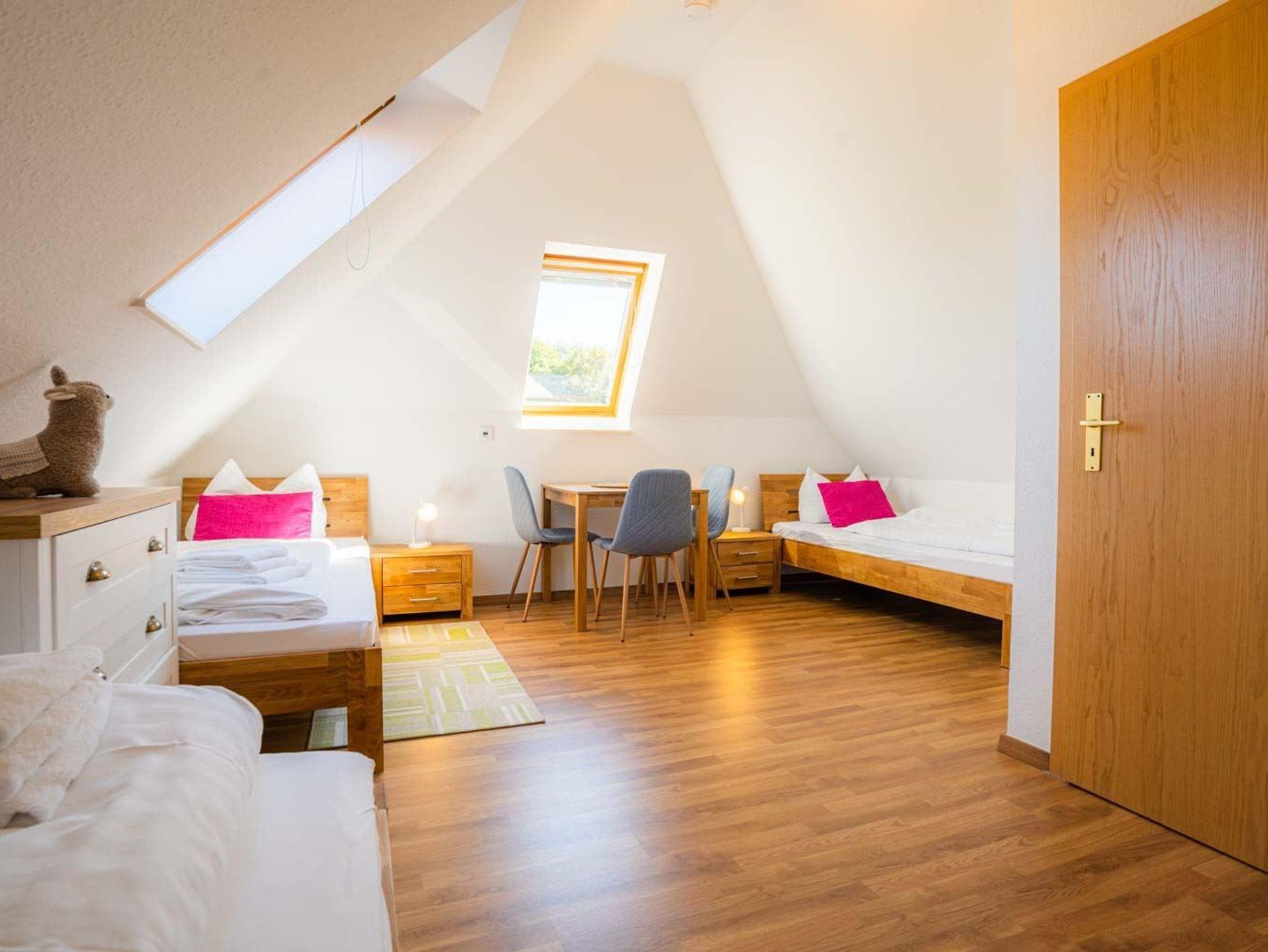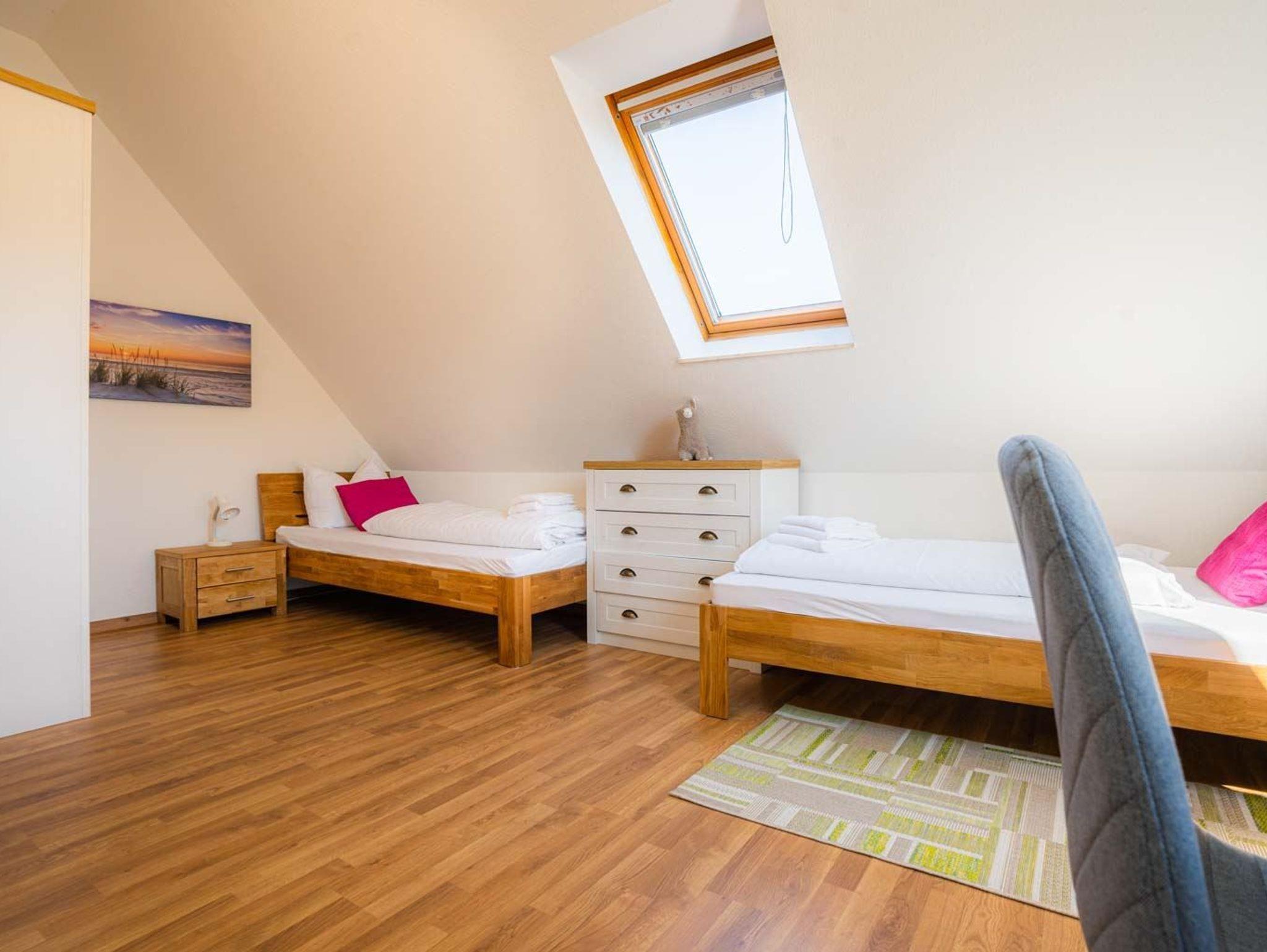 2. Schlafzimmer mit 3 Einzelbetten (je 90x200cm), Kleiderschrank mit Bügelset, Kommode und Tisch mit 3 Stühlen.